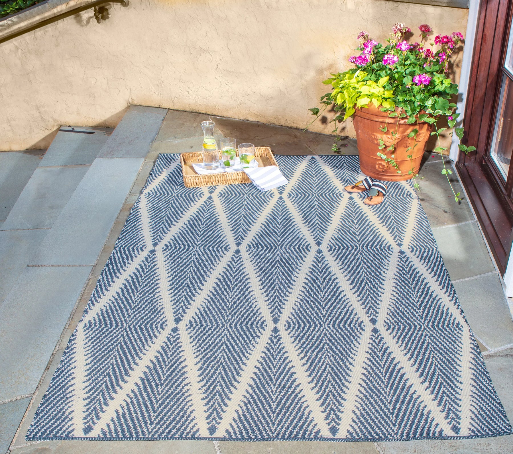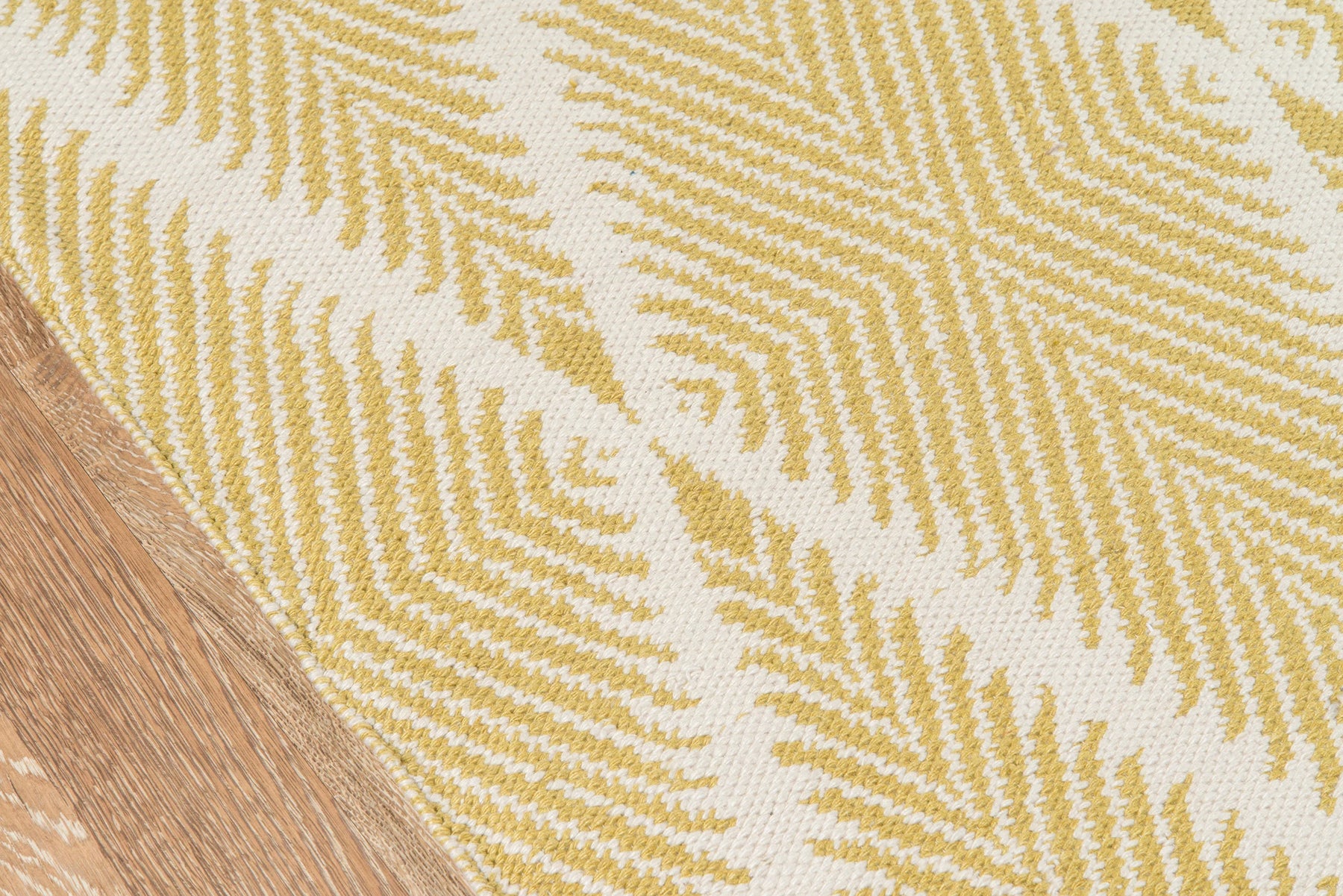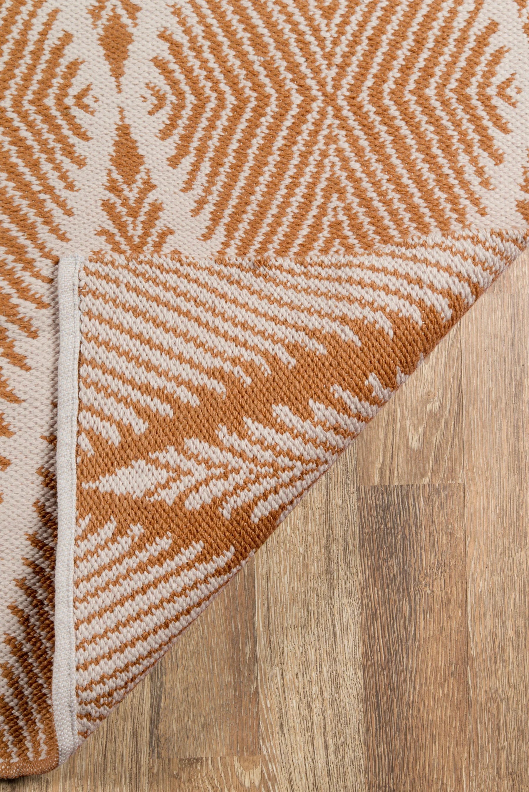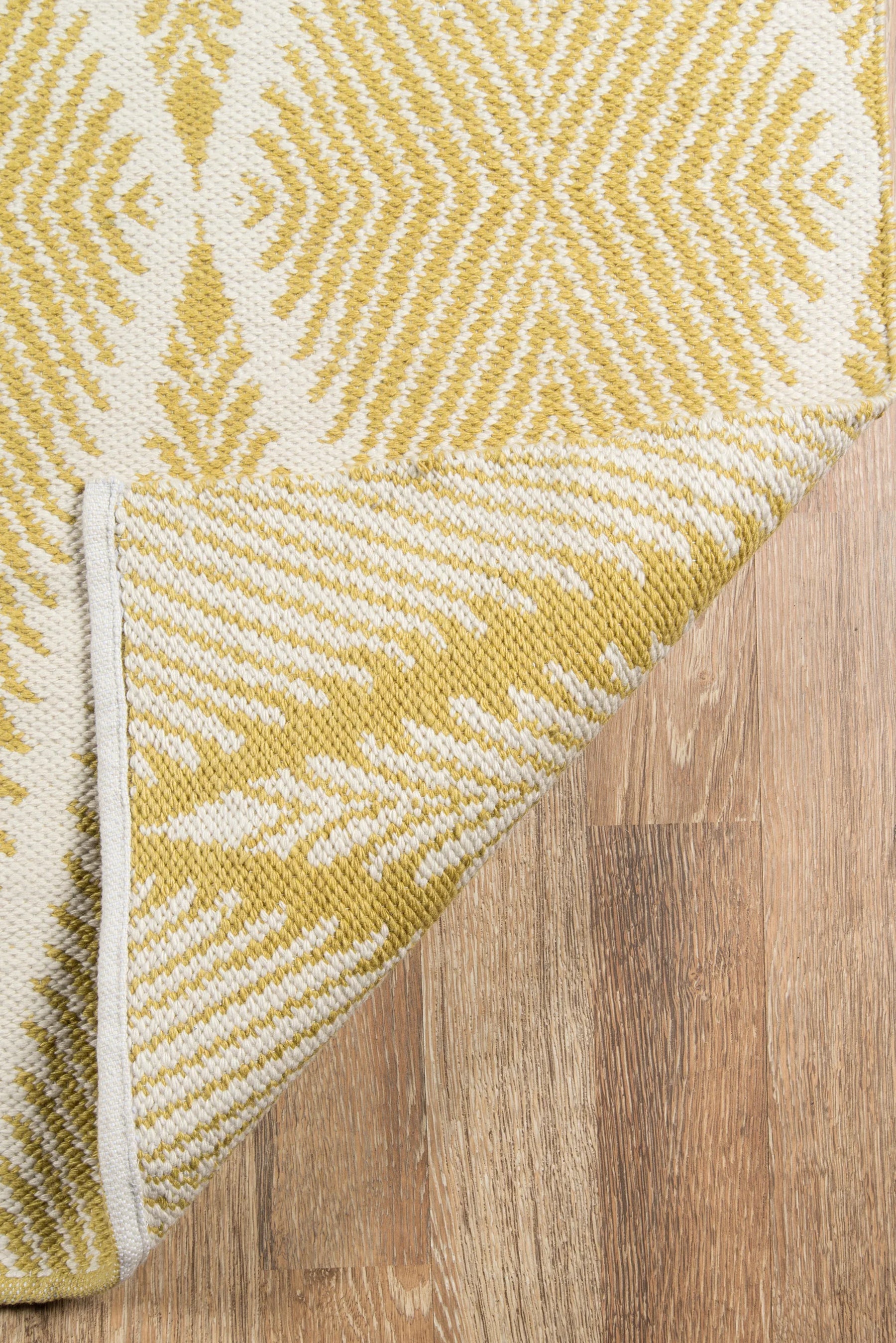 Traditional patterns take new form in the tribal design of this decorative area rug. Each rug is defined by an elongated diamond trellis pattern, filled with stripes in bold shades of black, blue, yellow and orange. Synthetic fibers make each hand-woven floorcovering suitable for well-travelled floors throughout the home.