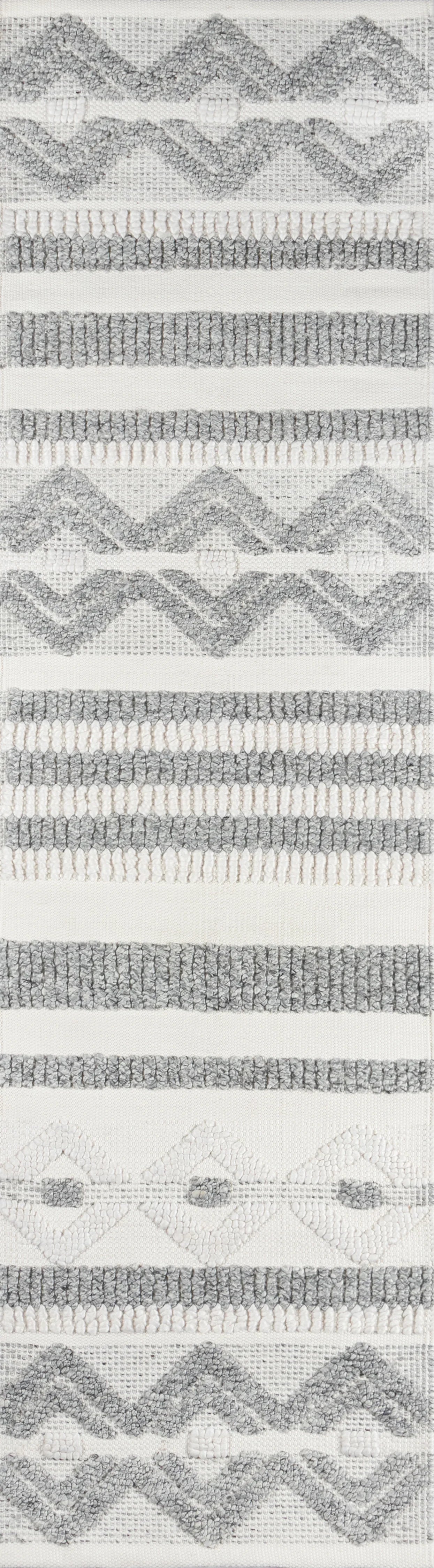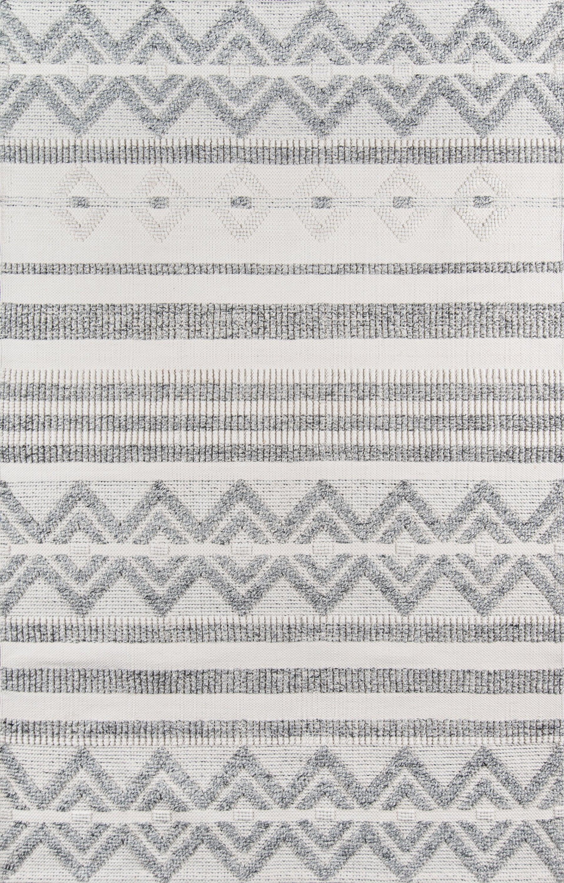 A tribal pattern in a minimalist color palette gives this eclectic area rug understated appeal. Alternating between linear stripes and concentric diamond shapes, relaxed ivory and grey shades keep the chic design casual under coffee tables, couches and other interior furnishings. Crafted for comfort in every room of the house, the decorative floorcovering is hand tufted from high-traffic PET fibers that stand up to the standard day-to-day routine.