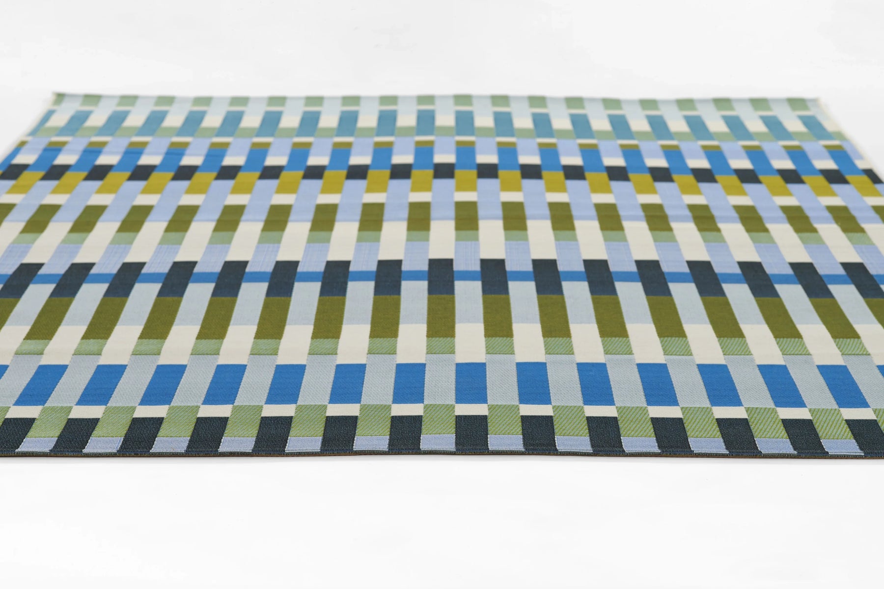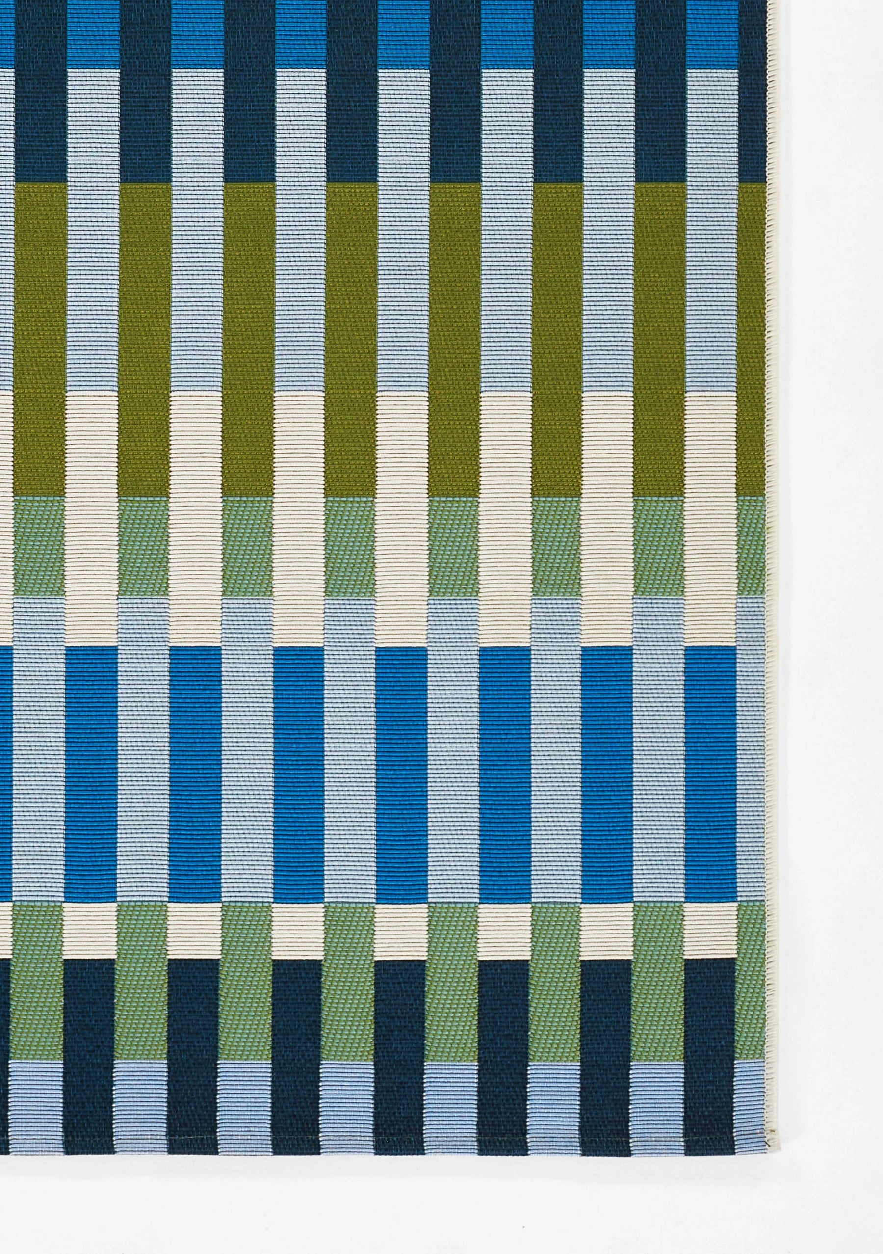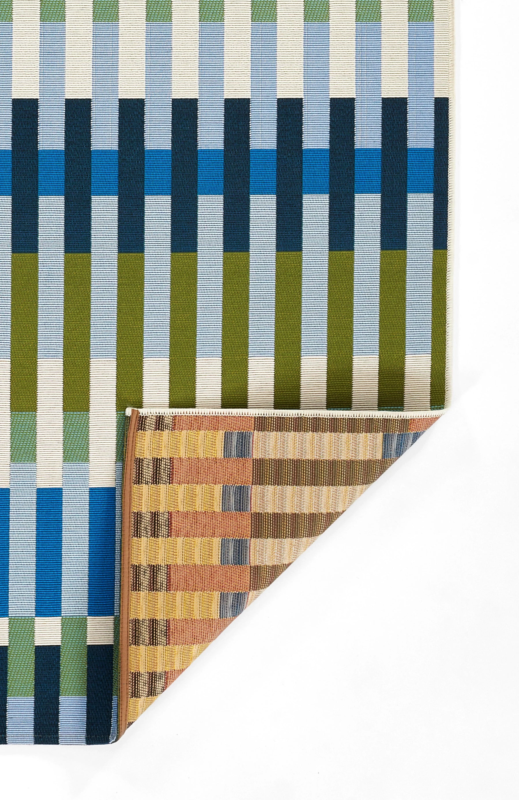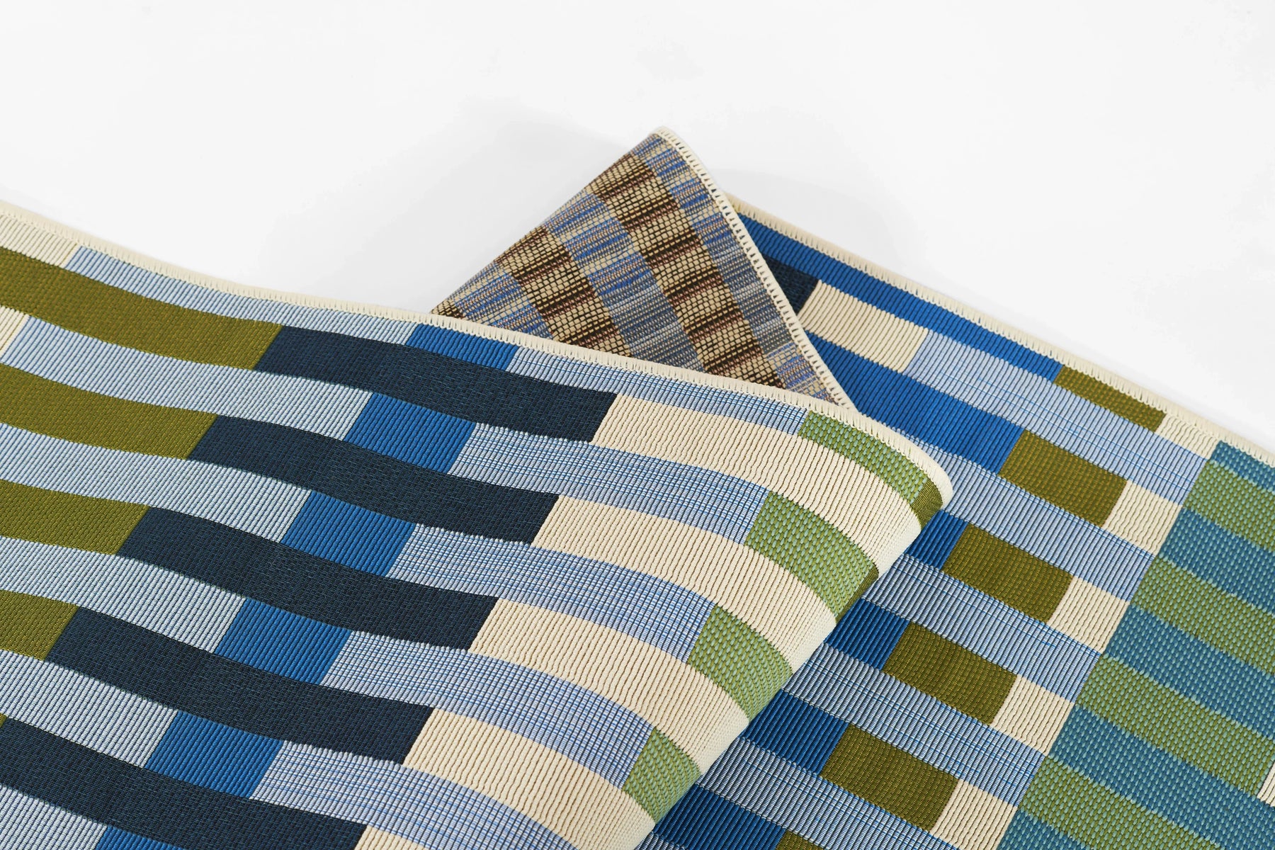 This statement rug features a striking geometric pattern with alternating shades of blue and green, with abstract lines and geometric stripes. The block-style design creates a sense of movement and depth, making it a bold and eye catching addition to your space. Its earthy and cool-toned color palette brings a calming yet vibrant feel, making it suitable for both modern and coastal-inspired interiors.