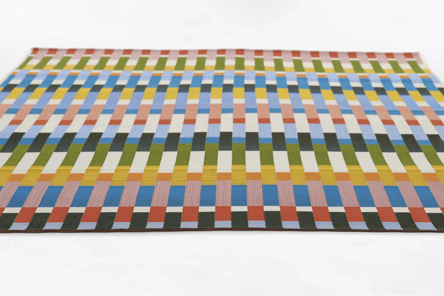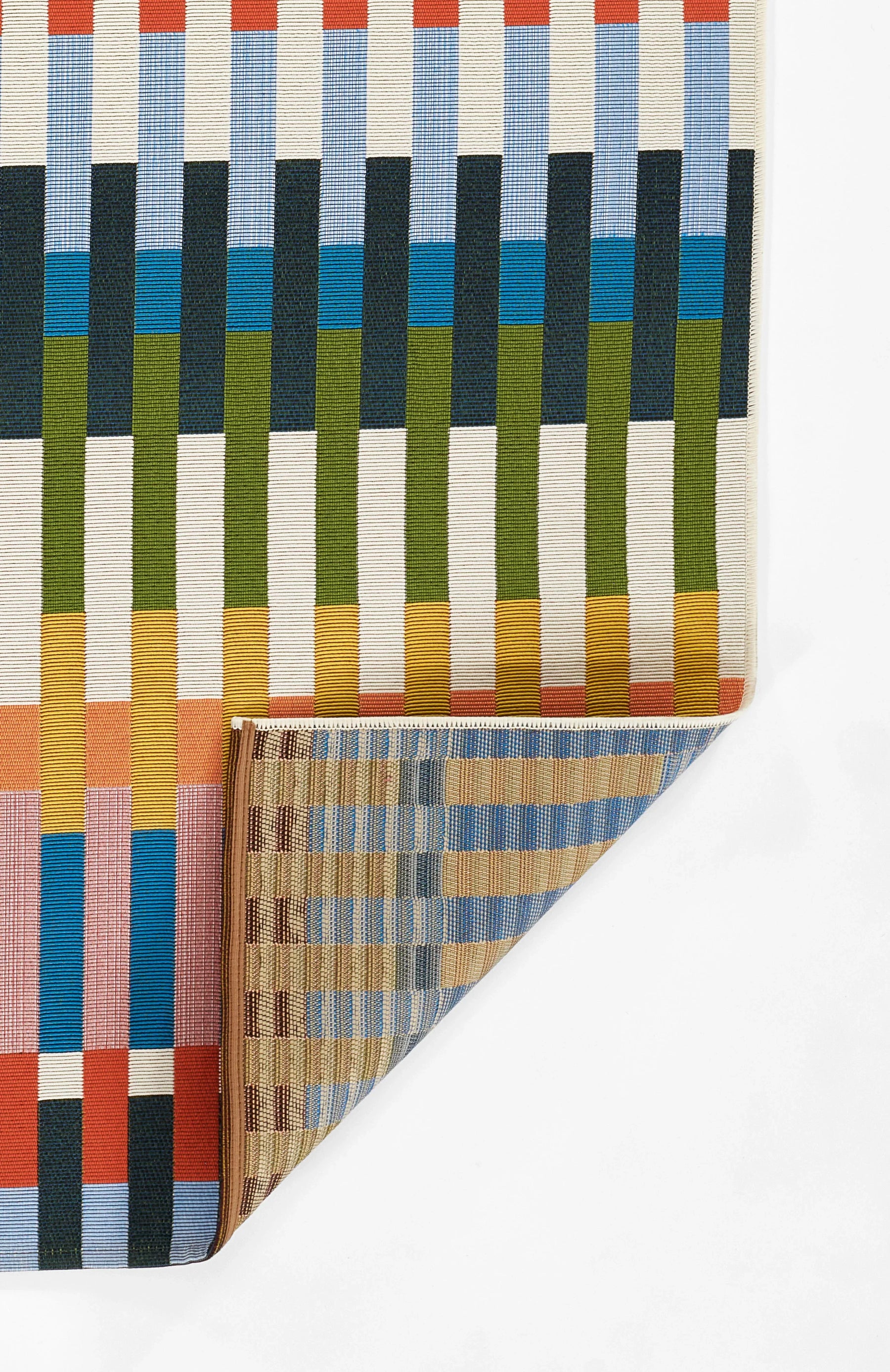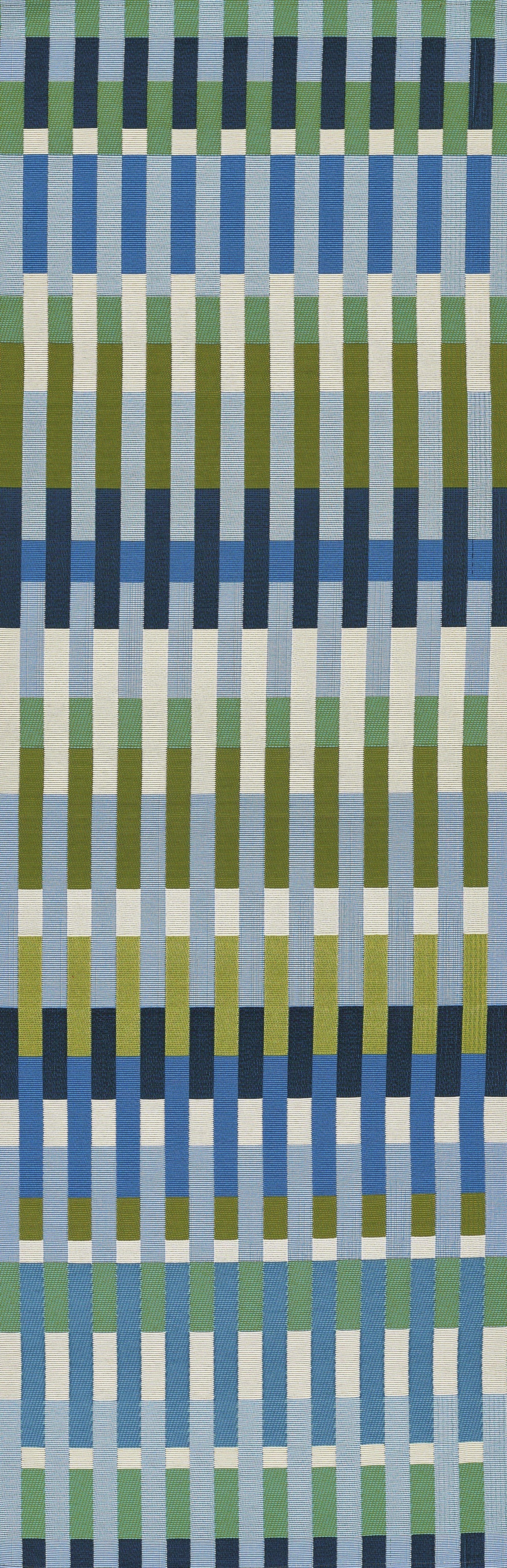 This statement rug features a striking geometric pattern with alternating shades of blue and green, with abstract lines and geometric stripes. The block-style design creates a sense of movement and depth, making it a bold and eye catching addition to your space. Its earthy and cool-toned color palette brings a calming yet vibrant feel, making it suitable for both modern and coastal-inspired interiors.