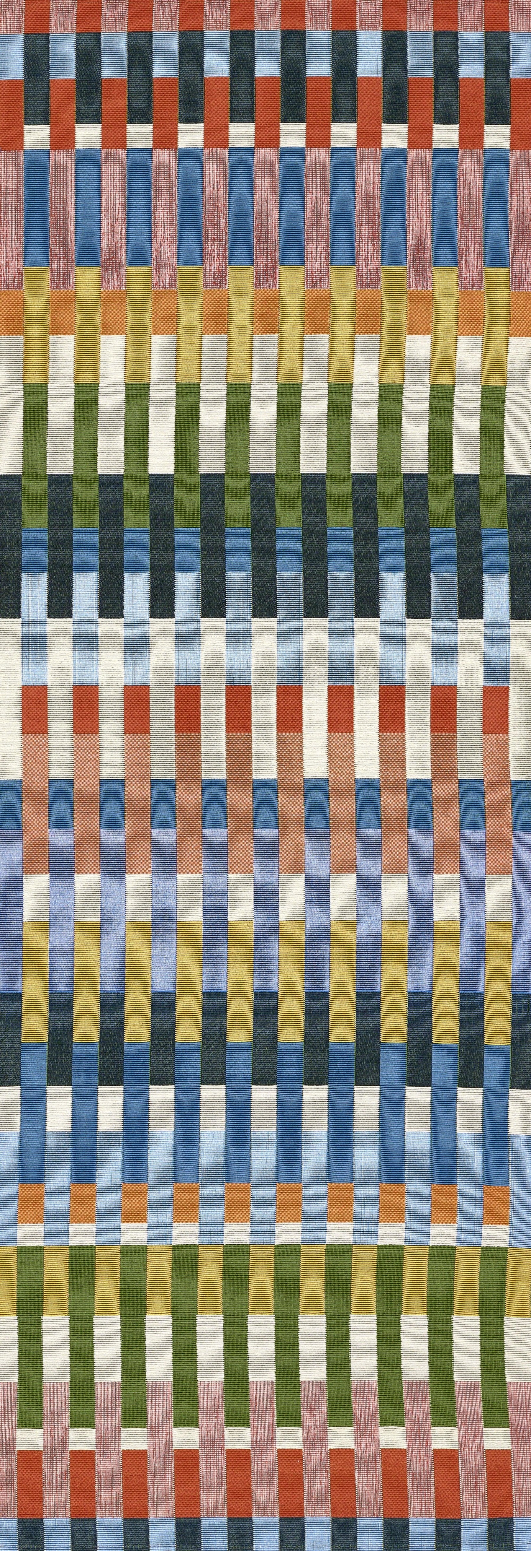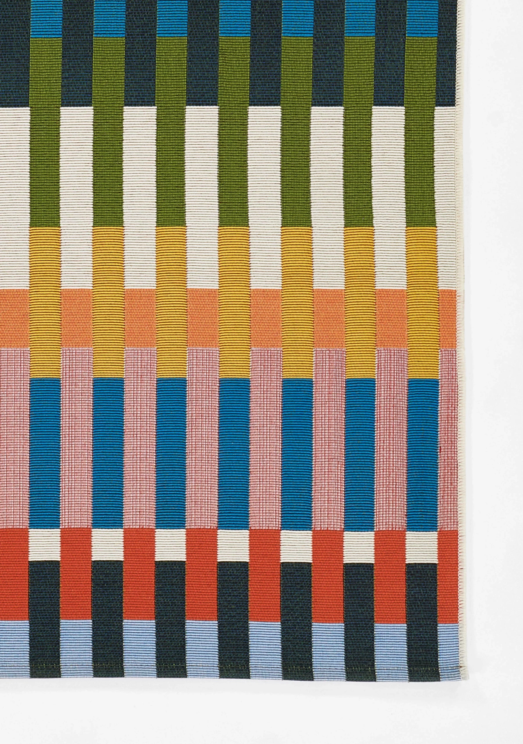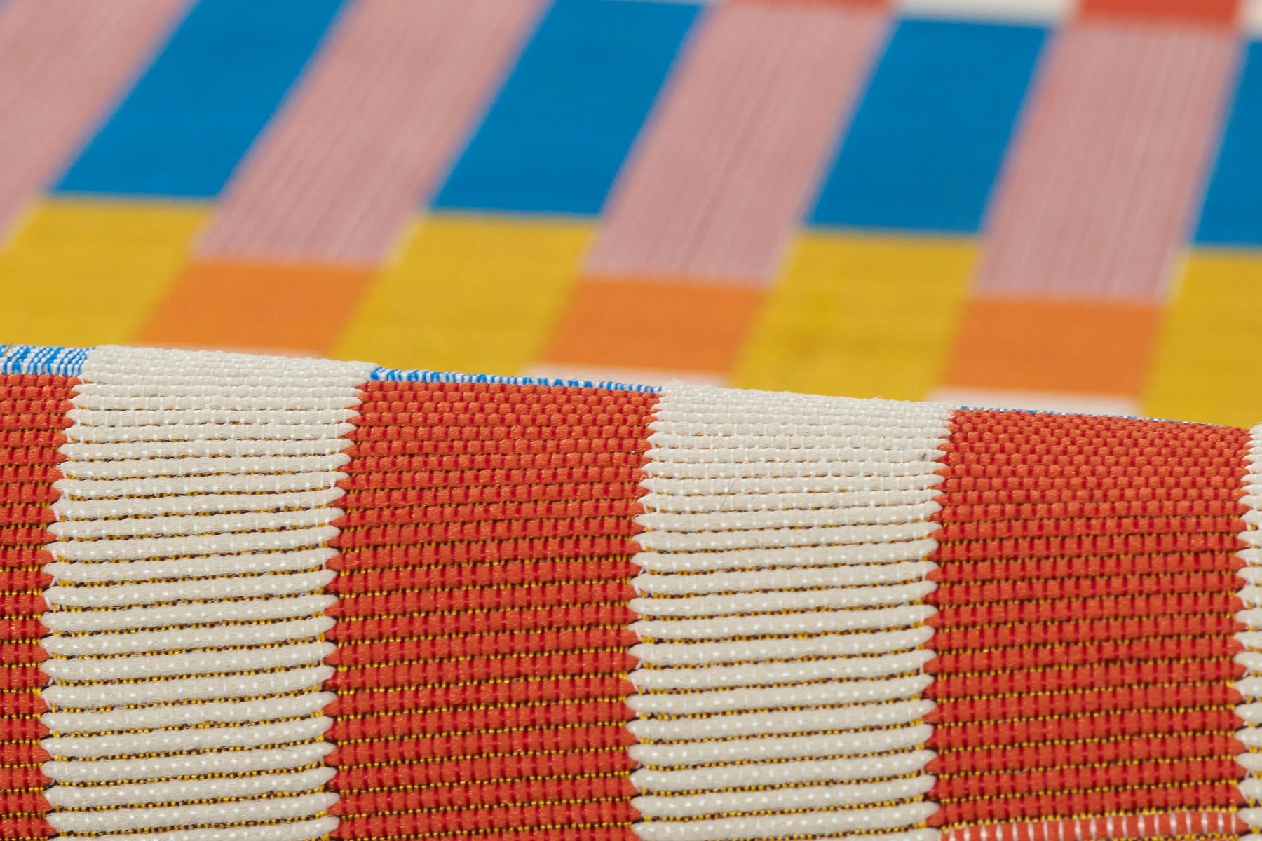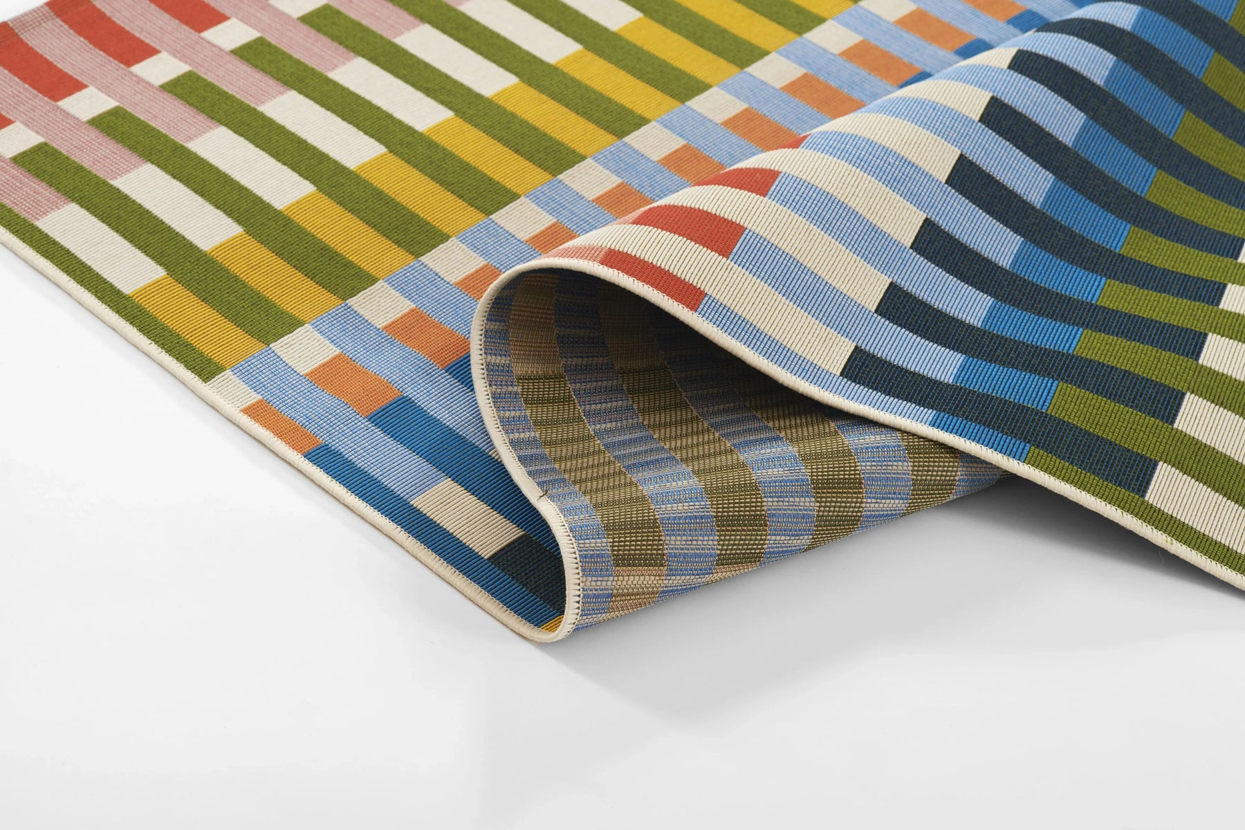 This statement rug features a striking geometric pattern with alternating shades of blue and green, with abstract lines and geometric stripes. The block-style design creates a sense of movement and depth, making it a bold and eye catching addition to your space. Its earthy and cool-toned color palette brings a calming yet vibrant feel, making it suitable for both modern and coastal-inspired interiors.