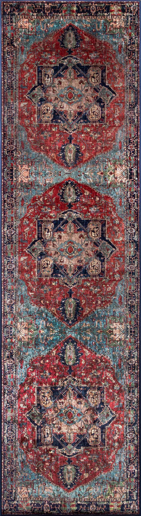 A masterpiece of historical design references, this traditional area rug is rich with period details. Captured in captivating red and navy blue with sky blue details, the Old-World rug design is anchored by a central medallion that draws the eye inward beyond a reverie of flower blossoms, pomegranates and ornamental motifs. Long-wearing polyester threads are suited to style just about any space, making this decorative floorcovering a versatile accent on floors throughout the home.