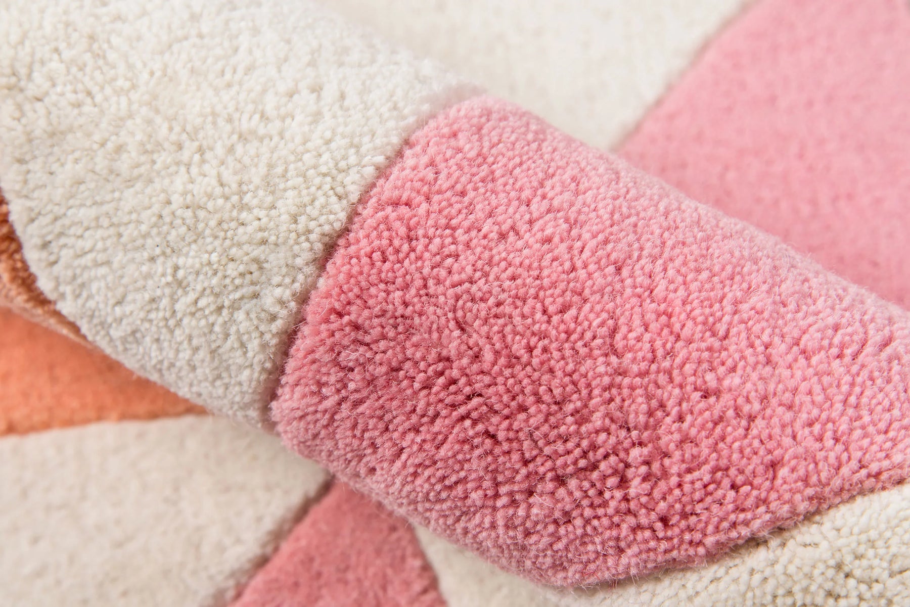 The graphic design of this modern area rug adds contemporary flair to floors throughout the home. Captured in a spectrum of vivid shades, polka dots, chevron stripes, triangulated patterns and checkerboard prints are perfect for layering above carpet or hard surfaces. Hand tufted from natural wool fibers, this decorative area rug assortment emanates fun with its oversized geometric arrangements and vibrant splashes of color.