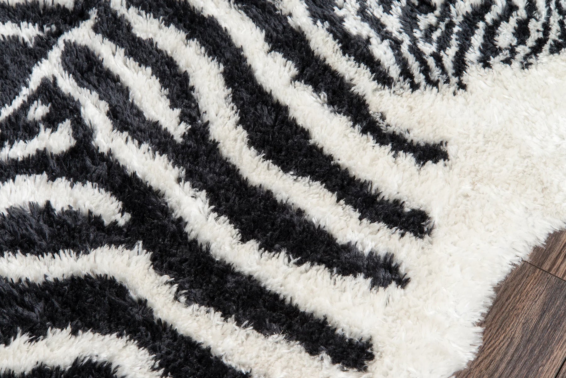 Inspired by exotic zebra patterns, this animal print area rug invites you to take a walk on the wild side. Black stripes cover the fluffy white rug field with the zebra’s recognizable markings while the irregular rug silhouette takes interior floors on urban safari. The faux fur floorcovering is crafted entirely from synthetic threads for a shaggy rug texture that’s cruelty free and completely chic