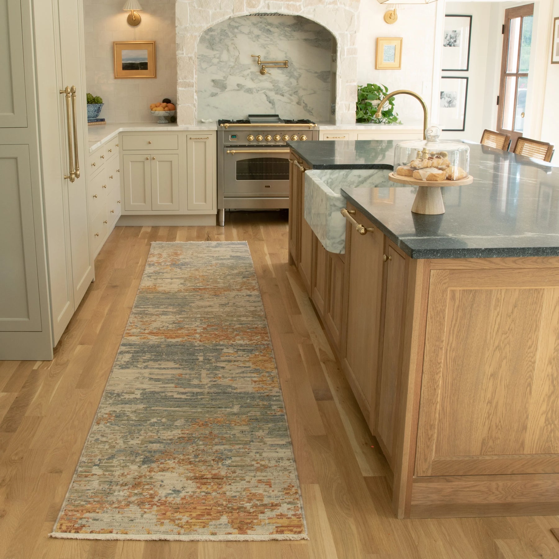 The Soleri collection features modern abstract designs beautifully colored in vibrant shades of pink, blue, green and gold. The space-dyed wool and nylon blend is cross-woven on an Axminster loom and features incorporated cotton fringe. Made in Egypt.