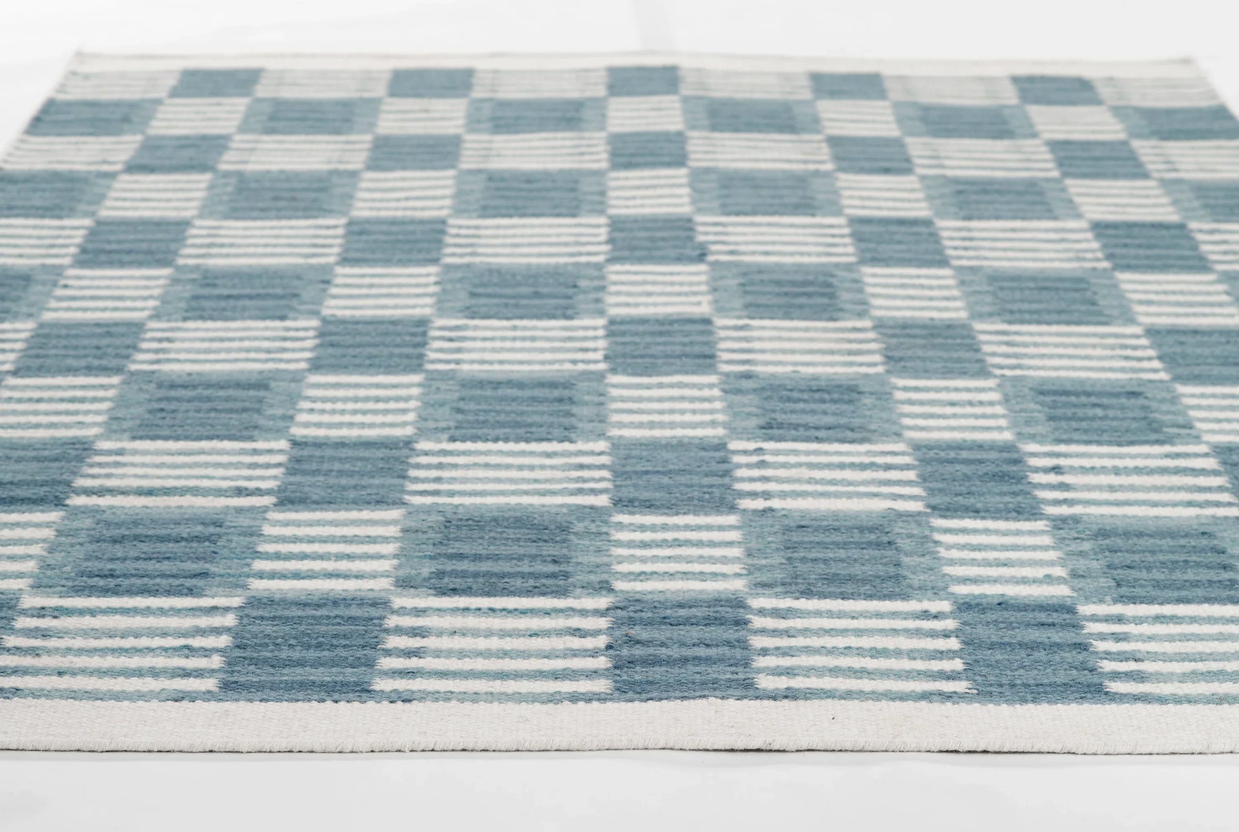 A modern classic with a playful twist, this hand-woven rug showcases a bold checkered pattern in soft blue and ivory. The design blends clean geometric structure with subtle irregularity—thanks to the textured detailing that adds movement and depth to each block. Crafted from a premium blend of 80% wool and 20% cotton, this flatweave rug offers natural durability, and a low-profile feel that’s perfect for layering or high-traffic areas. The alternating lines and blocks create a dynamic rhythm that’s both contemporary and rooted in Scandinavian simplicity. This rug brings together craftsmanship, color, and pattern in a way that feels both grounded and uplifting, ideal for modern, Nordic, or creative spaces.