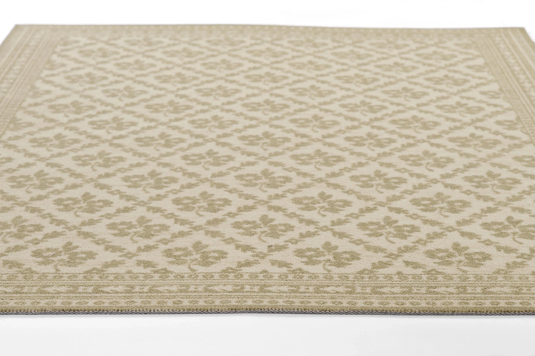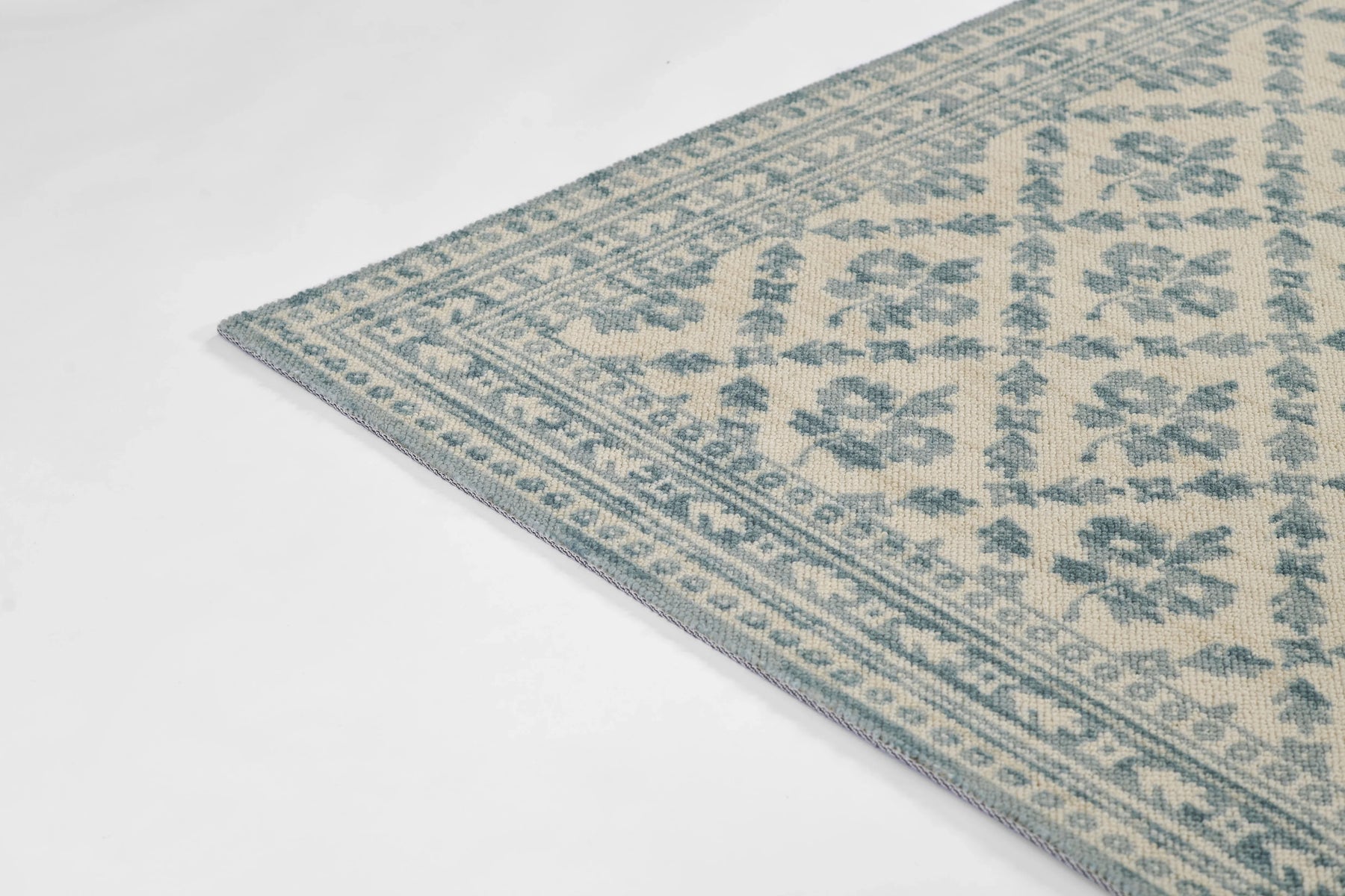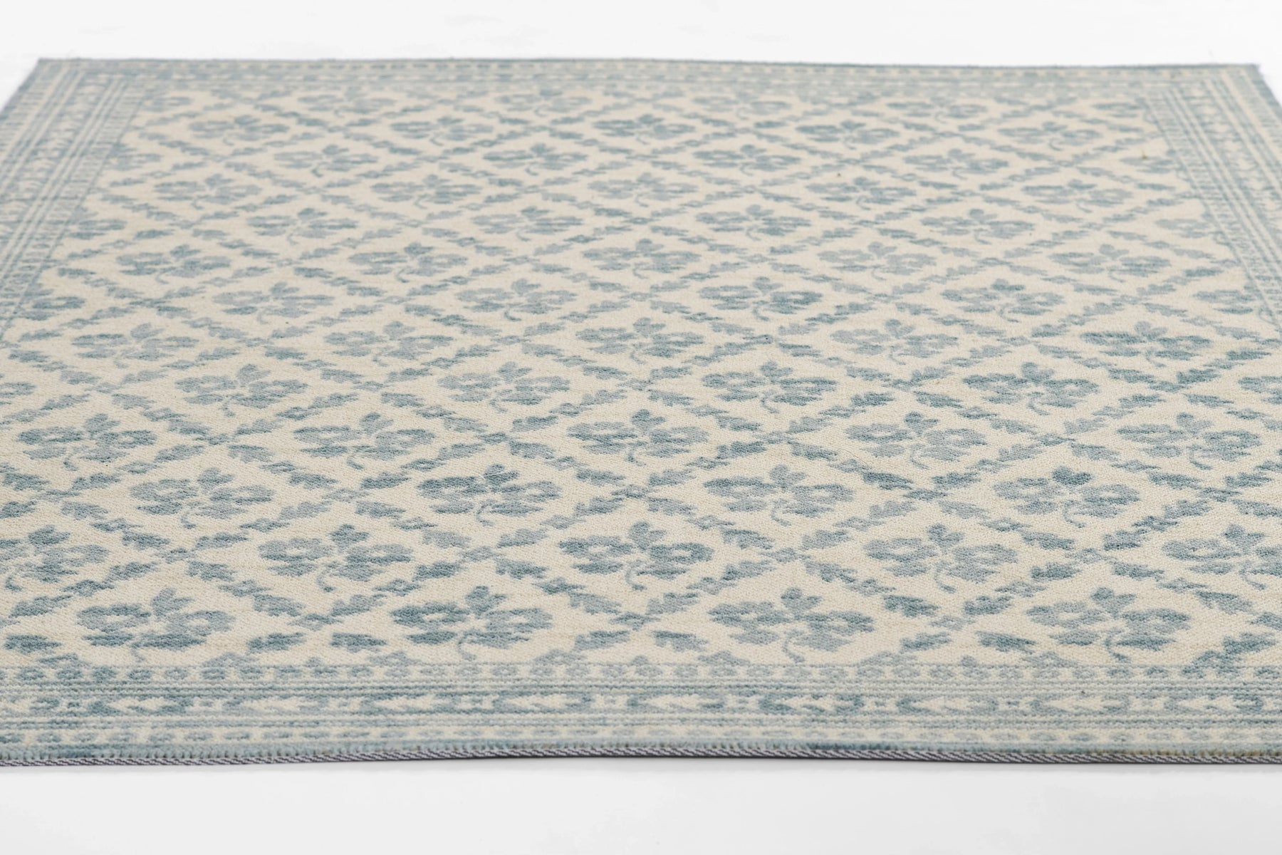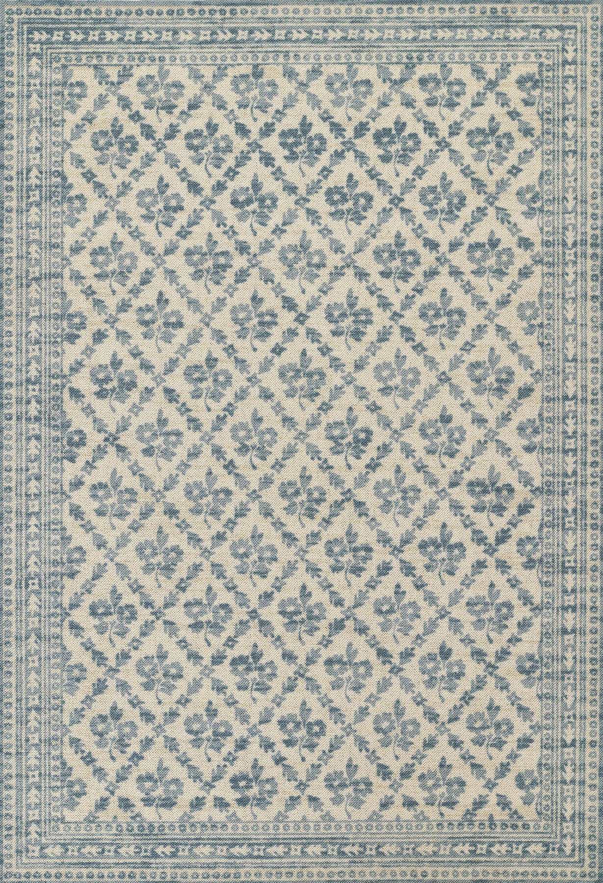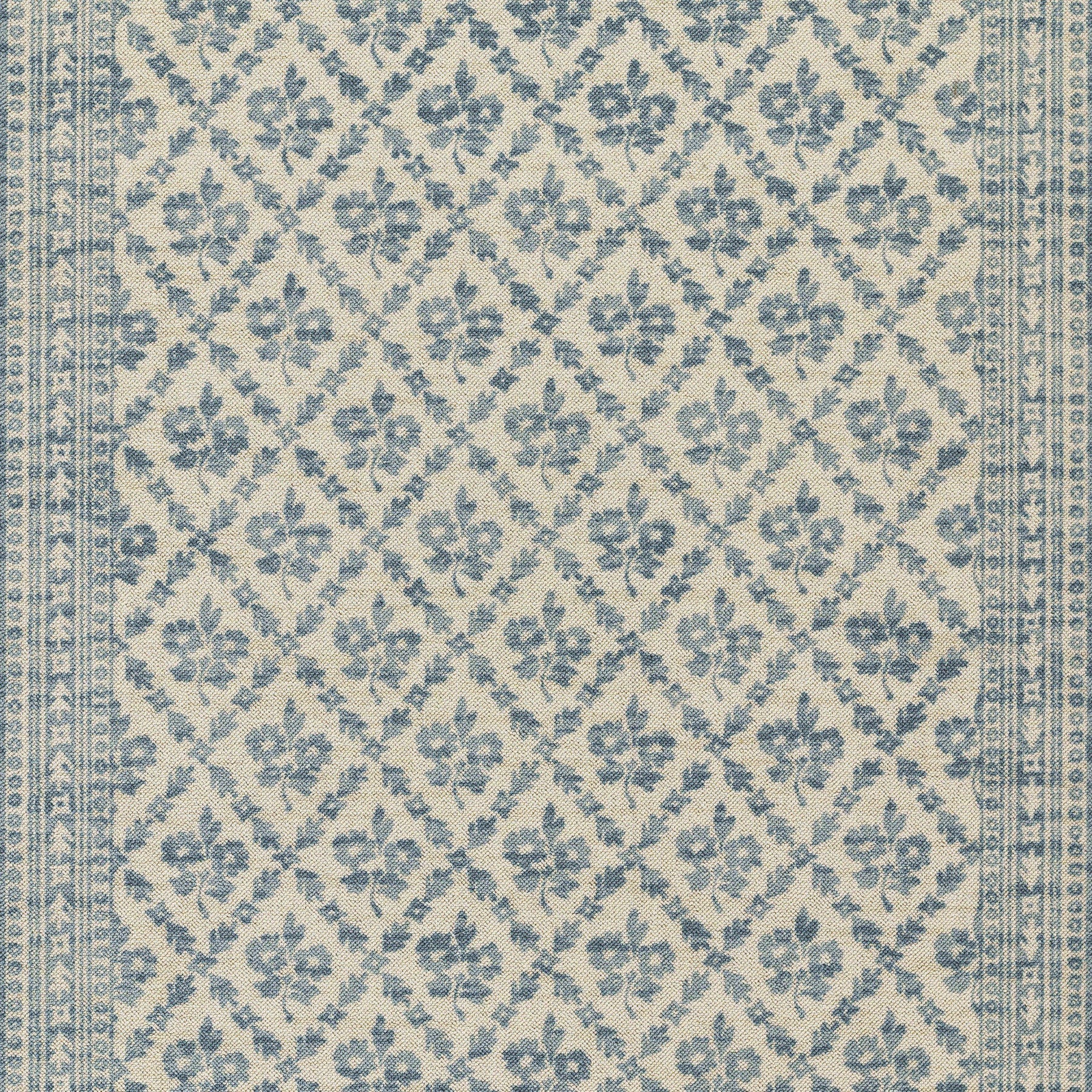 Elevate narrow spaces with the fresh charm of this delicately patterned runner. Featuring a subtle diamond lattice of dainty floral motifs in soft blue tones, this rug brings a light, airy elegance to hallways, kitchens, and entryways. Its classic pattern and balanced palette make it a perfect fit for cottage, coastal, or farmhouse interiors—adding just the right touch of vintage-inspired style. Whether you're layering it in a breezy hallway or placing it along a kitchen counter, this runner offers a subtle statement that’s both graceful and grounded.