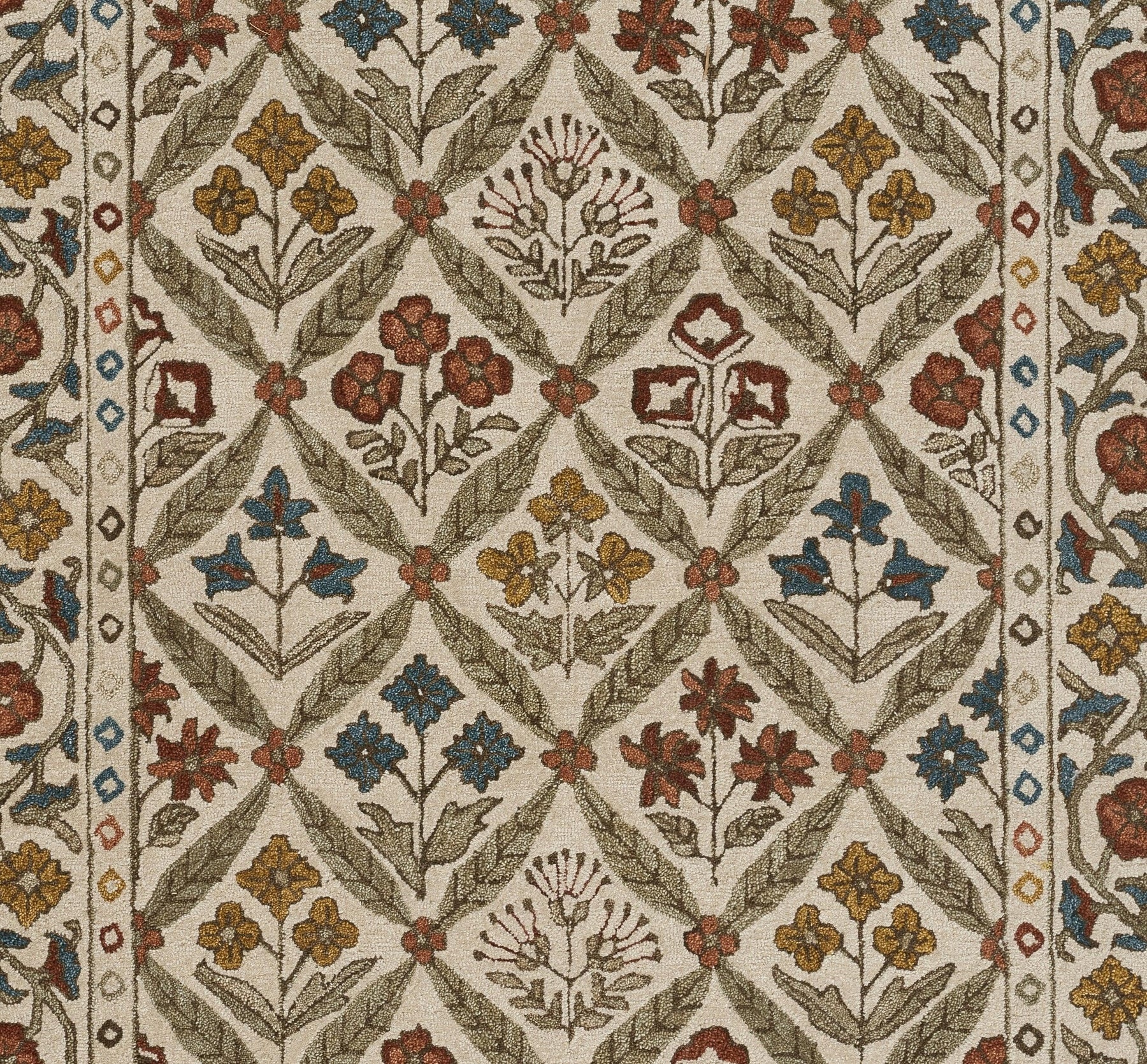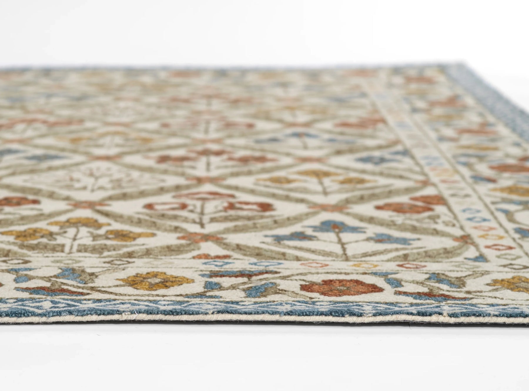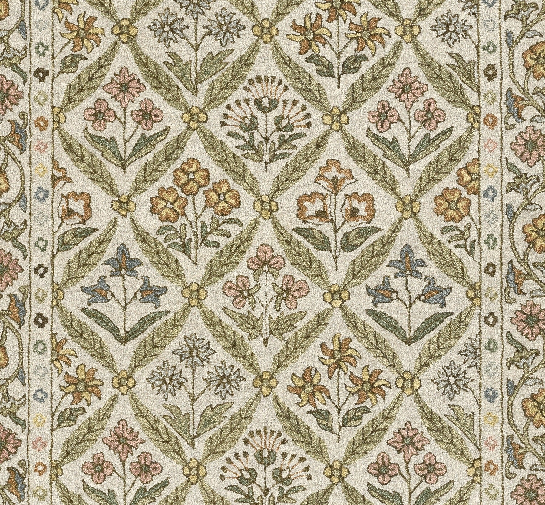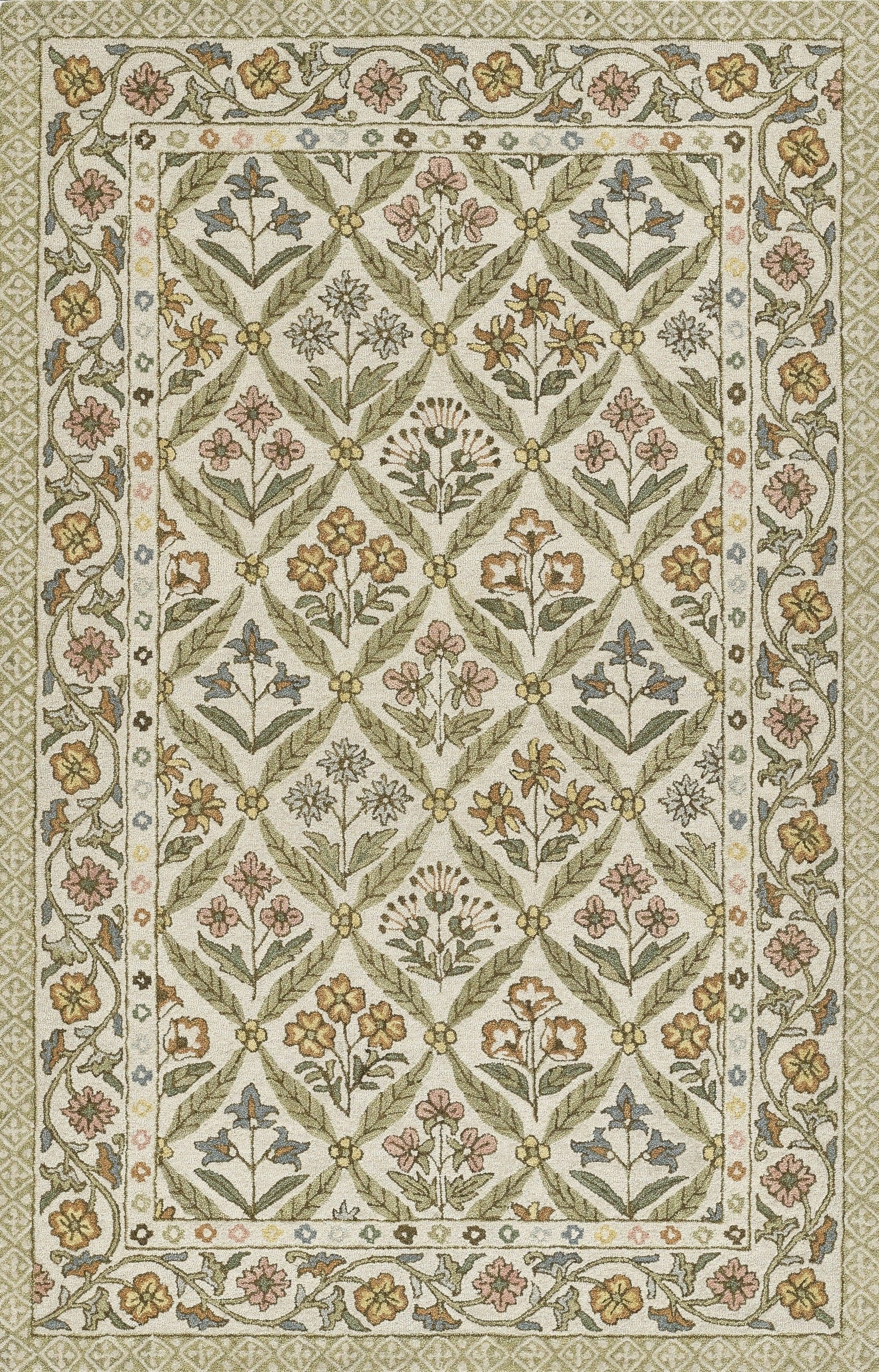 Inspired by the cheer and charm of English country cottages, this Cotswold rug brings warmth and whimsy to any interior. The hand-tufted wool construction is soft yet sturdy, showcasing a lively floral lattice pattern framed by an intricately detailed botanical border. Delicate blooms in golden ochre, crimson, and sky blue are arranged in block-print style, echoing the artisanal beauty of traditional Indian textiles. With its vibrant palette and storybook appeal, this rug adds a cozy, collected feel to bedrooms, sitting areas, and curated vintage-inspired spaces.