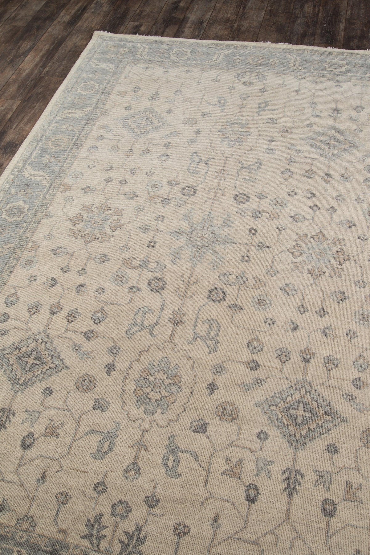 The Agra-esque design of this traditional area rug leaves a lasting legacy on interior floors throughout the home. Framed by a soft grey border, the beige rug field evolves in a series of fine grey threads that connect diamonds, leaves and palmettes with meandering flower petals and vines. Every fiber of the decorative floorcovering is meticulously crafted from natural wool threads with a hand-knotted technique passed down from generations of artisanal rug weavers.