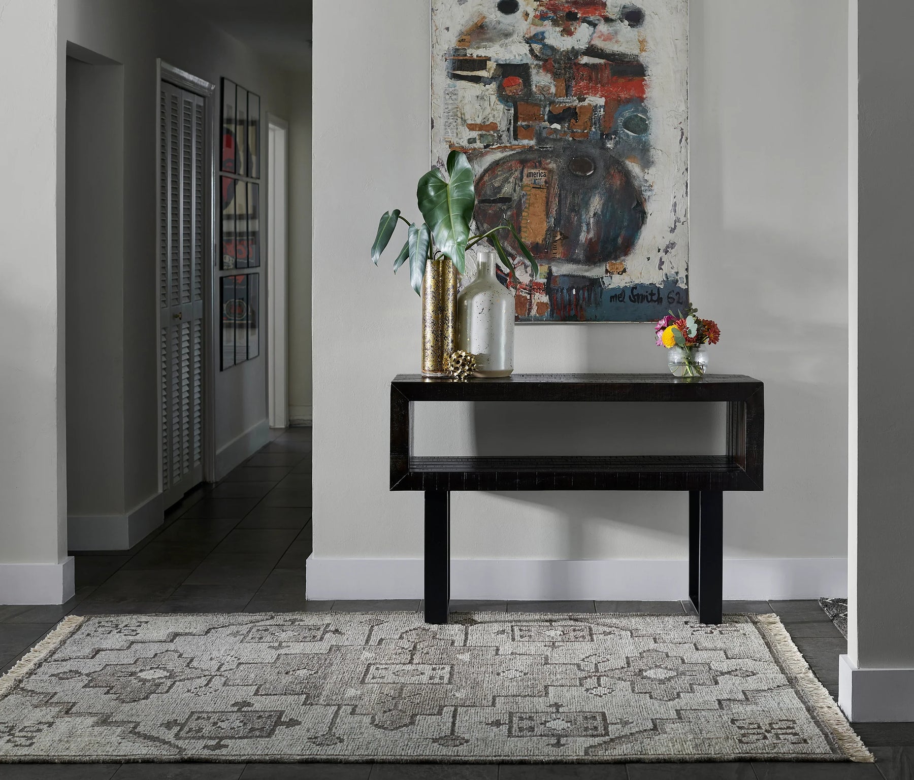 A celebration of tone-on-tone beauty, this natural-colored rug’s pattern feels like a modern update on a traditional Oriental rug. Hand-woven from wool and cotton, it’s a durable option for a high traffic area, while its beautiful design allows it to seamlessly work into a sophisticated living or dining room.