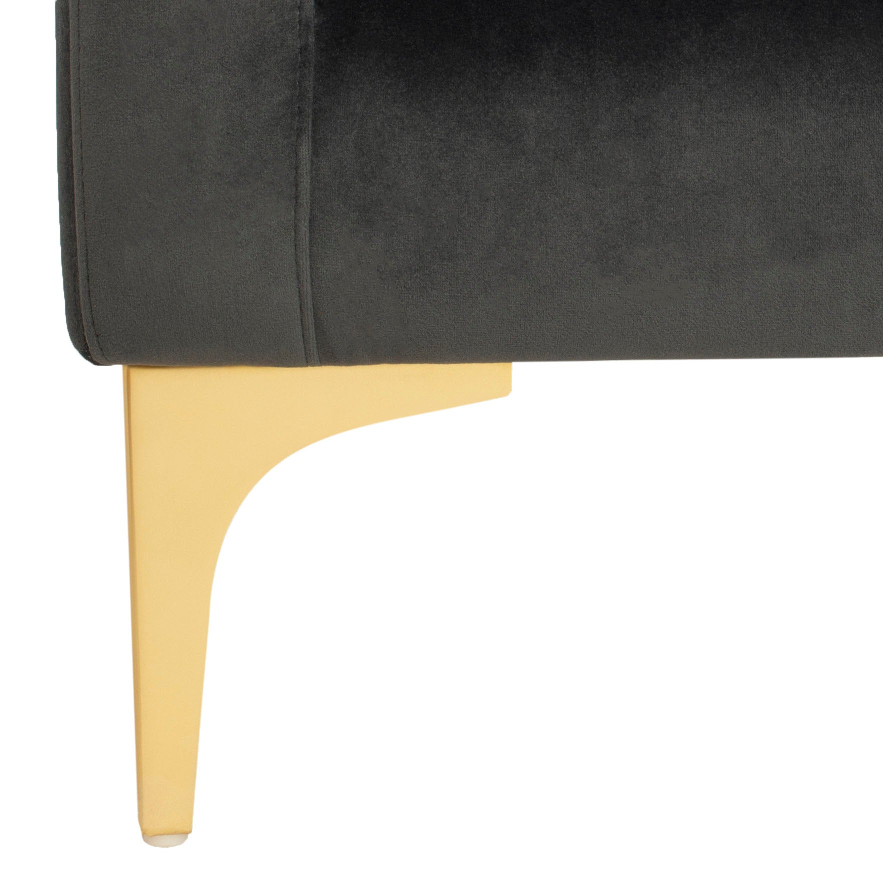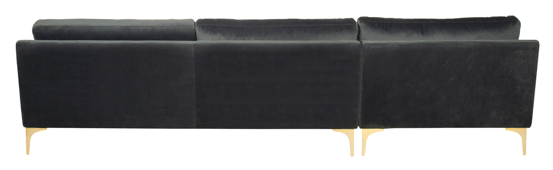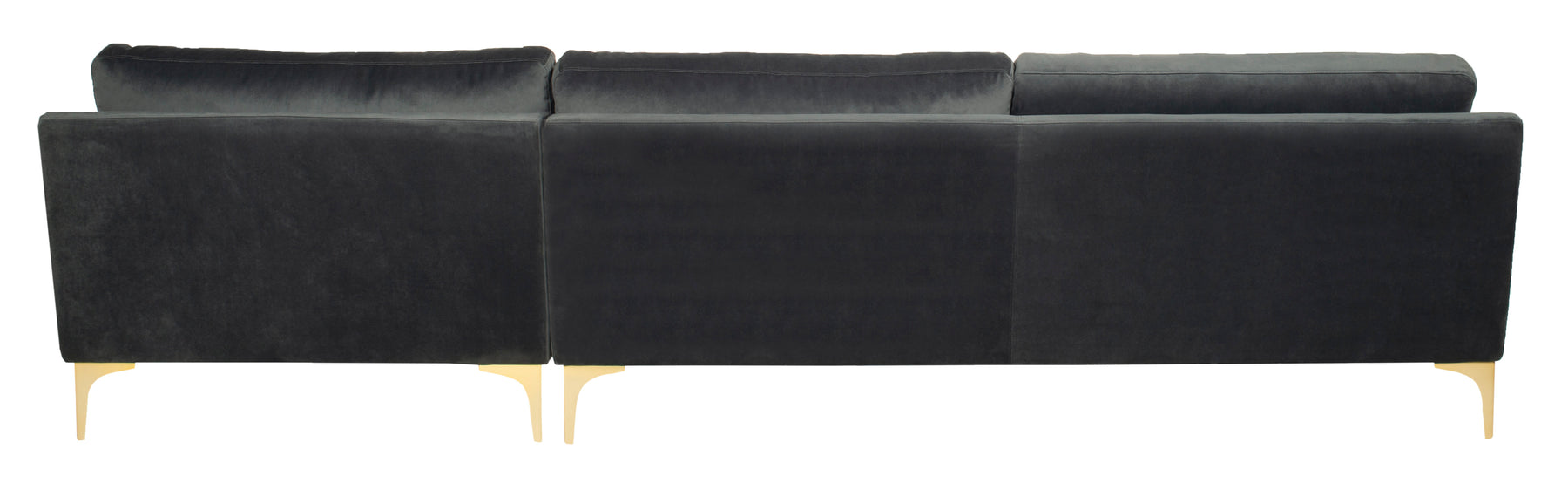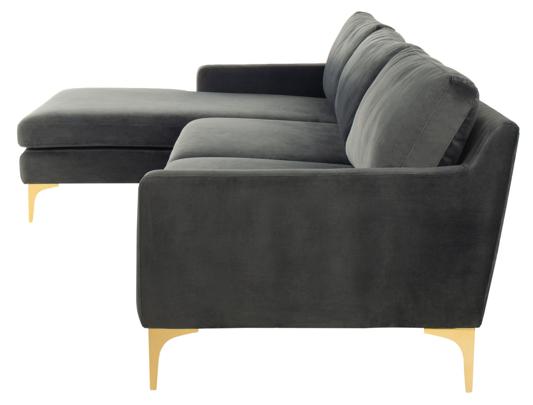 Transform your living space with the BRAYSON chaise sectional sofa. Designed with a right-facing orientation and enveloped in a sophisticated dark grey hue, this sofa effortlessly enhances any room. Crafted from a blend of pine wood and plywood, its durable structure assures stability and support. The velvet upholstery made from 100 percent polyester adds a level of comfort that invites relaxation. Complemented by elegant gold accents, this piece exudes understated luxury. The BRAYSON sofa serves as more than just seating; it becomes the centerpiece of your home, where style meets everyday usability. Ideal for chic urban apartments or cozy family spaces, this sectional combines form and function seamlessly. Upgrade your home today with a sofa that brings a touch of elegance to every setting. Whether you're entertaining guests or enjoying a quiet evening, this standout piece adapts to any occasion with effortless grace.