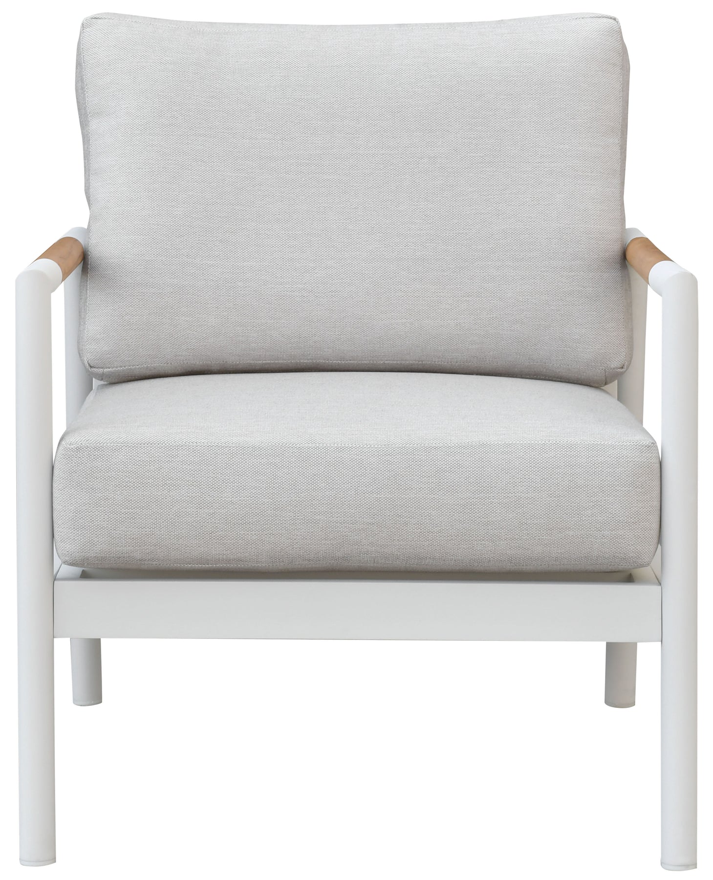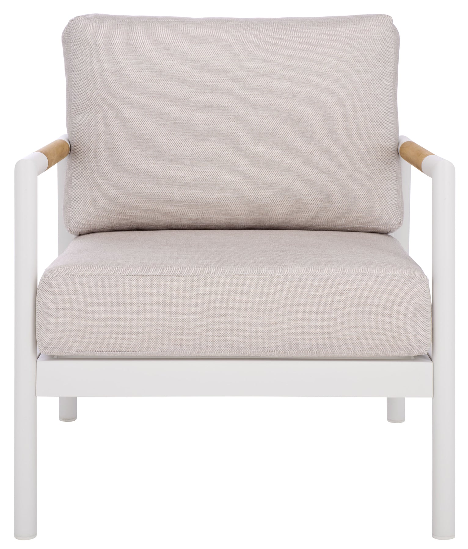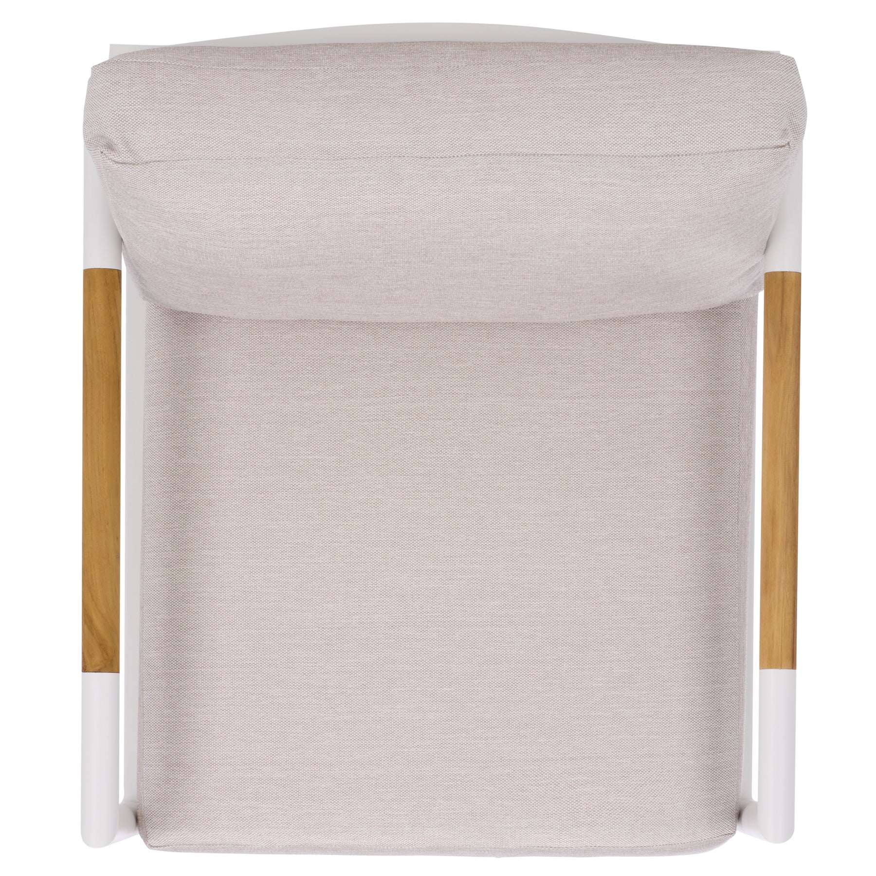 Introducing the Chryssa aluminum and teak patio chair, the perfect addition to your outdoor space. Designed in a stylish white and beige combination, it seamlessly blends with any decor. The use of metal and wood ensures a sturdy frame, while fabric and foam cushions provide comfort for hours of relaxation.