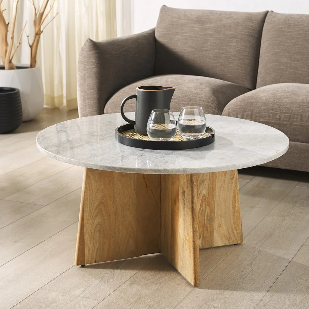 Update your home with the effortless style and charm of our Madilynn round coffee table. A gracefully rounded table top sits upon a T-shaped base to feature a simple yet striking visual play. Crafted from solid mango wood, the table exuberantly displaying the rich grains of the wood. It is finished off in a refined natural finish to elevate your surroundings with a sleek and modern look. Our coffee table can set the perfect backdrop for your decorative accents.