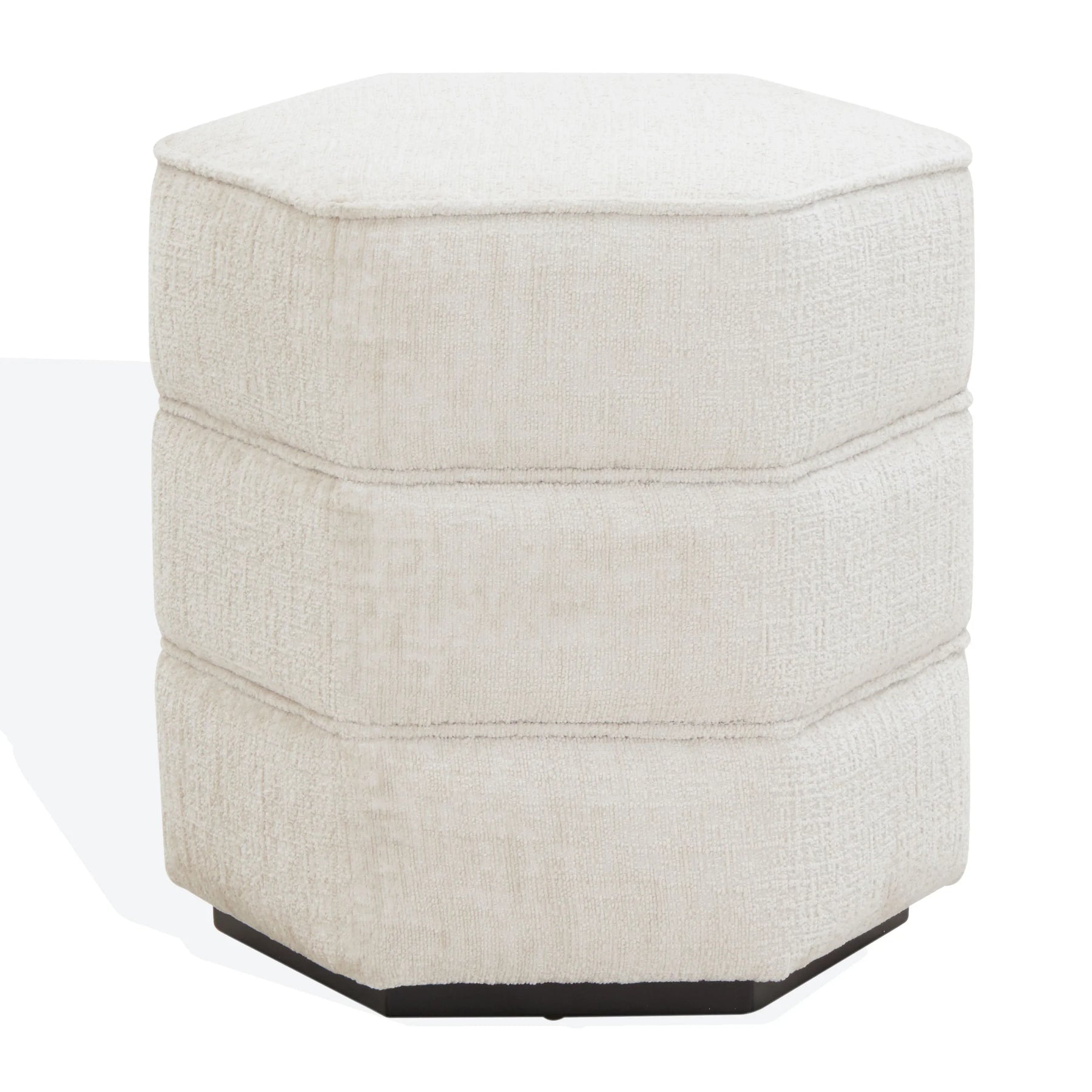 Elevate your living room with the Rosaria Chenille Hexagon Ottoman from Safavieh Couture. Upholstered in soft beige chenille fabric, this ottoman combines luxurious comfort with a unique geometric design. Crafted with wood, fabric, and foam, it offers versatile use as extra seating, a cozy footrest, or a chic accent piece. Its subtle beige tone complements modern and contemporary decor, making it a stylish addition to any Safavieh Couture furniture collection.