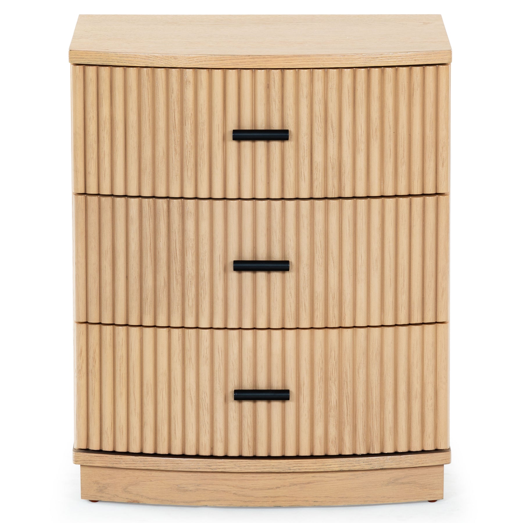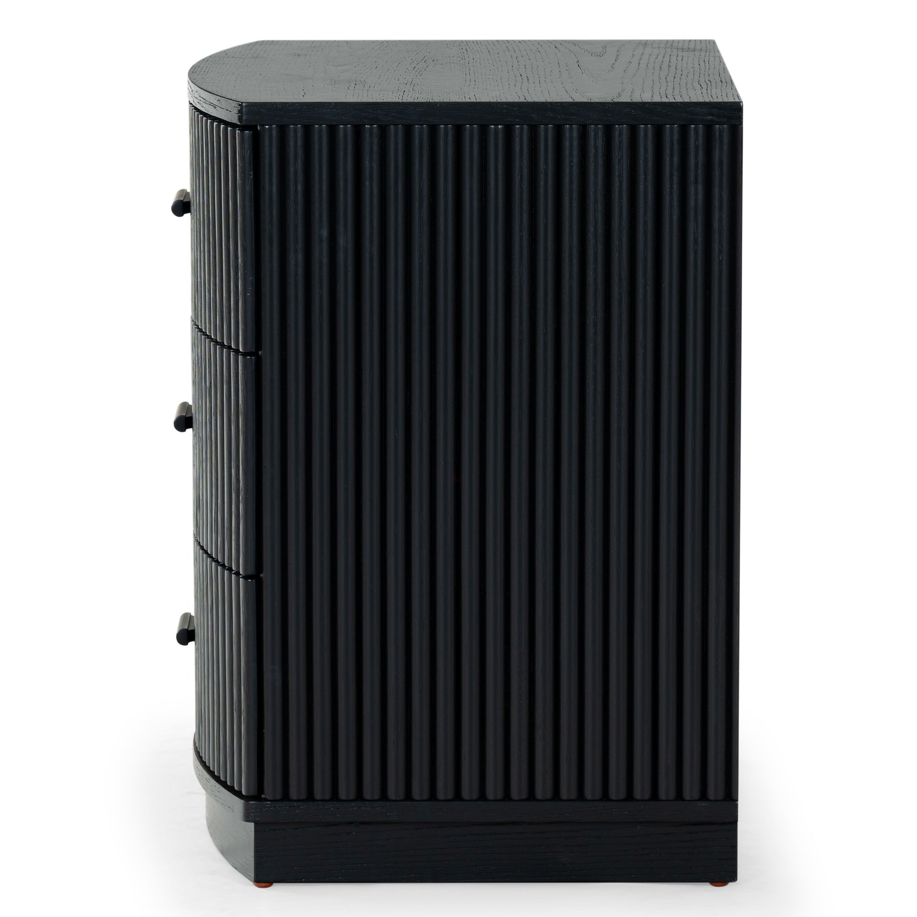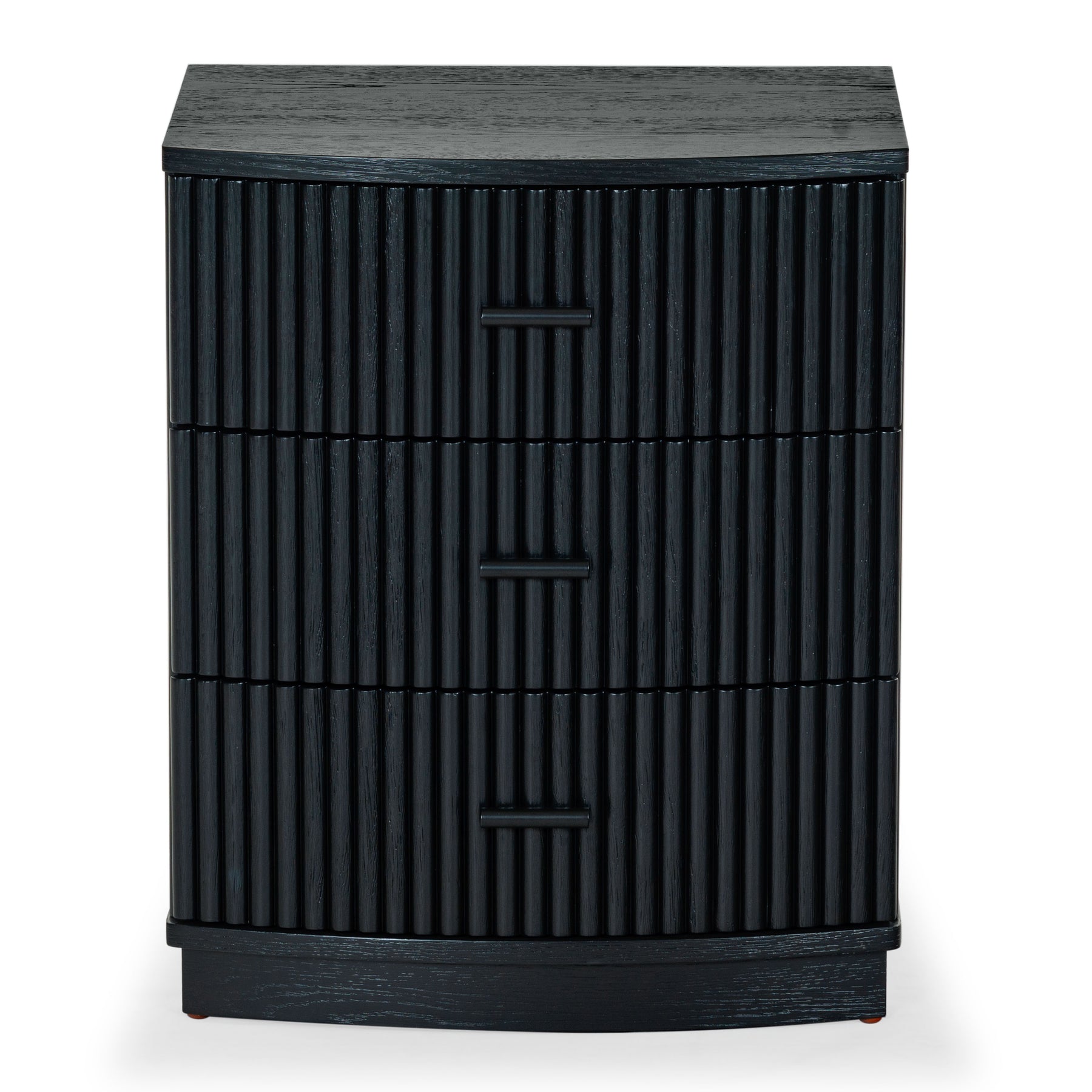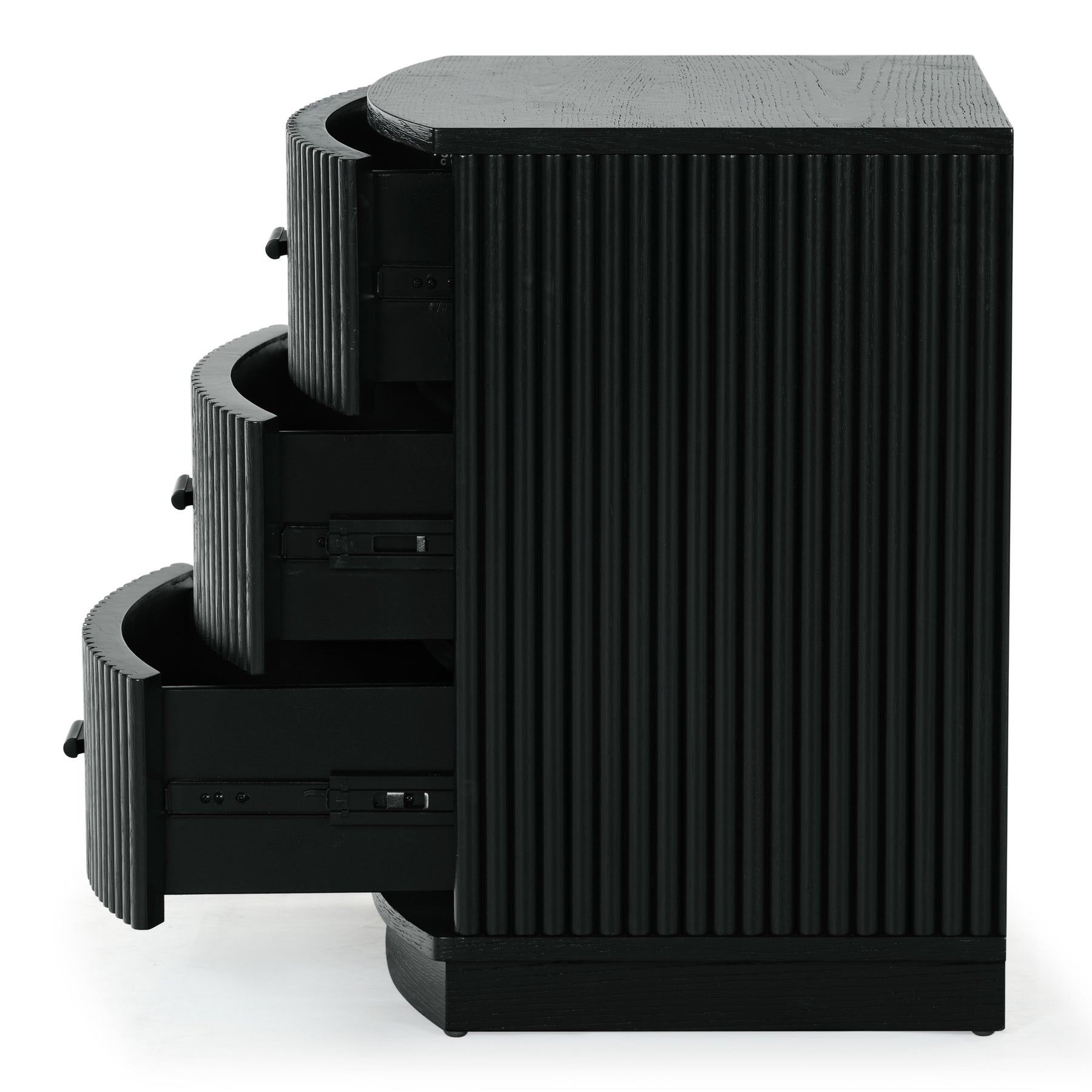 Introducing the Shelbie 3 Drawer Reeded Nightstand in a sleek black finish, designed to elevate your bedroom space with both style and functionality. Crafted from wood, this nightstand features elegant polyester resin drawer fronts that add a touch of sophistication to any decor. The three spacious drawers provide ample storage for your bedside essentials, allowing you to keep your space neat and organized.