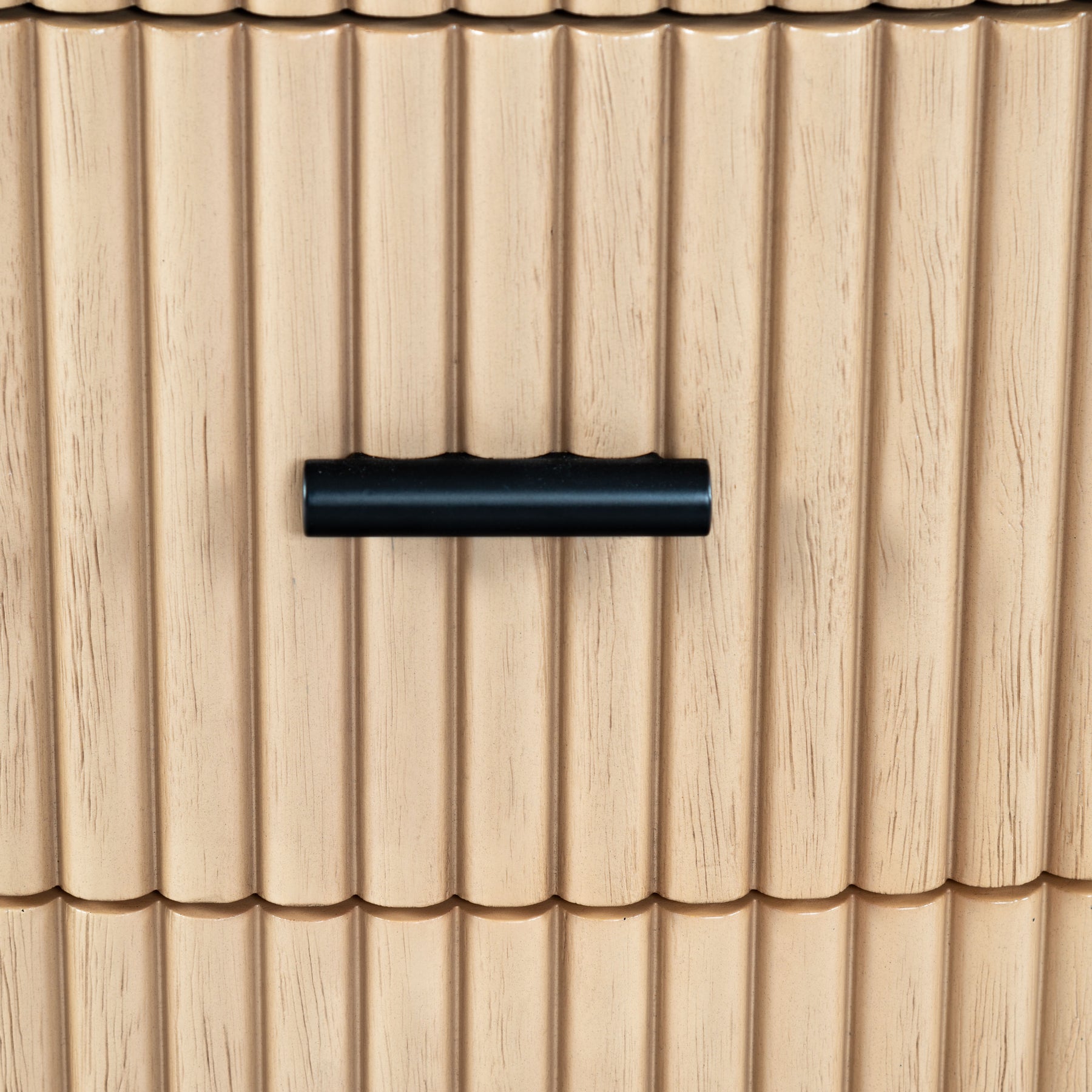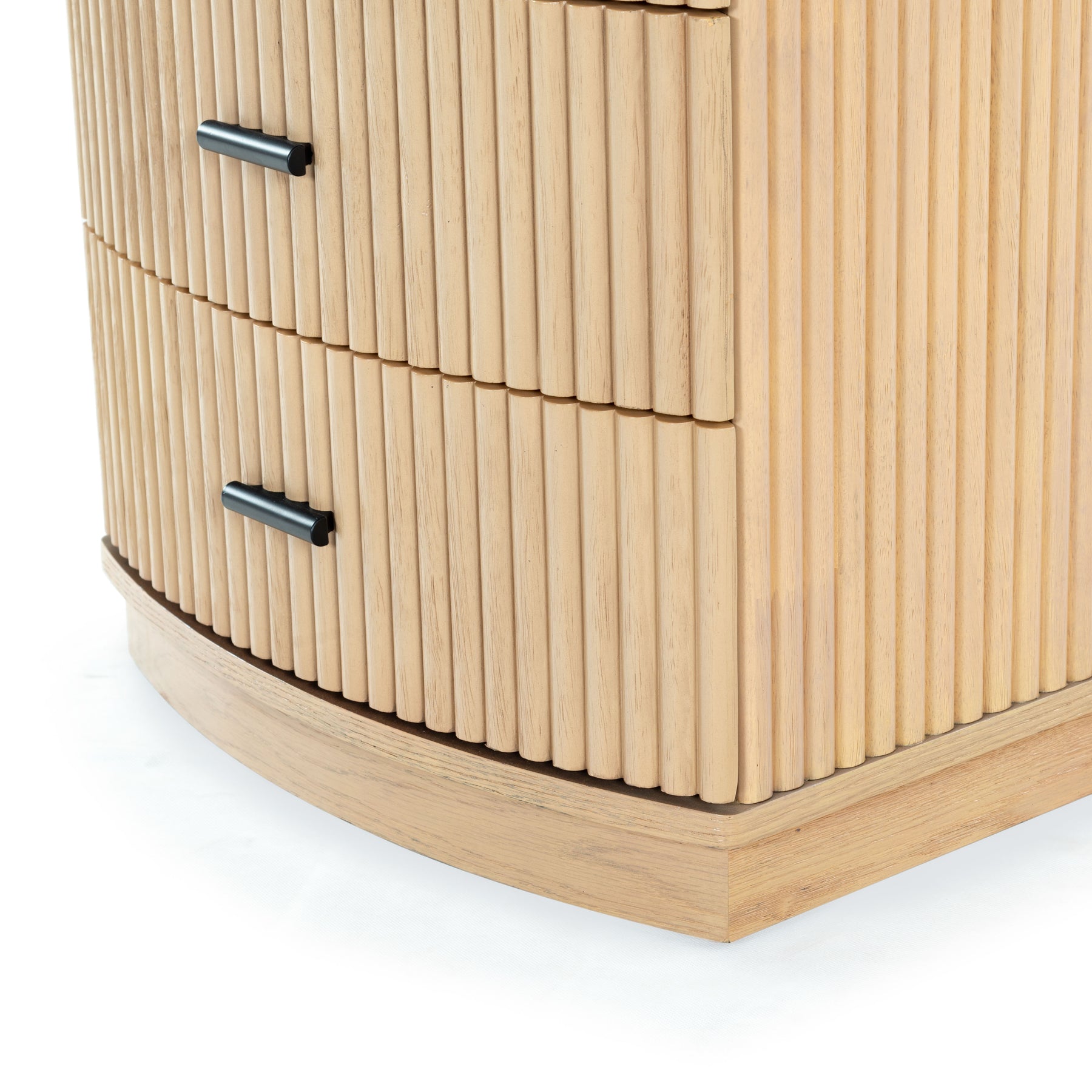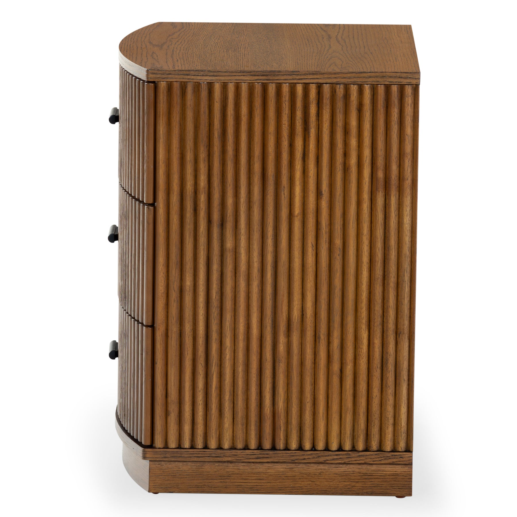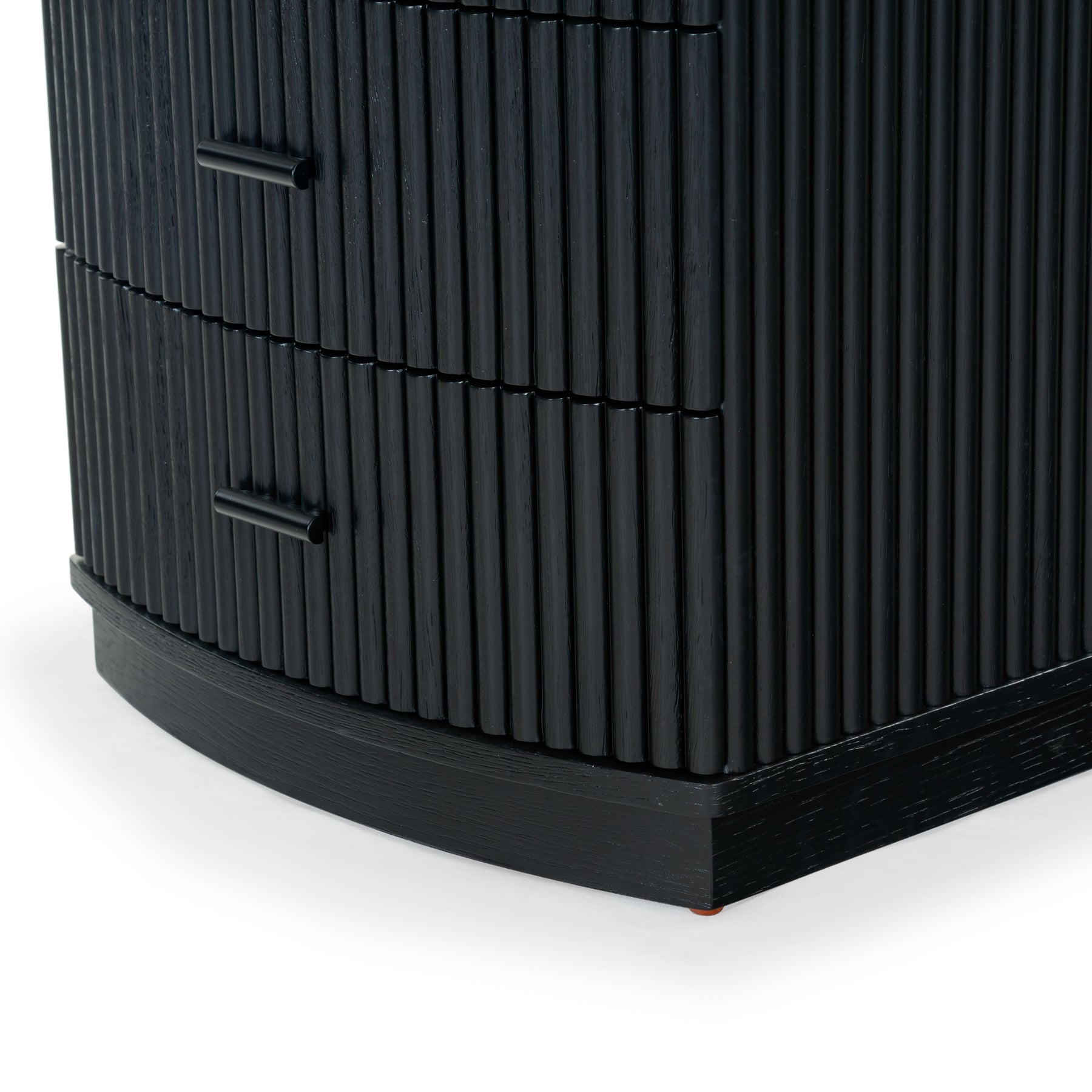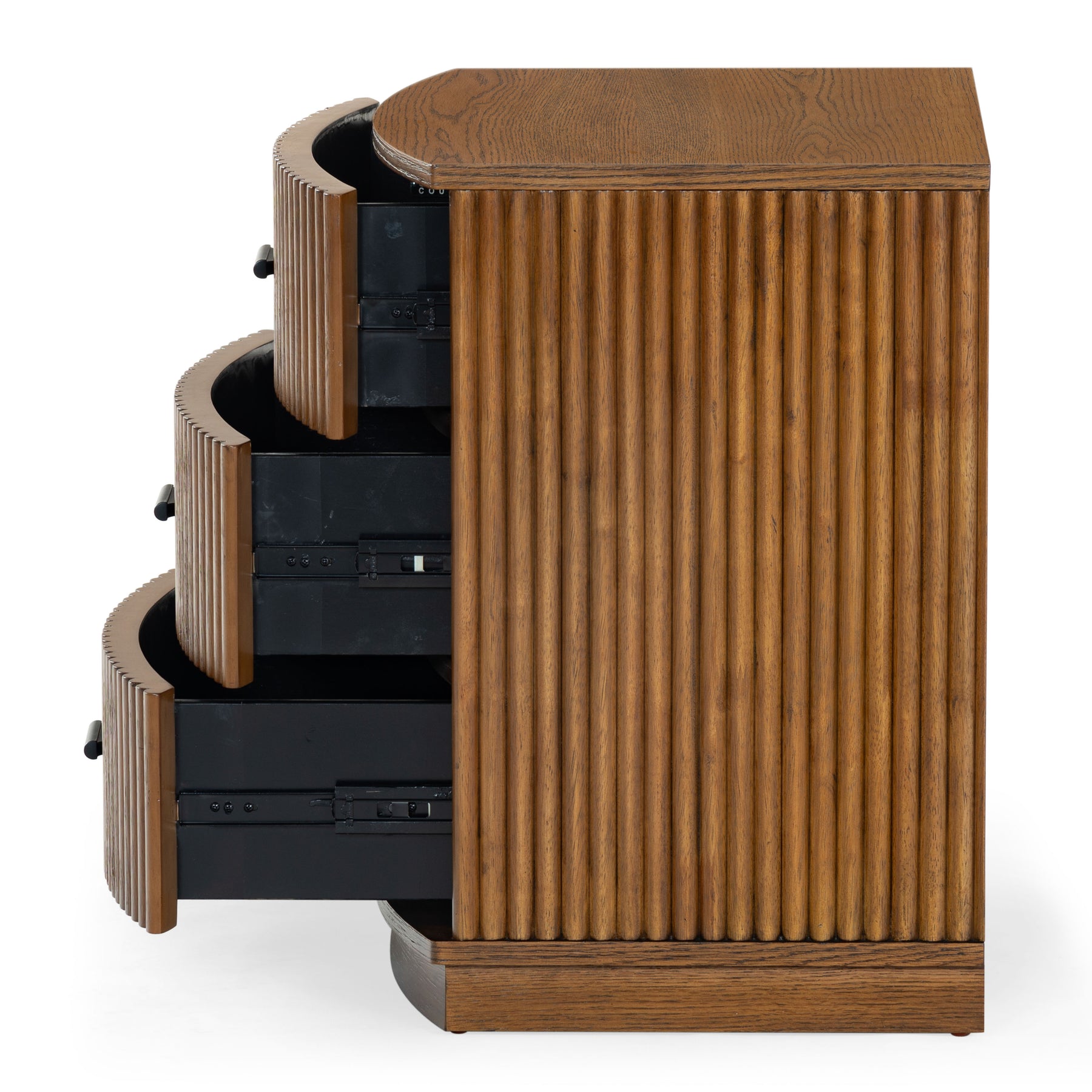 Introducing the Shelbie 3 Drawer Reeded Nightstand in a sleek black finish, designed to elevate your bedroom space with both style and functionality. Crafted from wood, this nightstand features elegant polyester resin drawer fronts that add a touch of sophistication to any decor. The three spacious drawers provide ample storage for your bedside essentials, allowing you to keep your space neat and organized.