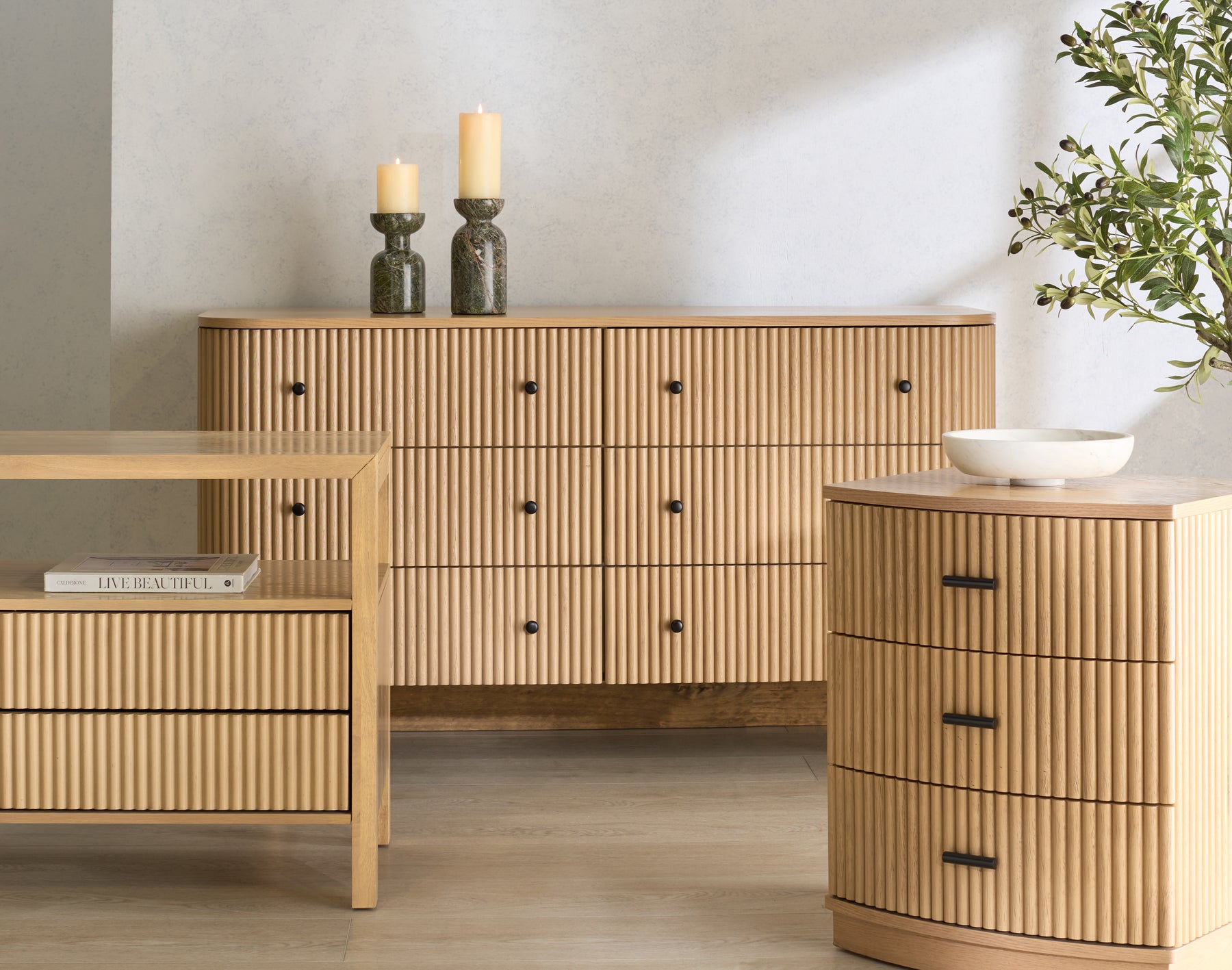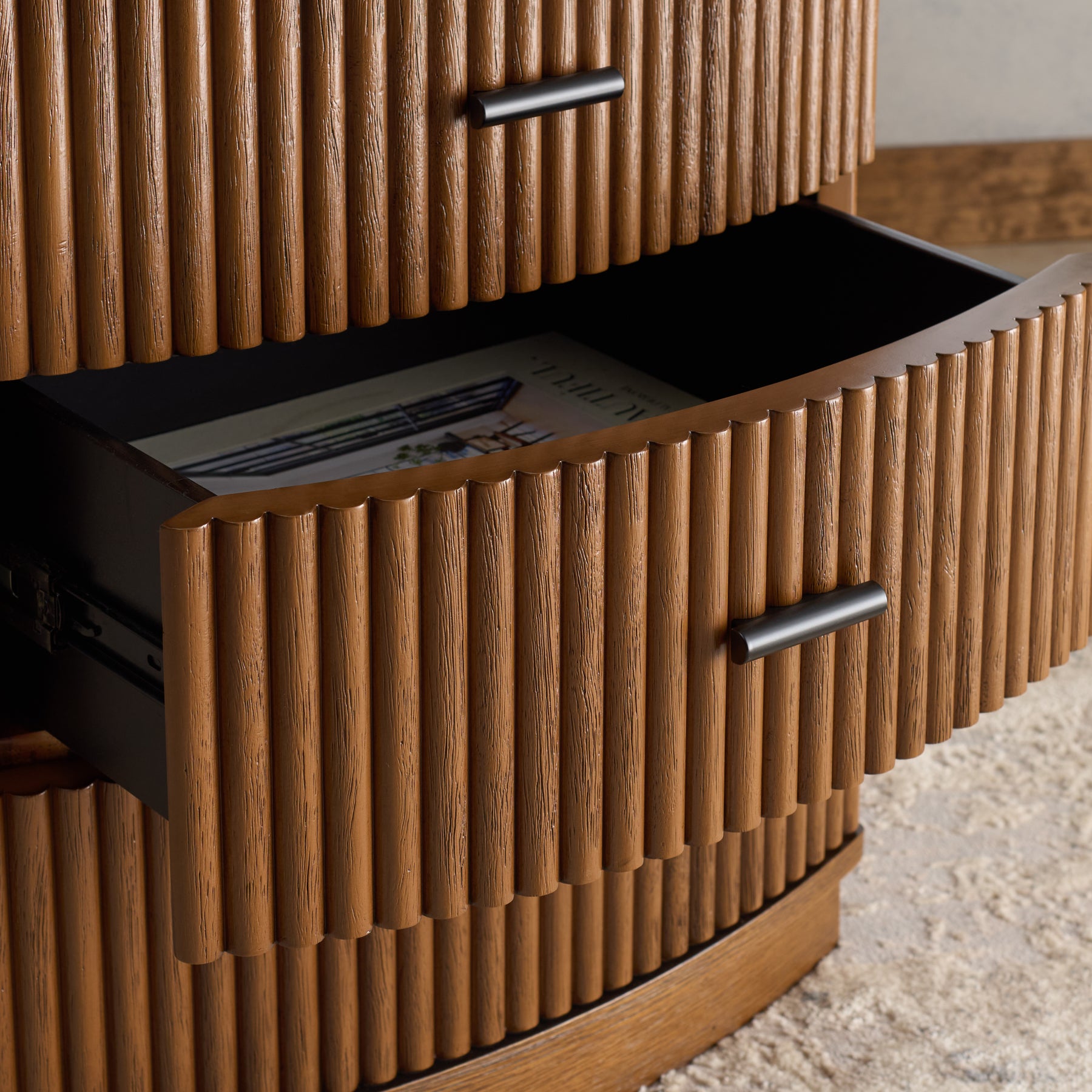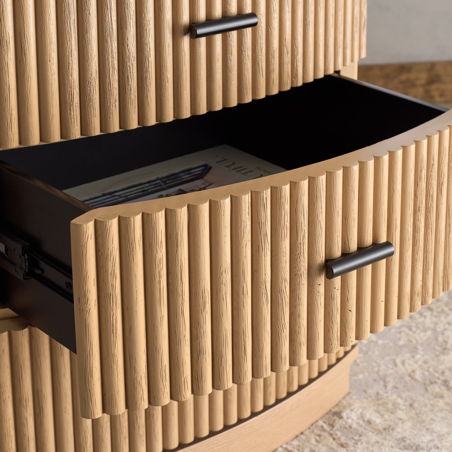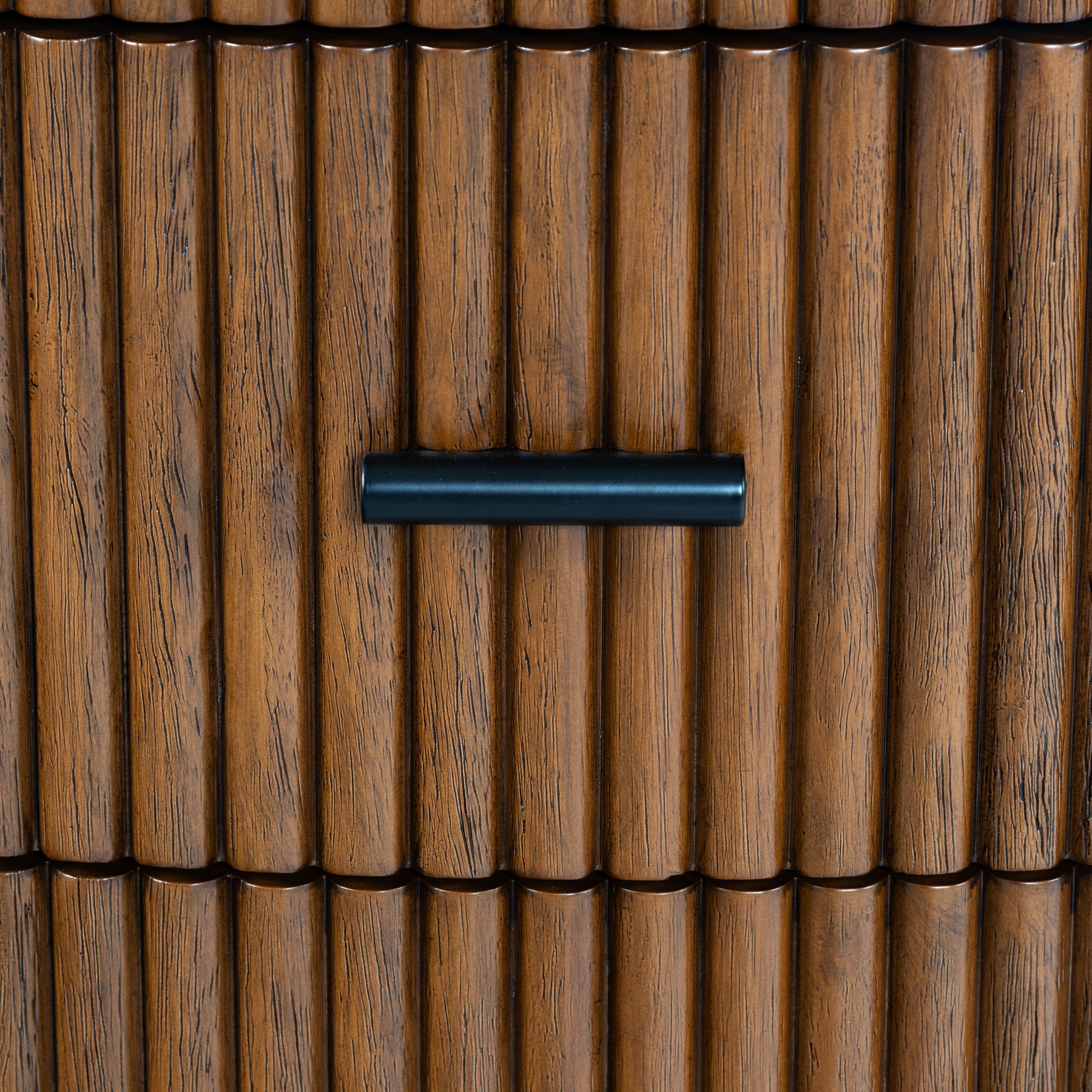 Introducing the Shelbie 3 Drawer Reeded Nightstand in a sleek black finish, designed to elevate your bedroom space with both style and functionality. Crafted from wood, this nightstand features elegant polyester resin drawer fronts that add a touch of sophistication to any decor. The three spacious drawers provide ample storage for your bedside essentials, allowing you to keep your space neat and organized.