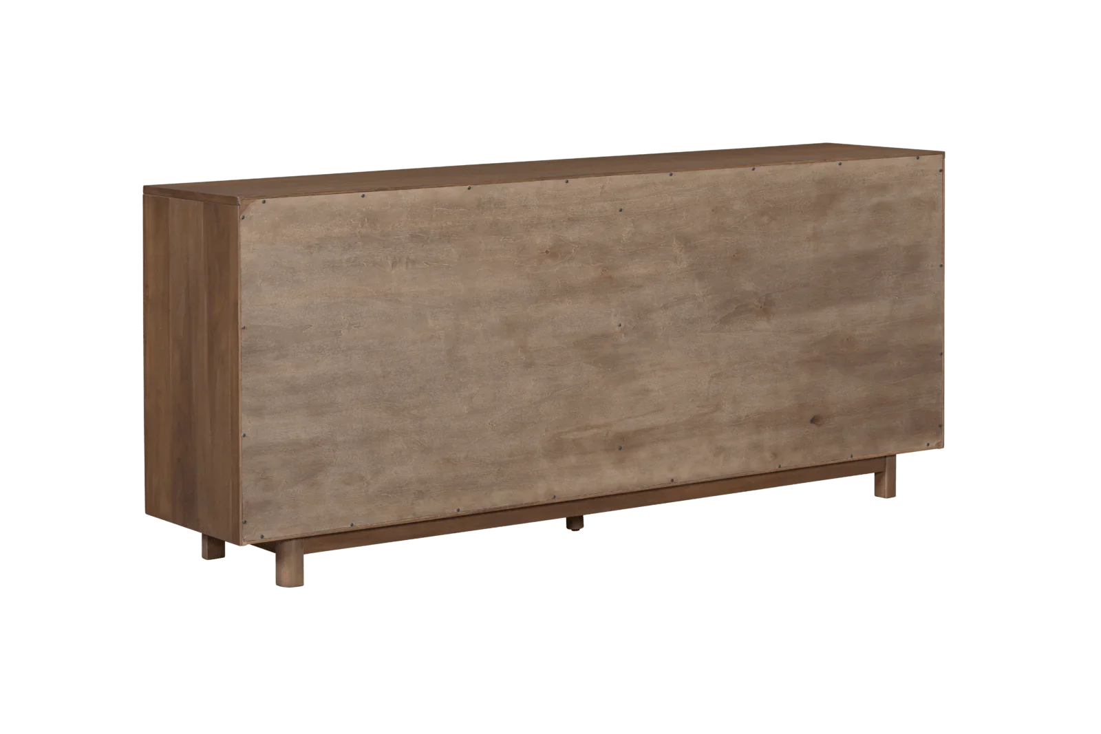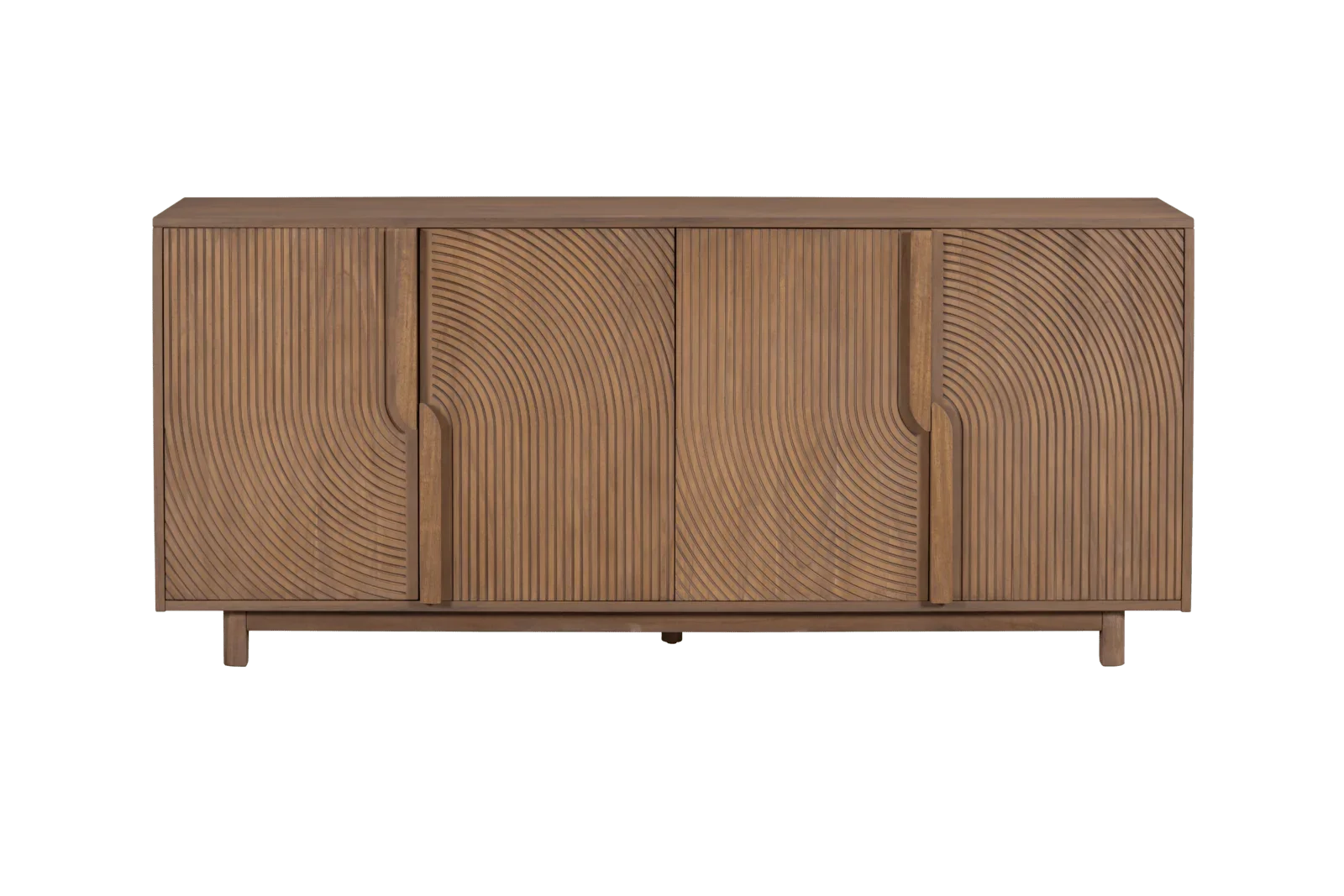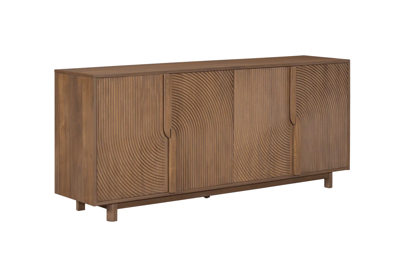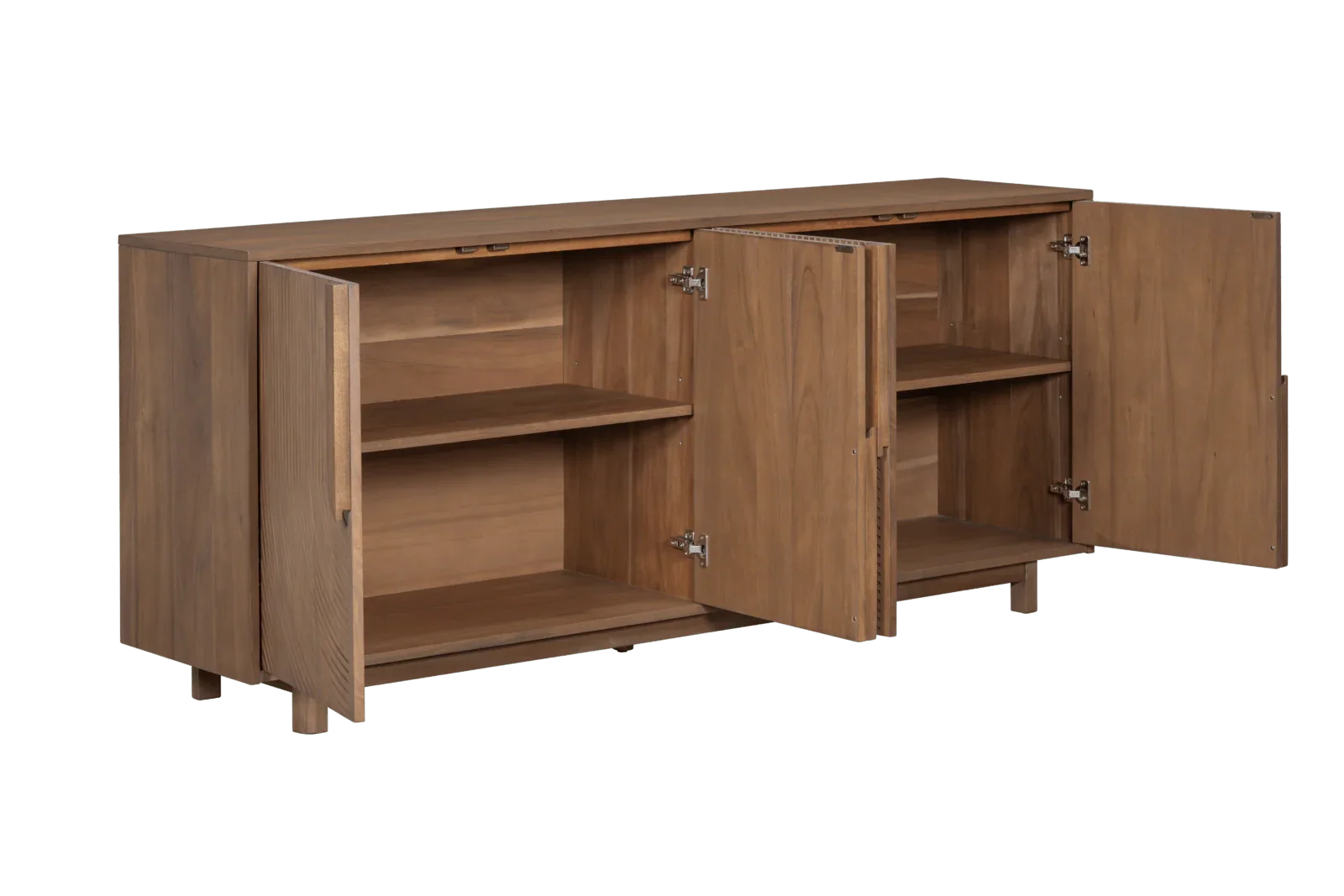 The Presidio sideboard offers a dynamic design, with a solid wood frame highlighted by a striking alternating carved pattern. Slim, framed legs enhance its elegant look. Inside, shelves and cutouts offer practical storage, while the captivating front design makes it hard to believe it's meant for storage at all.