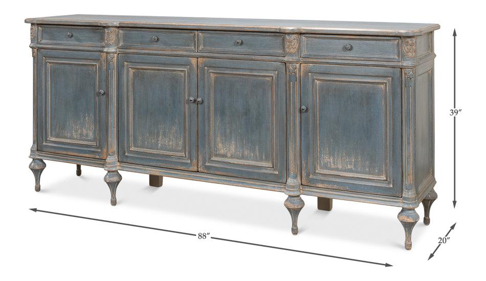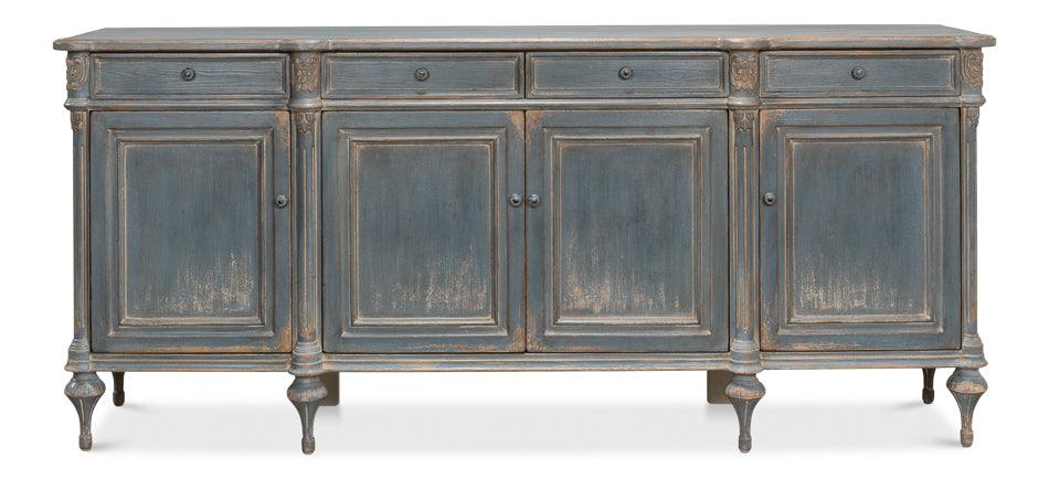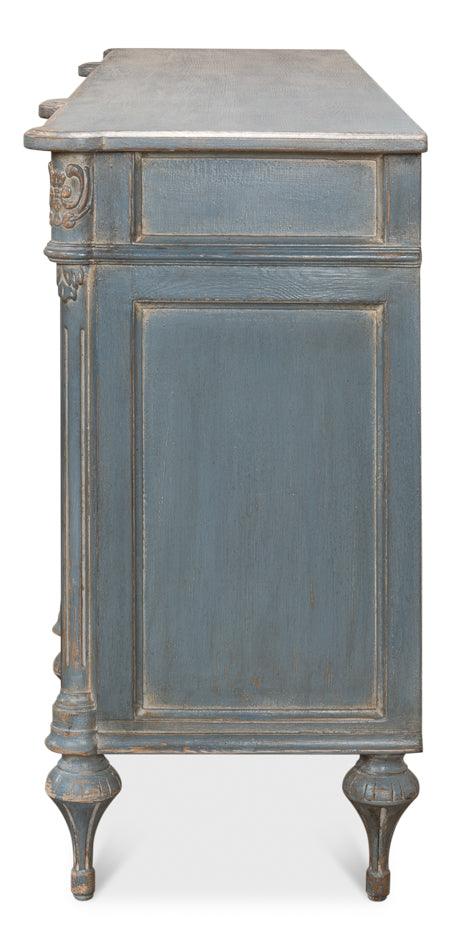 The Lilac Sideboard - Blue Finish, offered in a 4 Doors; 4 Drawers; 3 Rmvbl Shelves finish, reflects Sarreid's exacting standards in surface treatment — a detail that elevates the piece's visual presence well beyond what form alone might suggest.