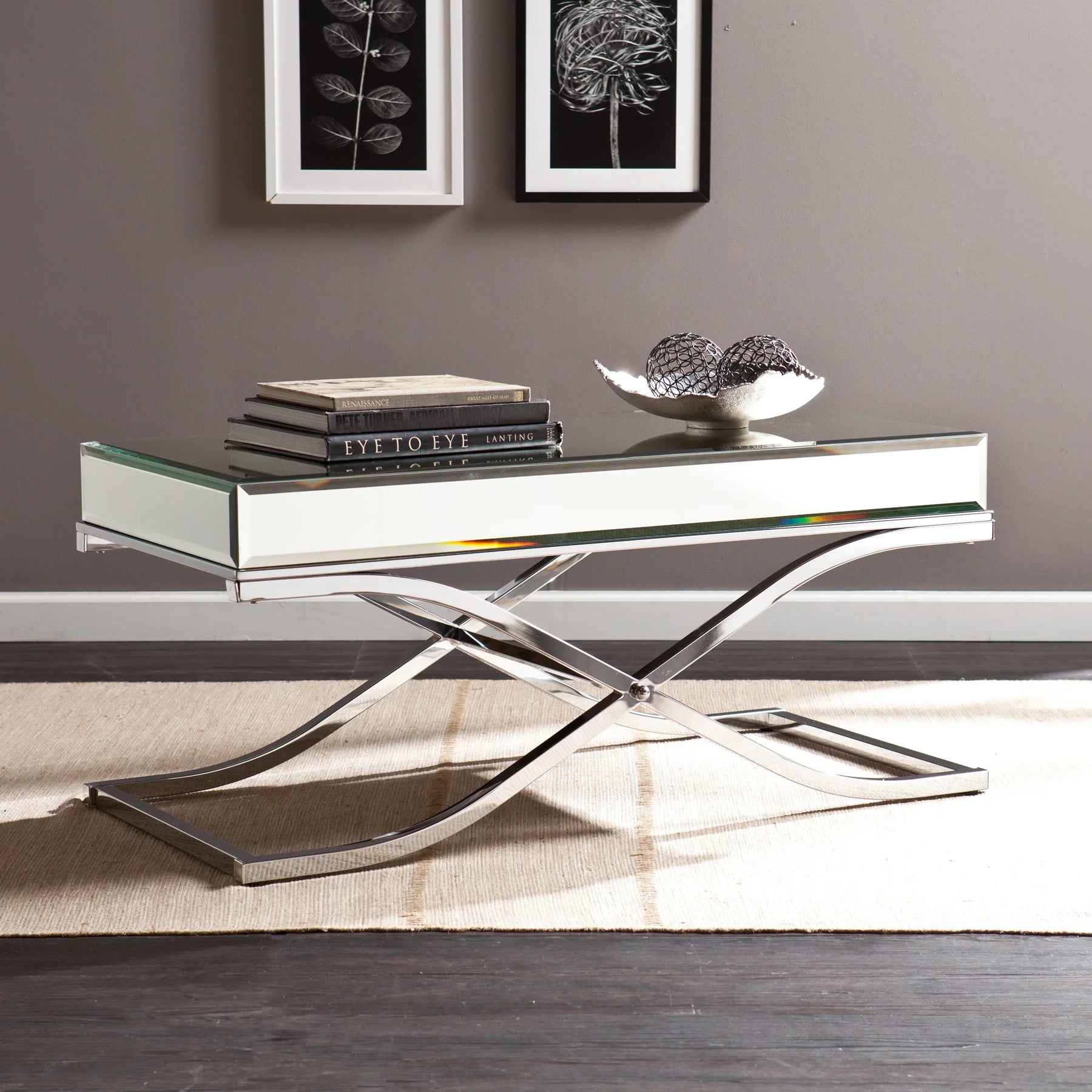 Position this mirrored cocktail table in your living room for a bewitching effect. An elegantly bowed metal x-frame forms an enticing shape with the multifaceted tabletop. Beveled mirrors and a reflective chrome finish accentuate the chic look. This captivating cocktail table adds instant glamour to contemporary styled homes.