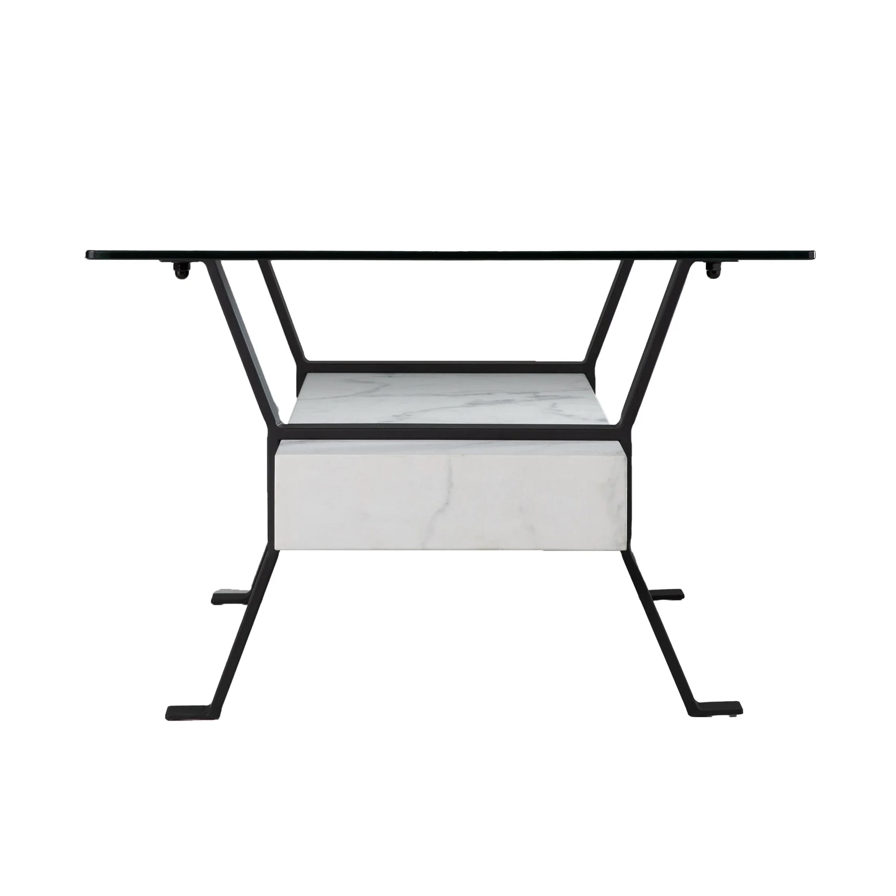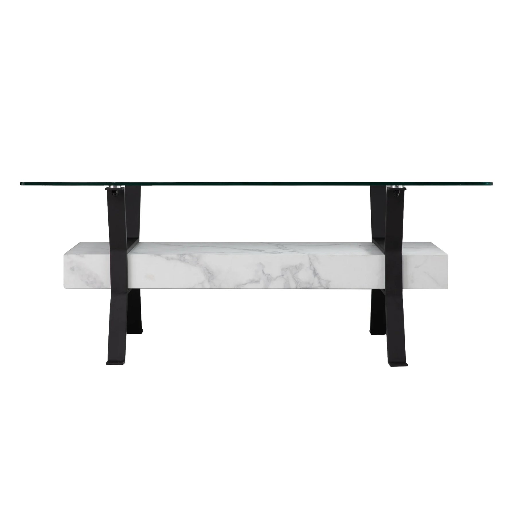 Contemporary style gets a modern attitude in this rectangular coffee table. A clear glass top and black metal frame create the perfect mix of modern materials. The faux marble shelf provides plenty of space to store magazines and remotes, keeping your tabletop clean and clutter-free. Add this unique coffee table to your living room or open concept space and watch the open, airy design add a touch of elegance. This glass-topped coffee table’s clean-lined silhouette lays a chic foundation for your home design.