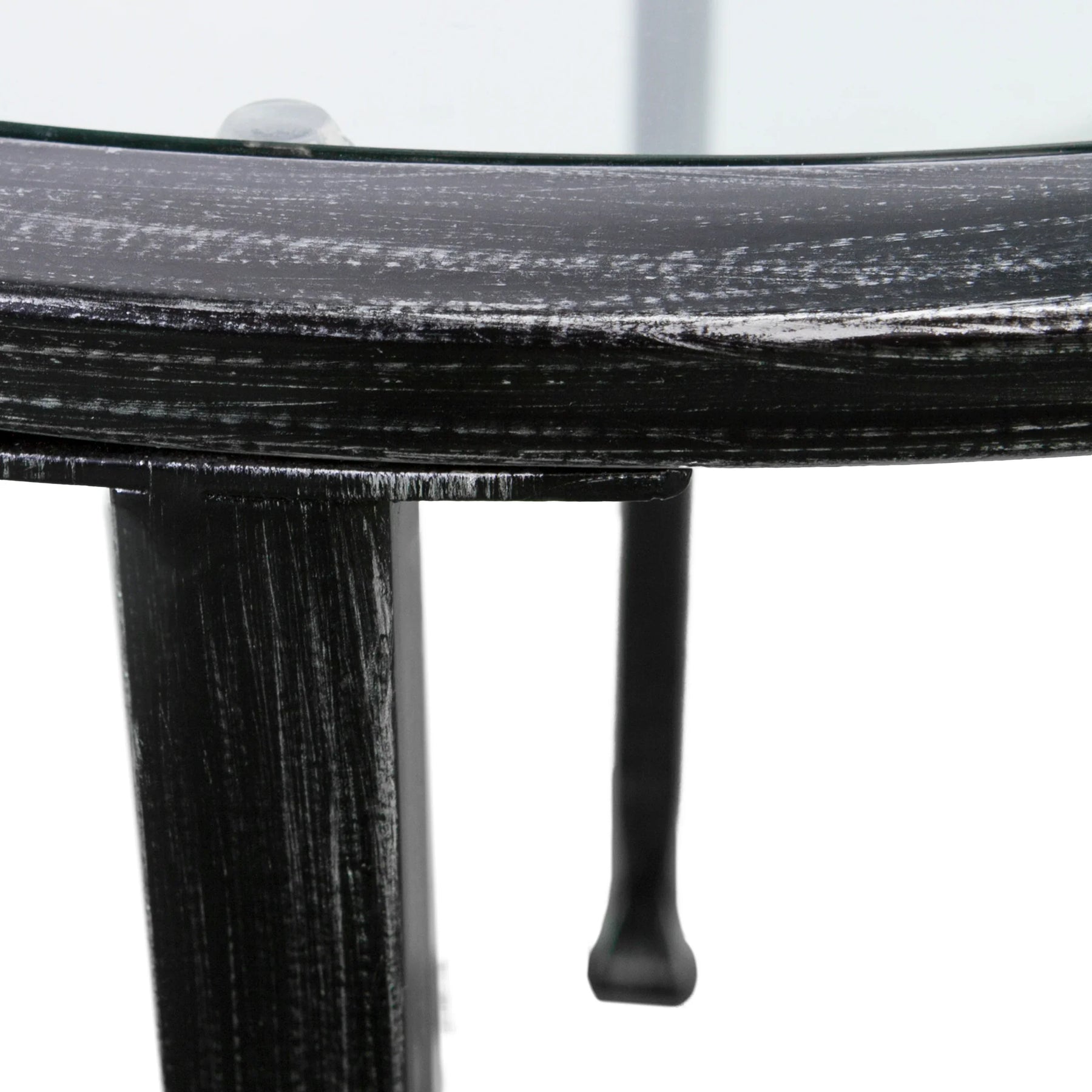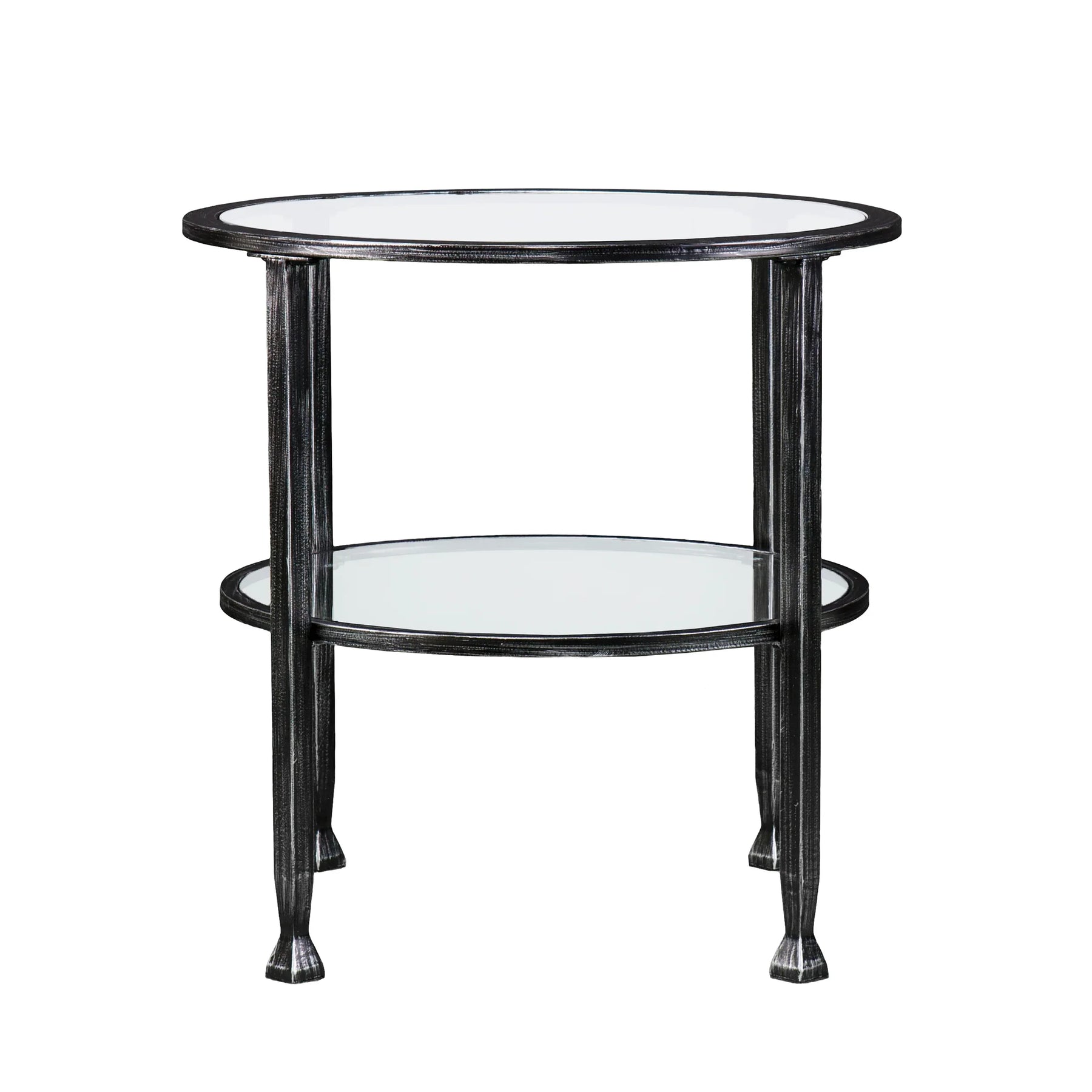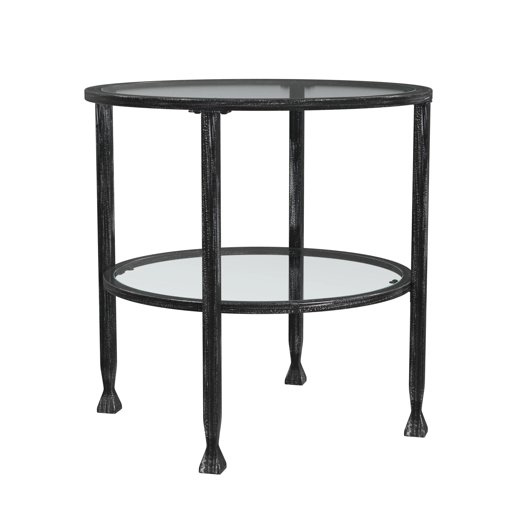 Step up your style game with this subtly elegant end table. Distressed black metal combines with tempered glass display surfaces to create a sophisticated and versatile design, perfect for showcasing your favorite books or mementos. Slide this glass-top side table between two chairs for a cozy conversation set in your small space, or add alongside your sofa and top with a lamp to bring function and style to your living room. No matter your design needs, this round end table upgrades your space.