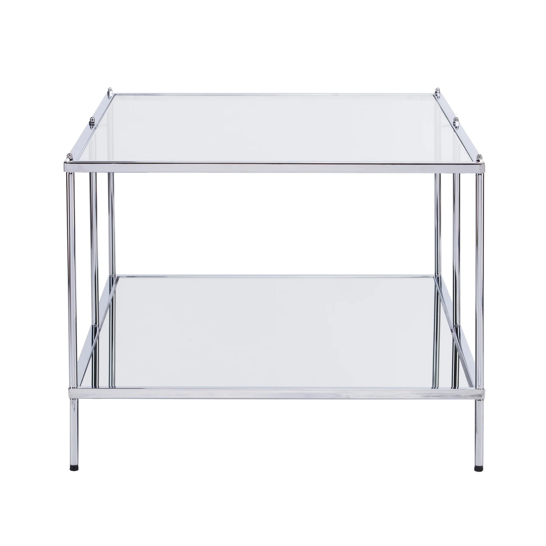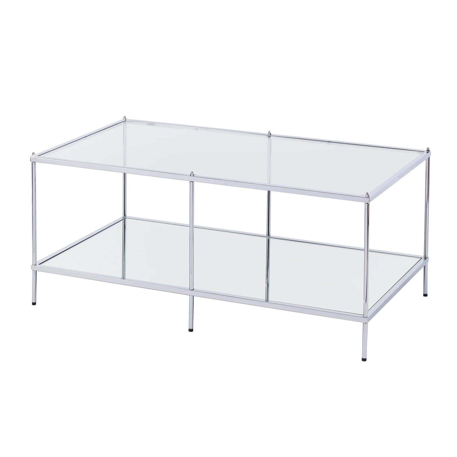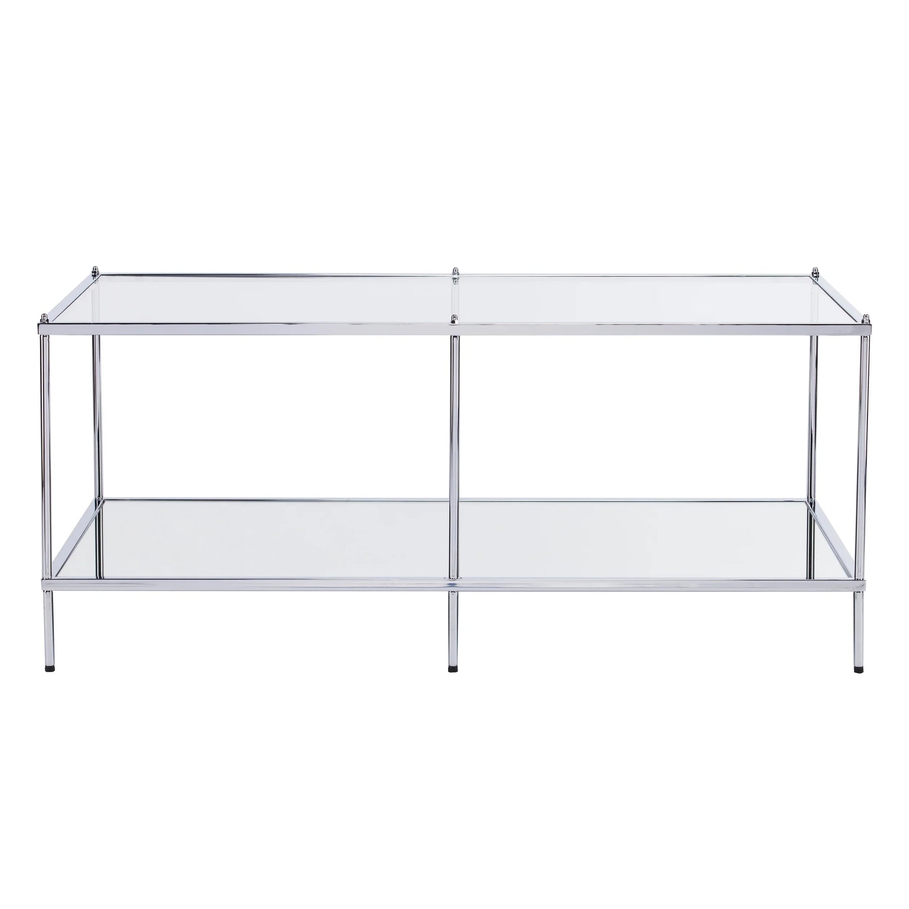 Create a glam world, all your own, with this chic cocktail table. Simple silhouette sets mixed materials composition in the spotlight. Sleek, shining chrome pairs with reflective mirror and glistening glass, crafting a vision of lustrous luxury. Shelve your clutter with the expansive mirrored shelf, and display your favorite fresh flowers and serving tray on the spacious glass tabletop. Conjure a dash of Hollywood elegance with this energizing cocktail table in the living room, den, or open concept space.