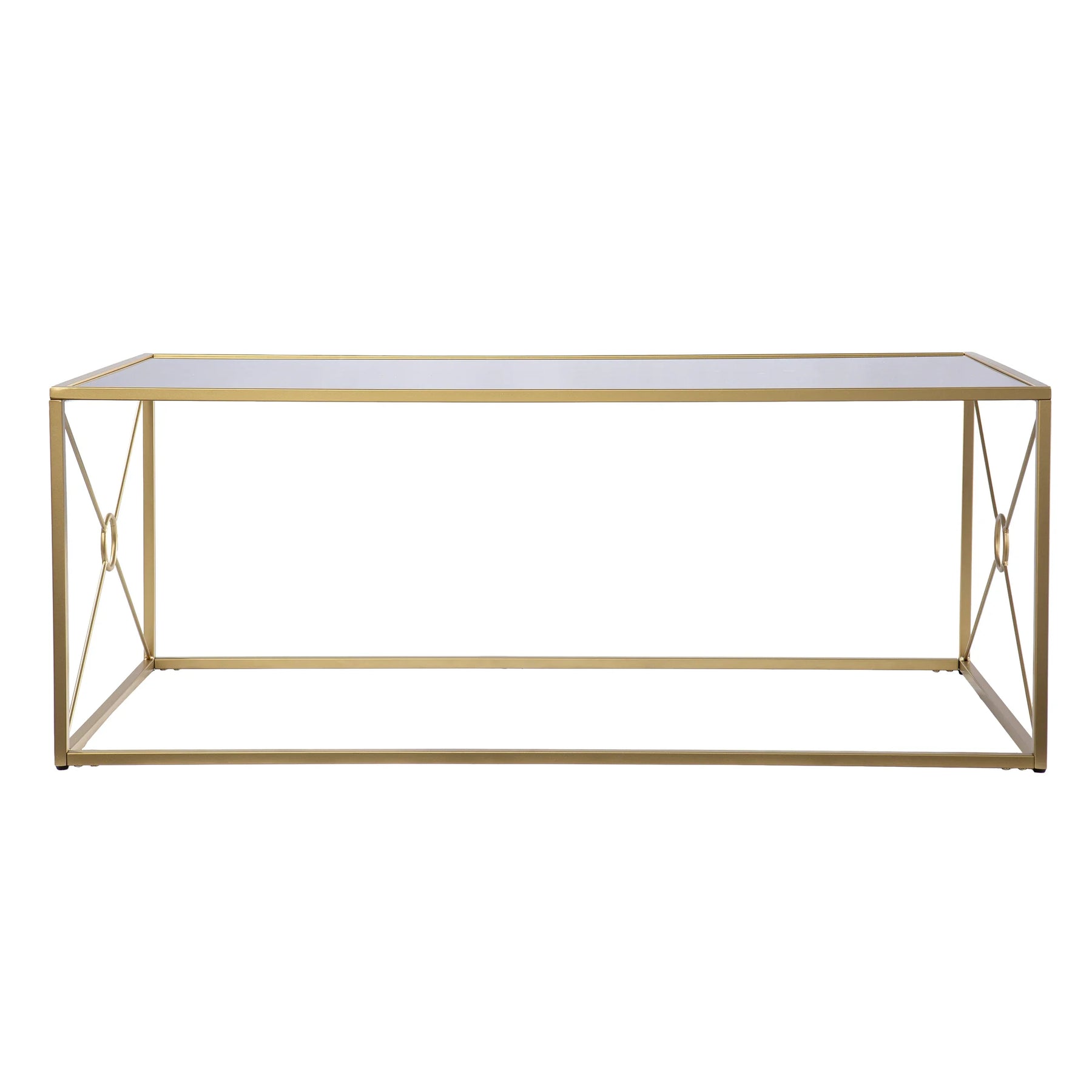 Dress up your living room with this transitional coffee table. An antiqued mirror tabletop crafts a classic look while the gold frame adds a modern touch to your living space. Slide this rectangular cocktail table into your open concept space for a hint of glam, or place in front of your sofa to serve up snacks and drinks. Reflect your unique style when you bring home this mirror-top cocktail table.