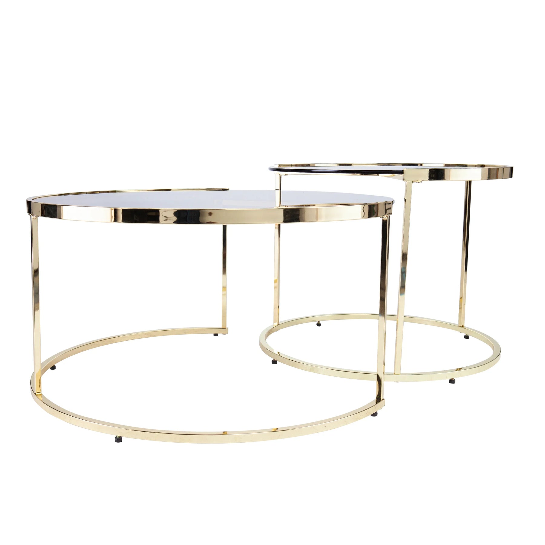 Stagger your style with these nesting accent tables. Brass metal finish and smoke gray glass combine to enhance your contemporary flair. Stack close together for a stair-stepped look, or separate for double the design. This pair of accent tables adds the finishing touch to your modern living space.