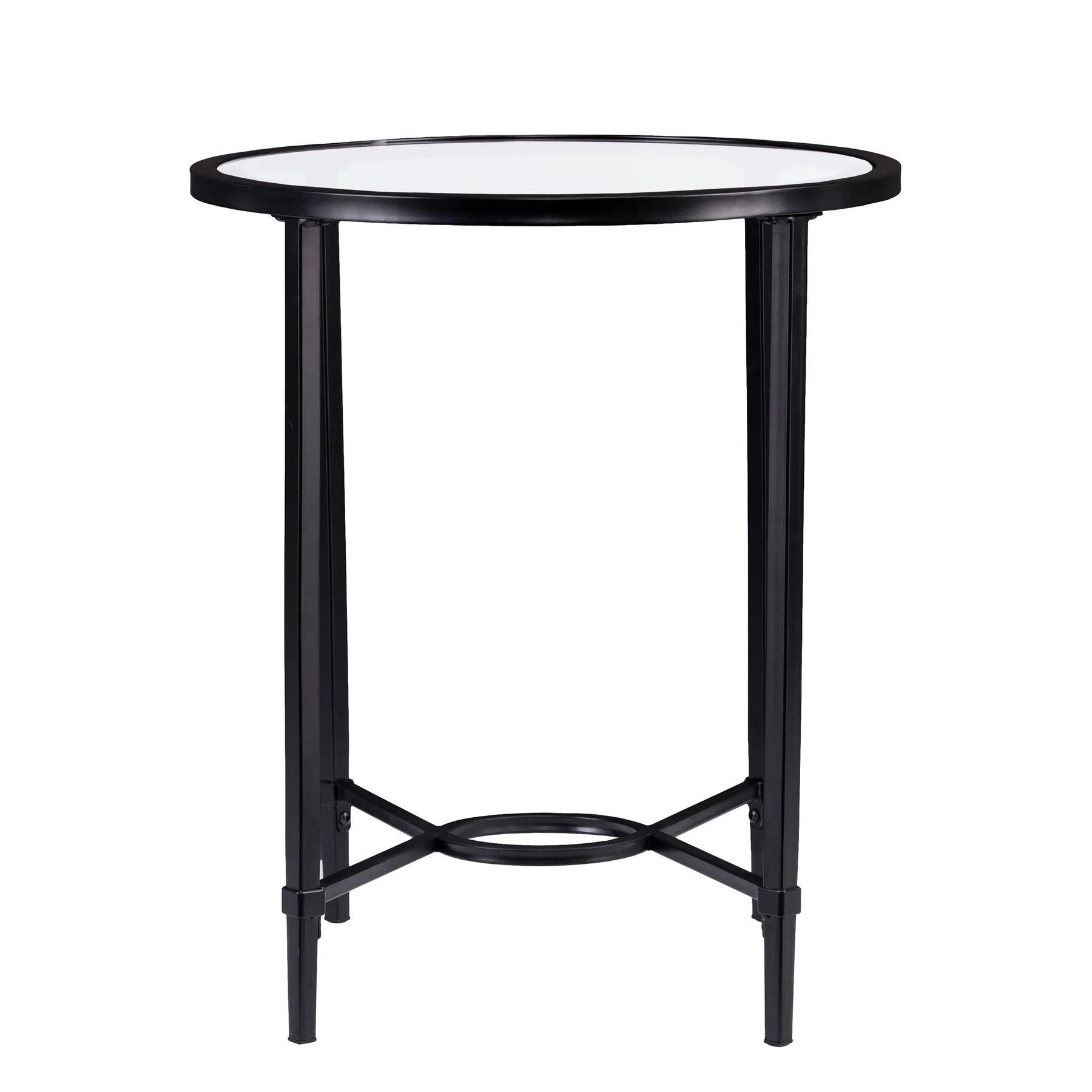Round up contemporary style with this oval side table. Elegant scrollwork upgrades a simple silhouette while crafting luscious curves. Wide-beveled tempered glass tabletop rests inside smooth black metal frame. Travel 'round the bend and find upgraded minimalism in this sophisticated accent table next to the sofa, betwixt two chairs, or bedside.