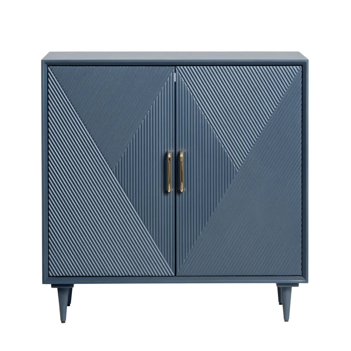 Introduce modern elegance to your space with this striking two-door cabinet, finished in a rich blue with a painted finish. Crafted from durable wood, it features an eye-catching geometric pattern on the doors, adding depth and texture. The polished brass handles enhance its luxurious aesthetic, while upgraded European hinges and magnetic closures ensure smooth functionality. Resting on tapered legs with floor levelers, this cabinet offers stability and style. Inside, a fixed interior shelf provides organized storage. Assembly is effortless simply attach the legs for a stylish and functional addition to any room