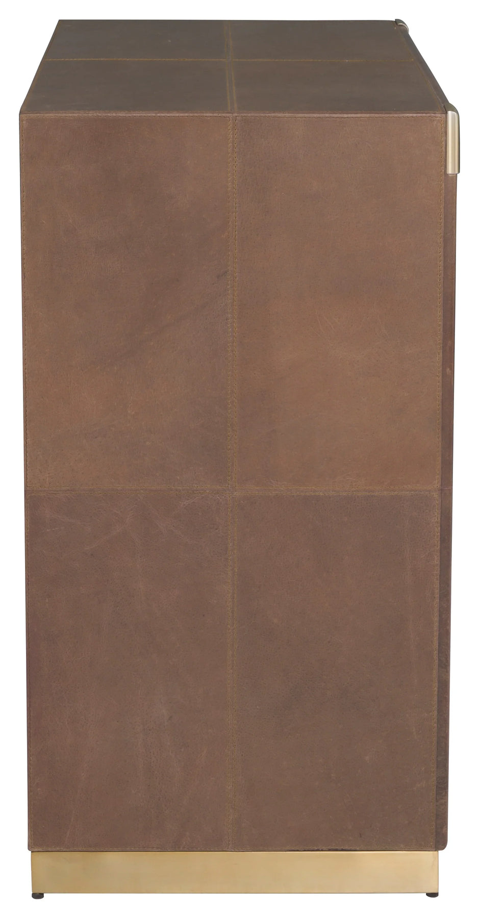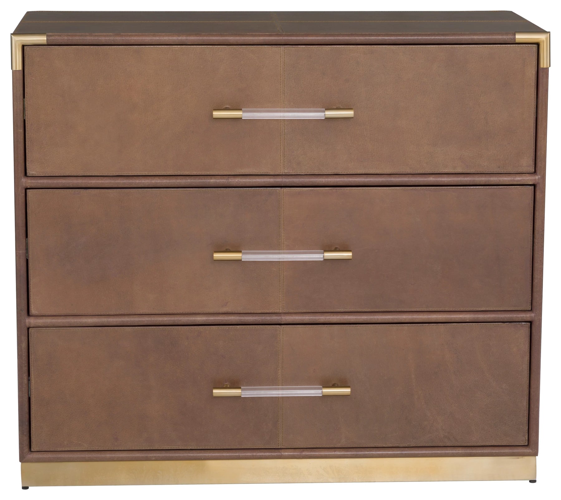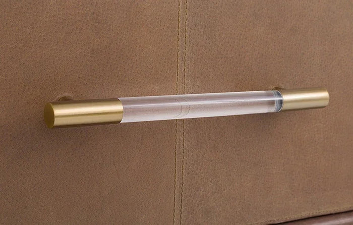 Leather Wrapped With Aged Gold Metal Plinth Base. Acrylic Drawer Pulls With Gold Metal Accents. Features Three Drawers. Ships With 1/4" Lay-On Glass Top.