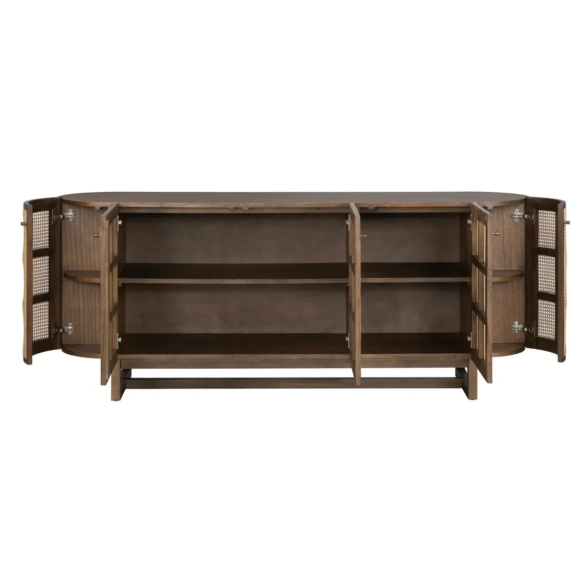 Enhance your living space with the 5-door media credenza/sideboard, a blend of rustic charm and modern elegance. Crafted from Mindi wood in a warm brown natural wood grain finish, it features 5 woven cane doors, each with upgraded European hinges and antique brass round knobs. Inside, 4 fixed shelves offer ample storage, while rounded edges add a soft touch. Cord management ensures a tidy setup. With adjustable levelers and arriving fully assembled, this piece is both beautiful and functional
