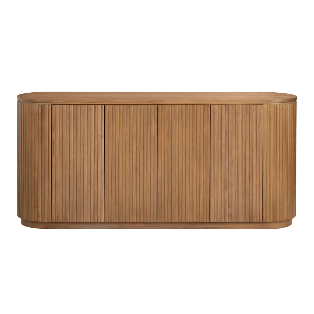 Crafted from rubberwood in a warm brown stained finish, this credenza combines function with contemporary elegance. Its oval shape is accentuated by a slatted wood design on the front and sides, creating a textural statement. Four doors with upgraded European hinges and push magnet closures reveal two fixed shelves for organized storage. The subtly curved base seamlessly integrates with the body, ensuring stability while maintaining a sleek, modern aesthetic. Just set up and ready to style
