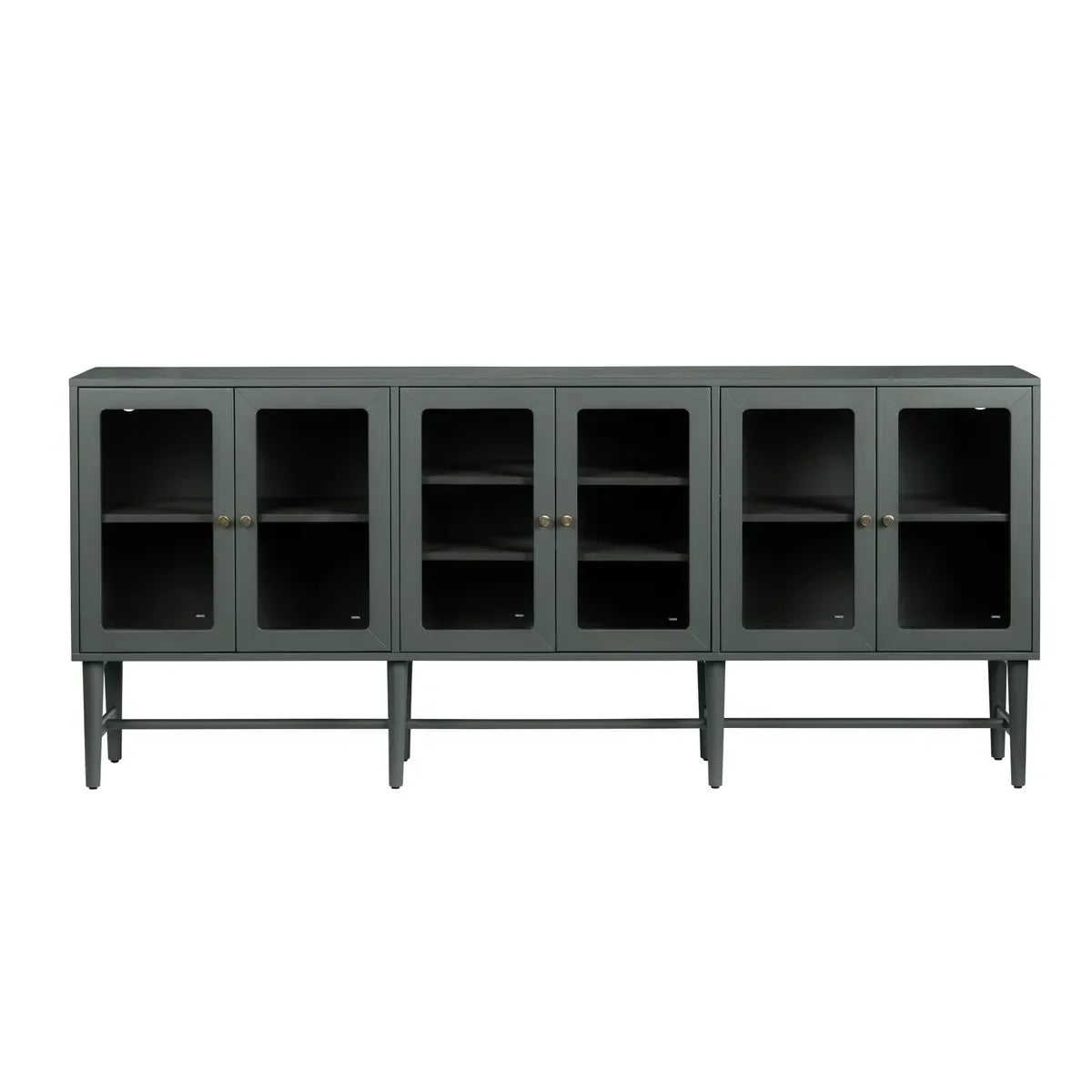 The Media Credenza in a sophisticated deep green with a charcoal undertone boasts a sleek rectangular silhouette and a painted finish. Its six tempered glass and wood doors, paired with upgraded European hinges, open to reveal three storage compartments and four fixed interior shelves. Brushed brass round knobs add a refined touch, while two cord management holes enhance functionality. Finished with a matching deep green back, it requires minimal assembly just attach the legs and enjoy its elegant design