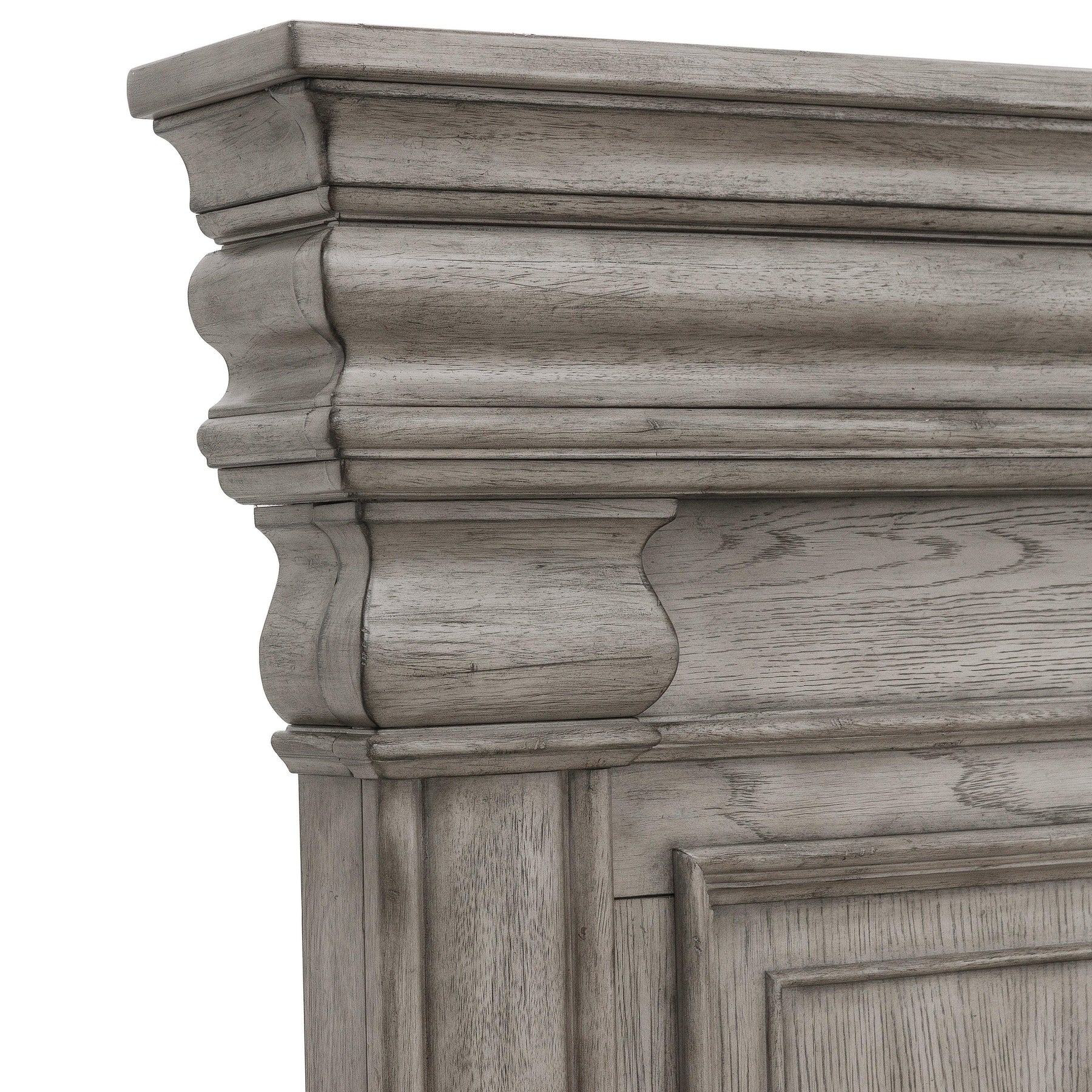 With a design drawn from an antique hearth and a cleverly-designed blanket chest footboard, this lovely bed will fill your bedroom with elegant warmth. The soft grey finish highlights subtle raised details in the flat cut oak veneers, culminating in the mantle-like top edge of both the headboard and footboard. At each corner, pillar designs contribute a grand impression to the finished bed, elevating the look of your favorite linens. The footboard features a dual-sided hinged top that opens away from the foot of the bed, revealing ample storage space for extra blankets, shoes, and any other personal belongings. Add a mattress and box spring - both required and sold separately - to complete the look of this bed and enjoy its antique spin on traditional style in your bedroom.