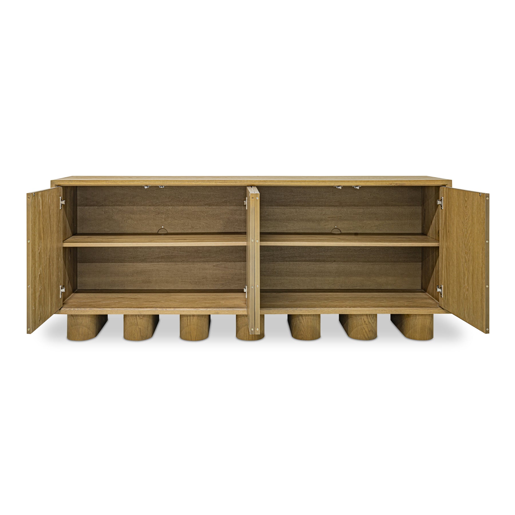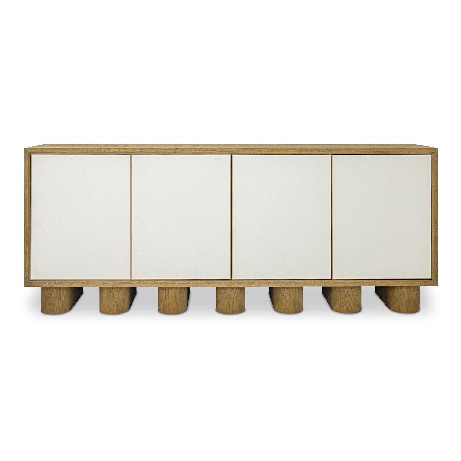 The Marcelle sideboard in black embodies minimalist elegance as playful, chunky legs enliven clean lines. Wire-brushed oak meets sleek black shagreen, framed by antique gold accents, creating a symphony of textures. Push-to-open doors reveal ample storage, while discreet media holes ensure seamless cable management.