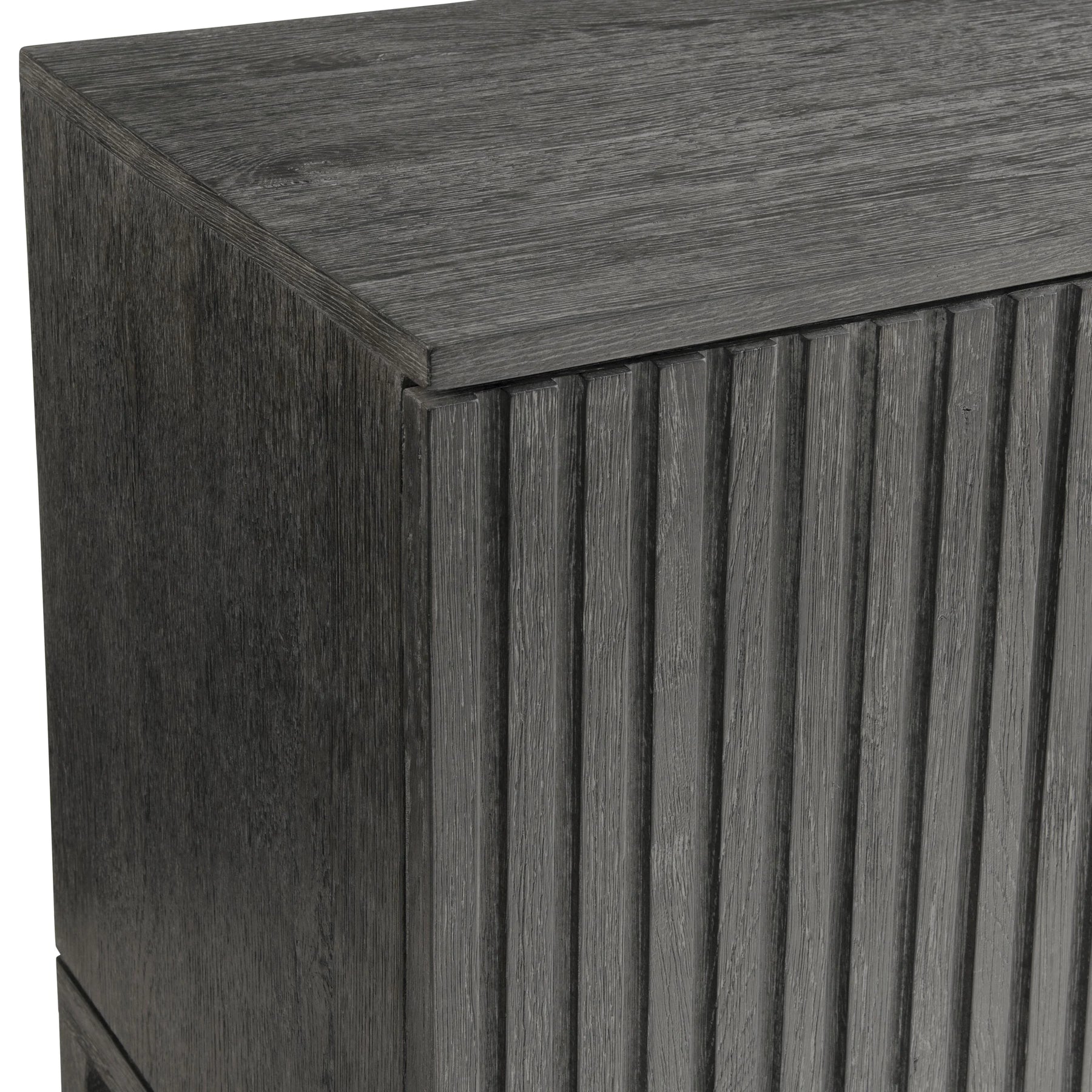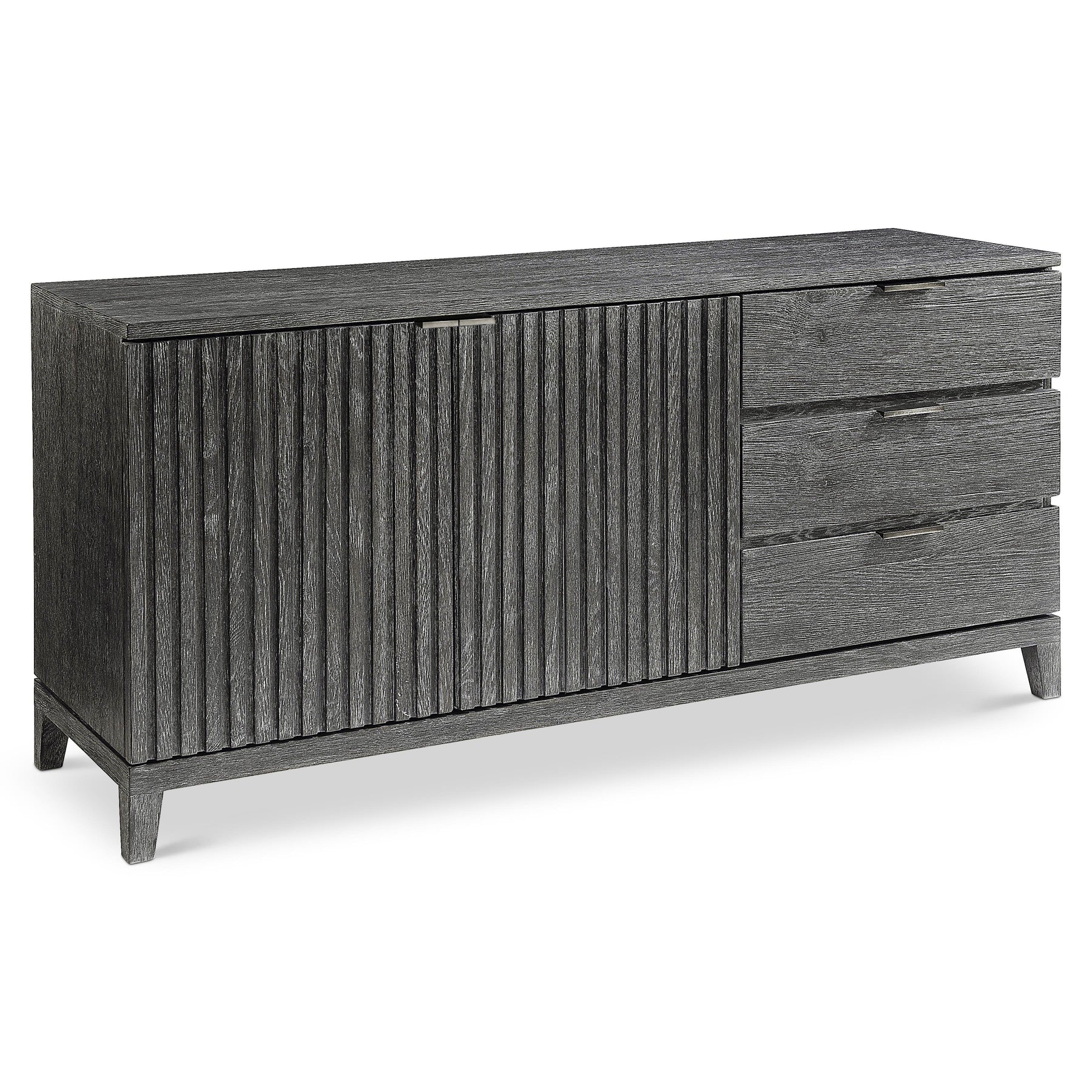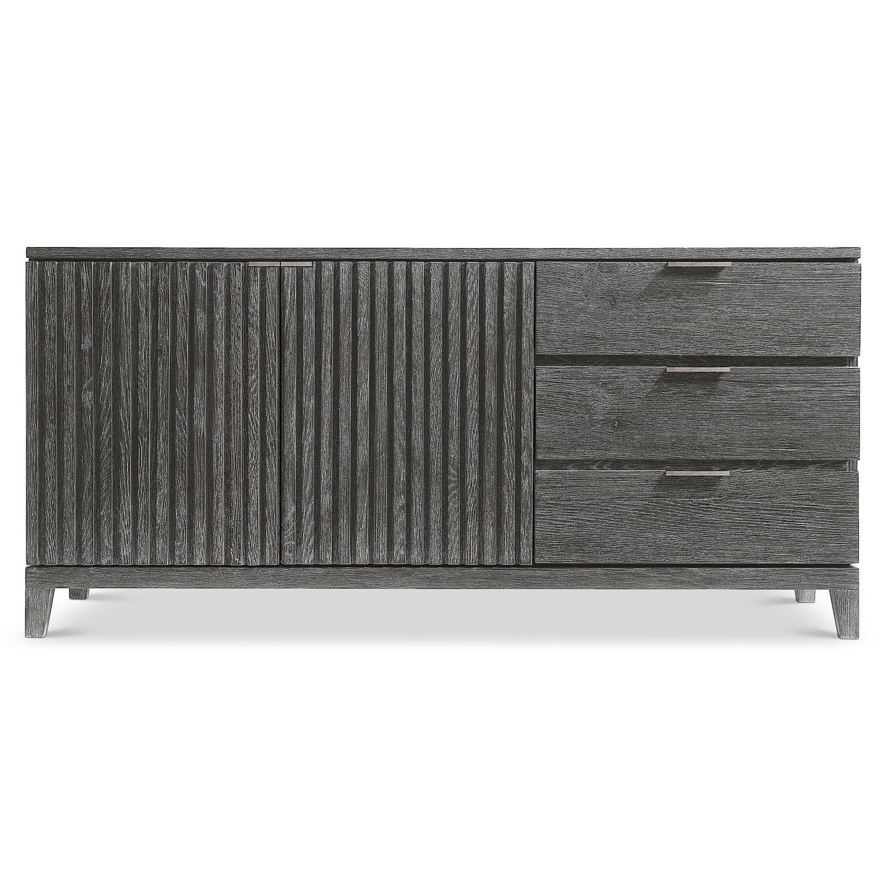 Rustic Oak Buffet In Sutton Finish. Two Push-To-Open Doors With Ribbed Design. Three Pull-To-Open Drawers With Cast Aluminum Tab Pulls In Dark Graphite Finish. Two Adjustable Shelves. Adjustable Glides.