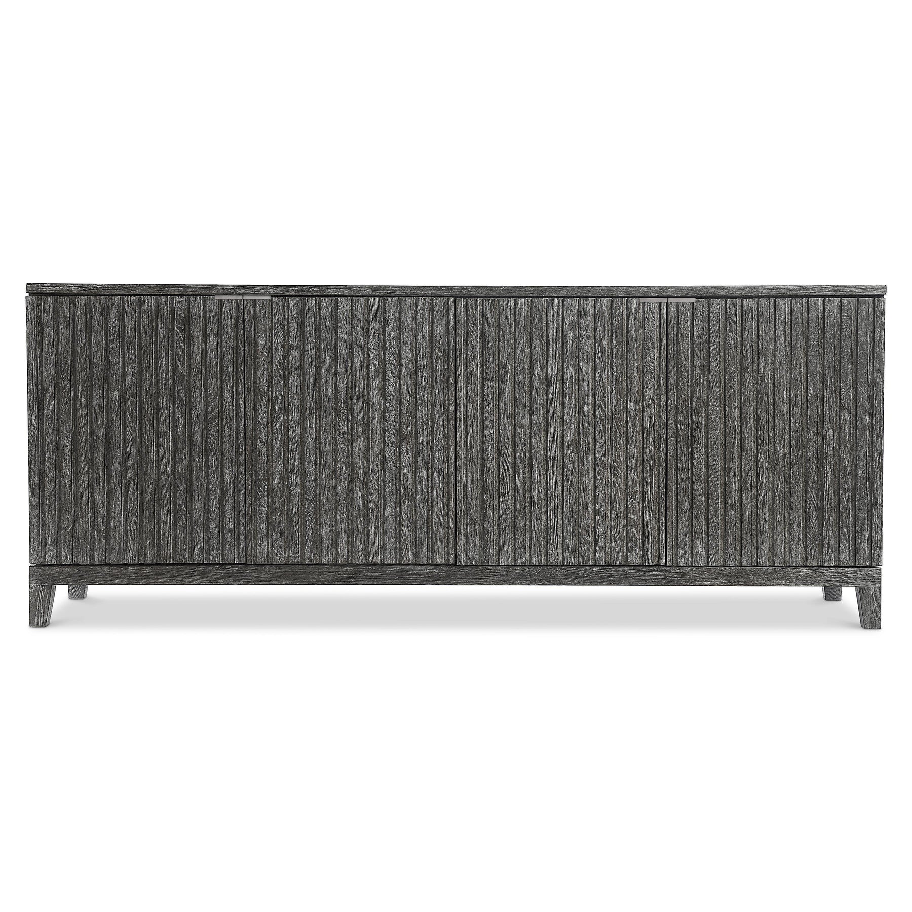 Rustic Oak Entertainment Credenza In Sutton Finish. Four Push-To-Open Doors With Ribbed Design. Six Adjustable Shelves. Grommets And Vents. Adjustable Glides.