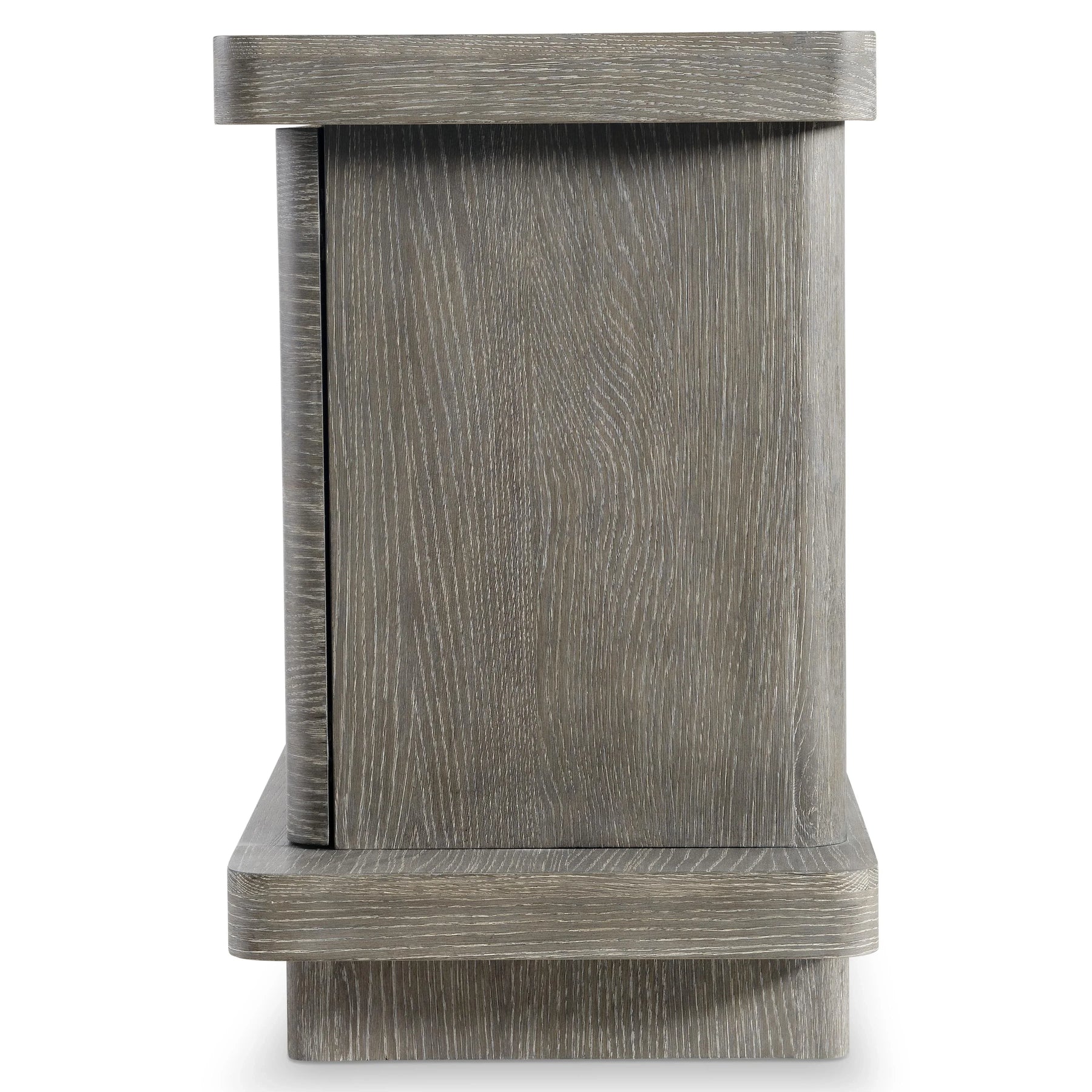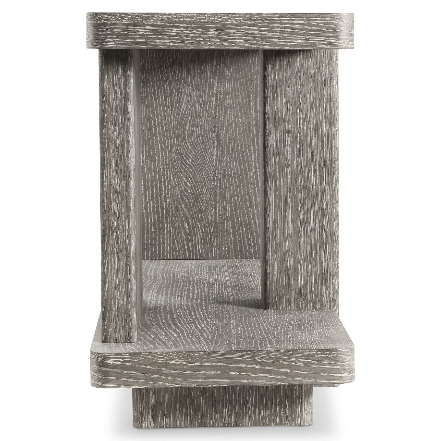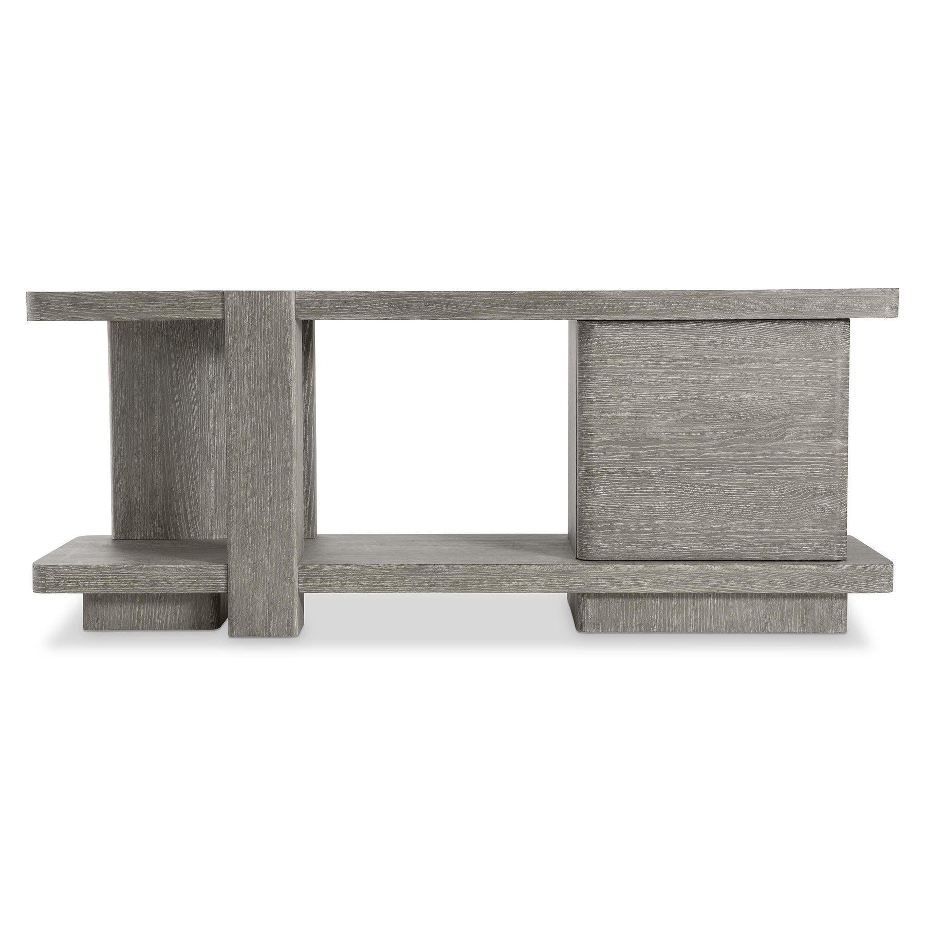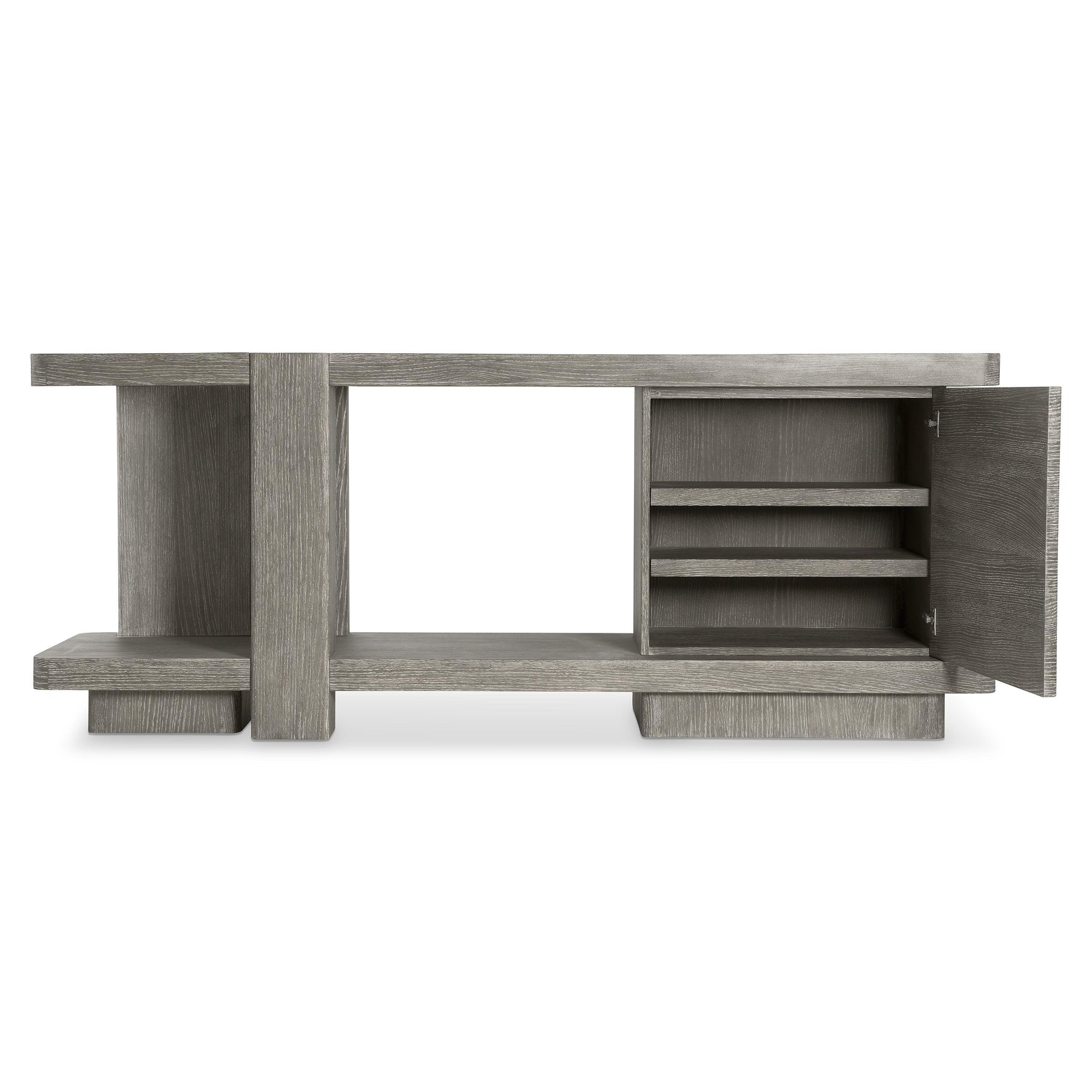 An Offset Vertical Post Pierces The Top Of The Monolith Entertainment Credenza, Giving It An Asymmetrical Style. A Second Back Panel Connects To A Plinth Base, While A Push-To-Open Door On The Right Reveals Adjustable Shelves. The Wirebrushed Wood Highlights The Natural Grain In Puma Finish.