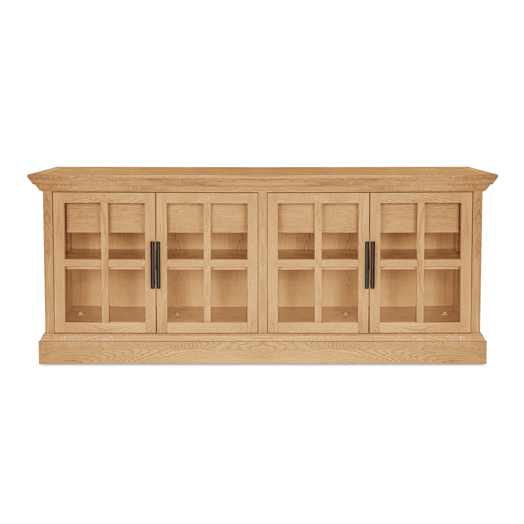 Meticulously crafted from solid oak and oak veneer, the Raymond sideboard's wire-brushed natural finish exudes warmth and texture. The glass front, adorned with traditional molding and a graceful overhang, adds elegance with a contemporary twist. Four drawers and discreet cable management provide practical storage solutions.