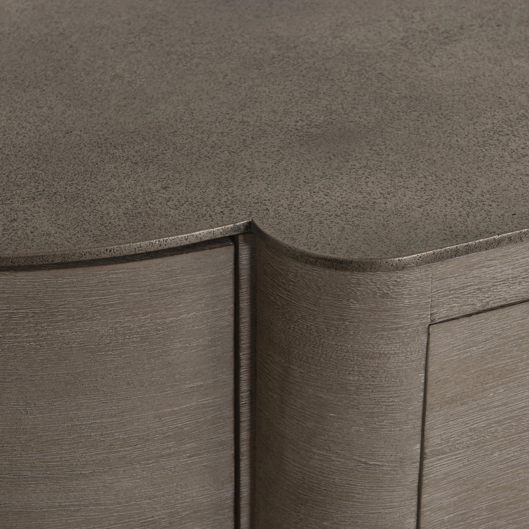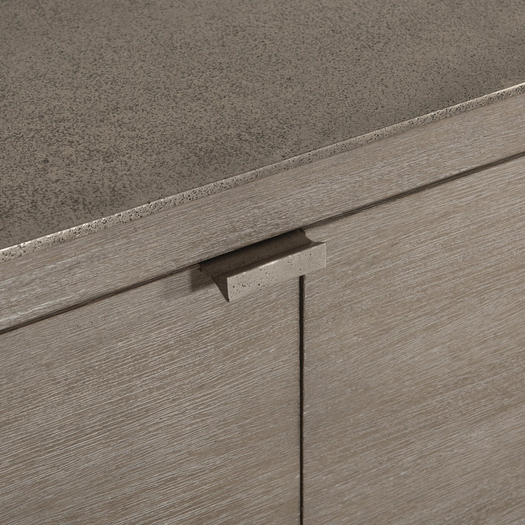 Mahogany Buffet In Forry Finish With Graphite Finished Cast Aluminum Top. Two Outer Push-To-Open, Soft-Close Doors. Two Interior Pull-To-Open Doors With Cast Aluminum Tab Pulls In Graphite Finish. One Pull-To-Open Drawer. Six Adjsutable Shelves. Adjustable Glides.
