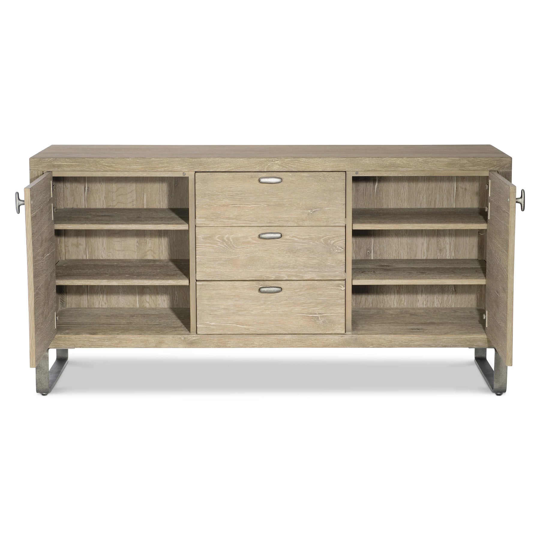Wirebrushed Oak Buffet In Aurum Finish With Two Pull-To-Open, Soft-Close Doors. Three Pull-To-Open, Soft-Close Drawers With One Silver Insert And Two Wrapped Pads. Adjustable Shelves. Applied Texture Steel Sled Base In Barlow Finish. Adjustable Glides.
