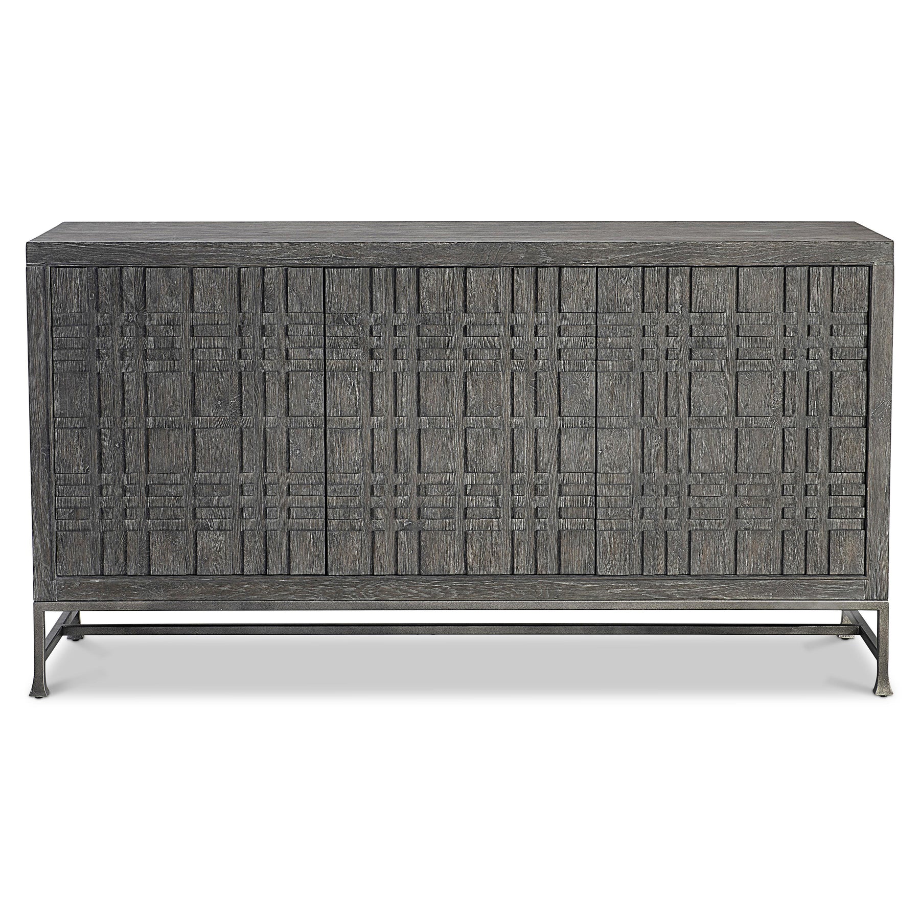 Wirebrushed Oak Buffet In Tadon Finish With Three Raised Geometrics Pattern Push-To-Open, Soft-Close Doors. Two Pull-To-Open, Soft-Close Drawers With Guardian Cloth And Silver Insert. Three Covered Grommets And Vents. Adjustable Shelves. Applied Texture Steel Base In Barlow Finish. Adjustable Glides.