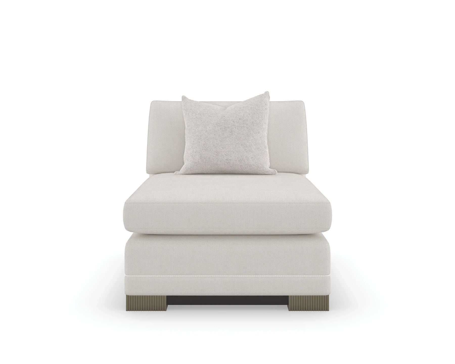 With a classic shelter style, this three-piece modular sectional brings the perfect mix of lounge-like comfort and everyday luxury. Crisp tailoring and braided leather welt artfully accentuate the clean modern lines of each piece, dressed in a softly textured chenille performance fabric that’s easy to keep clean. Fluted legs in Silver Shadow paint add a hint of shimmer and dramatic contrast to its Dark Chocolate wood base. Create a custom seating area by choosing the number of pieces to suit your space and taste.