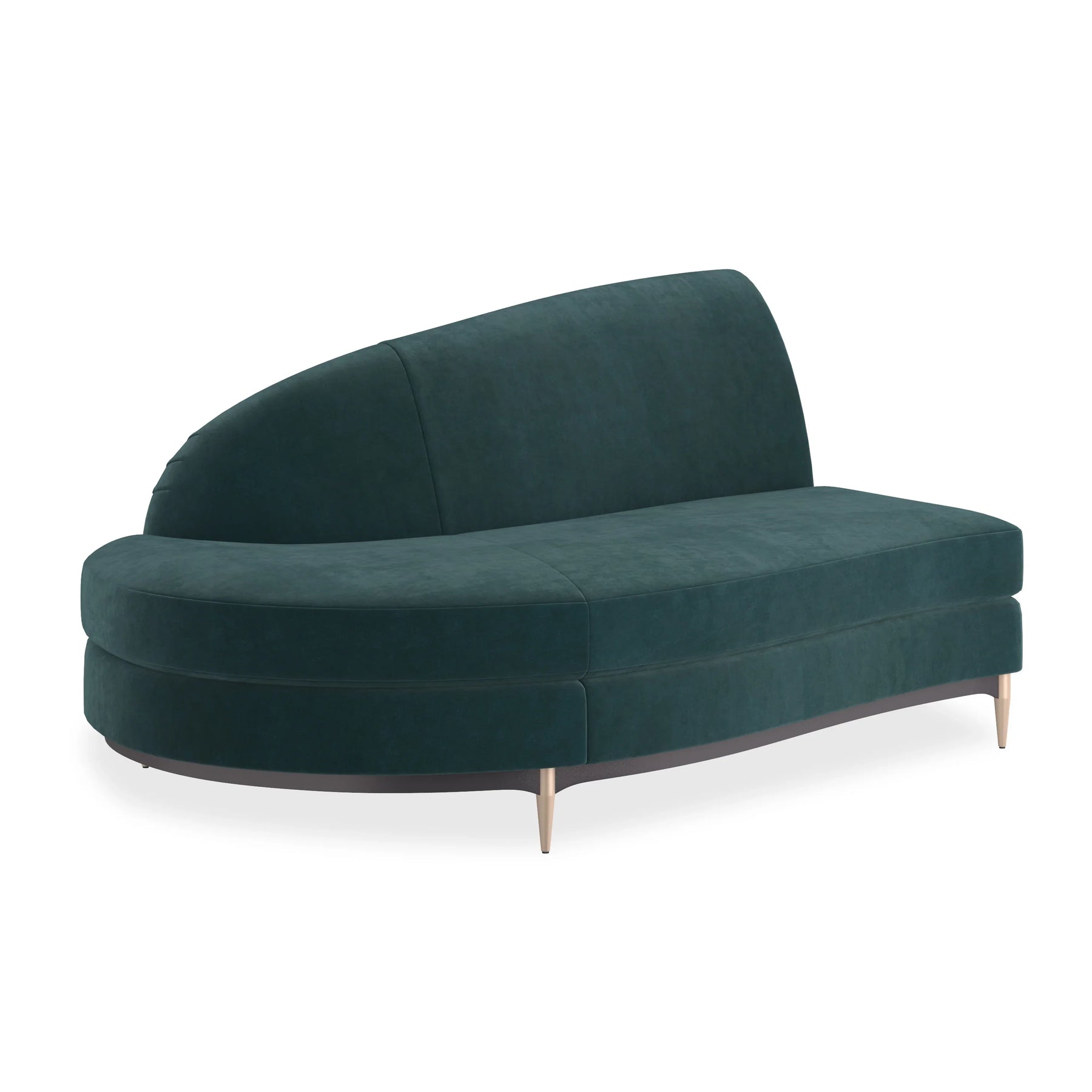 This regal sectional makes a dramatic showpiece that emanates glamour. Upholstered in velvet, its curved profile is complemented by sumptuous comfort. Its lower edge and outer arms are trimmed in Almost Black while its metal tapered feet are finished in Champagne Gold. Artful from edge to edge, this statement piece creates drama wherever it goes.