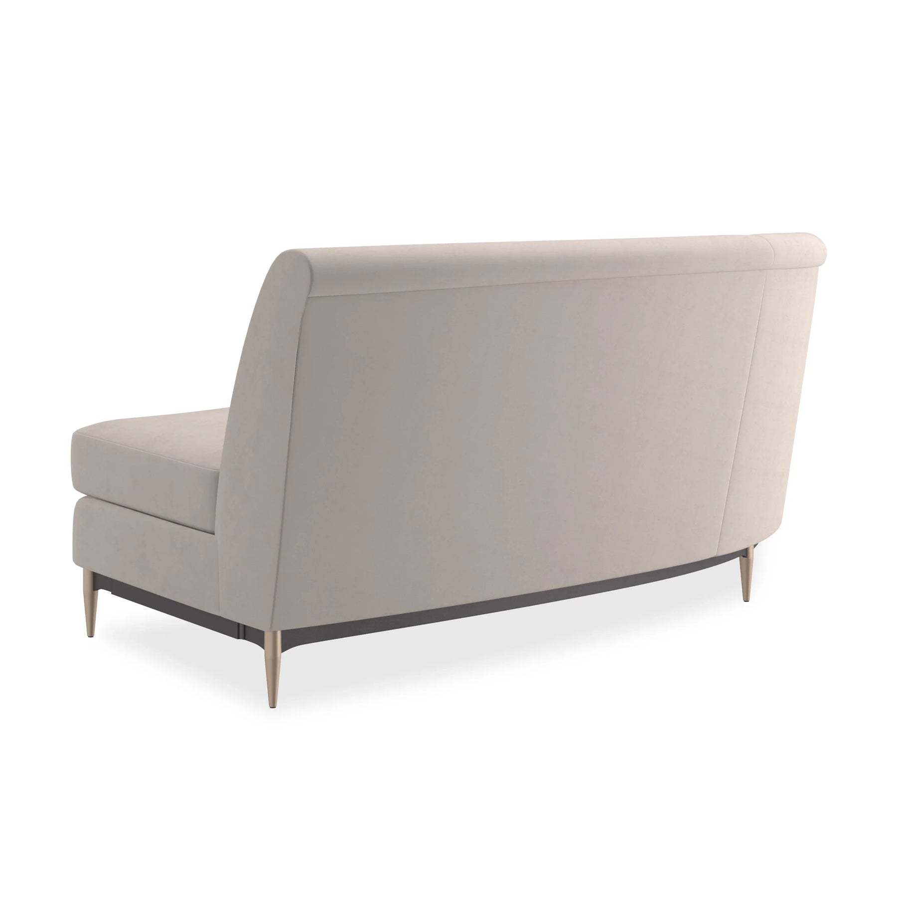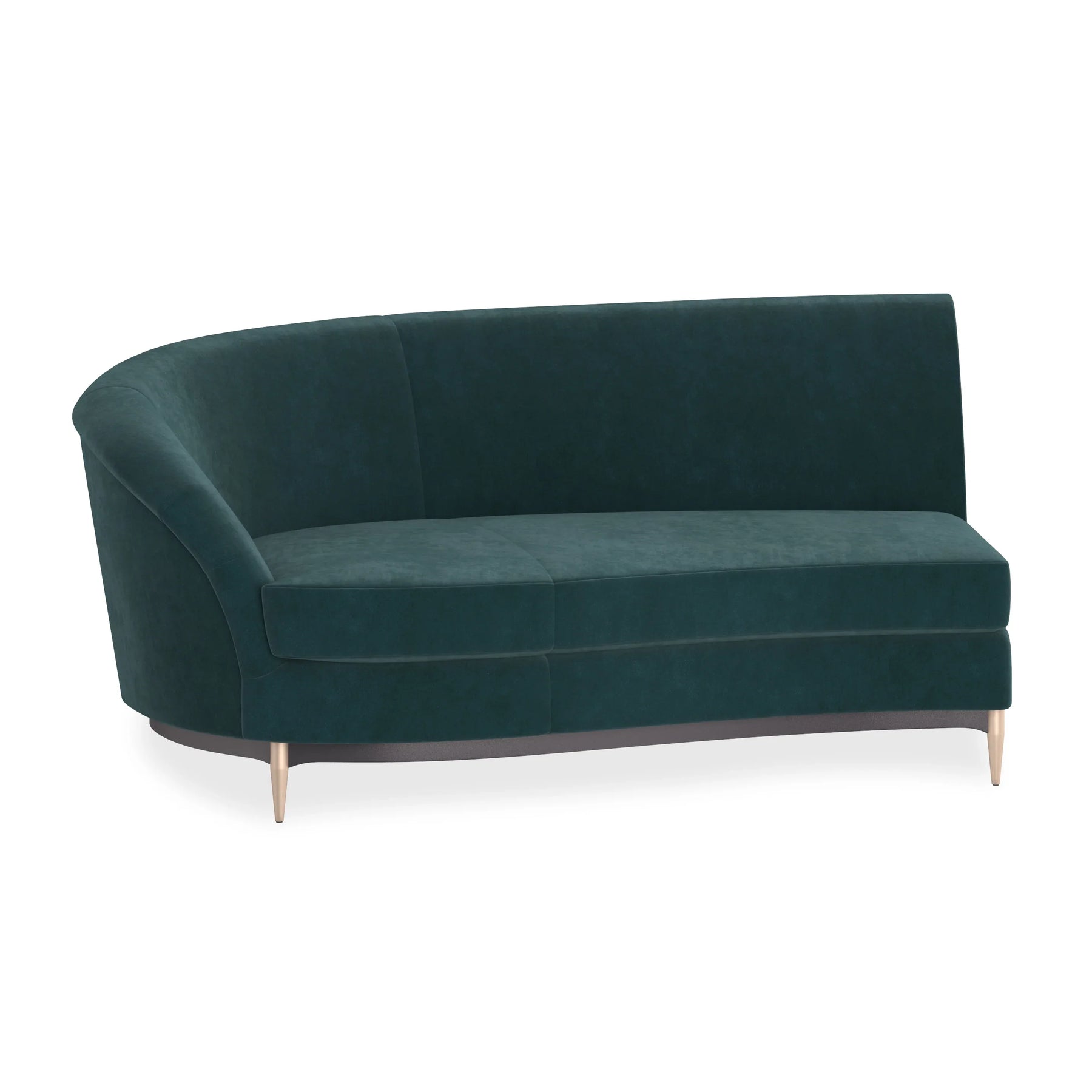 This regal sectional makes a dramatic showpiece that emanates glamour. Upholstered in velvet, its curved profile is complemented by sumptuous comfort. Its lower edge and outer arms are trimmed in Almost Black while its metal tapered feet are finished in Champagne Gold. Artful from edge to edge, this statement piece creates drama wherever it goes.