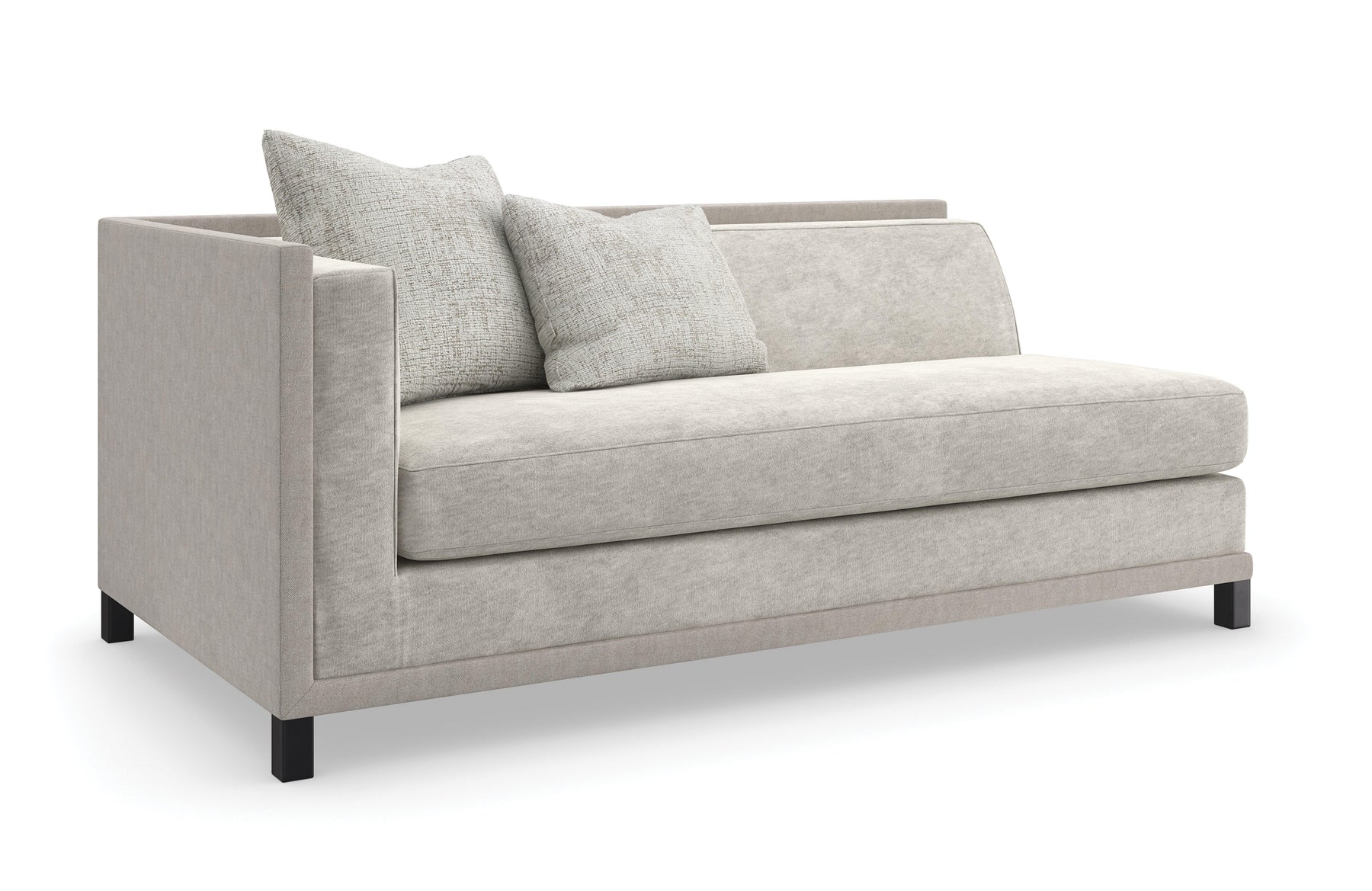 A fashionable component of our classic shelter arm sectional, with clean lines and crisp tailoring in a fresh neutral colorway. Impeccably dressed, its sophisticated silhouette is punctuated by a faux mohair opal fabric on the inside, and a textured woven wrapping the back. Metal legs in brushed deep bronze add warmth and a dashing finish, complemented by accentuating toss pillows in a tactile tonal mix.