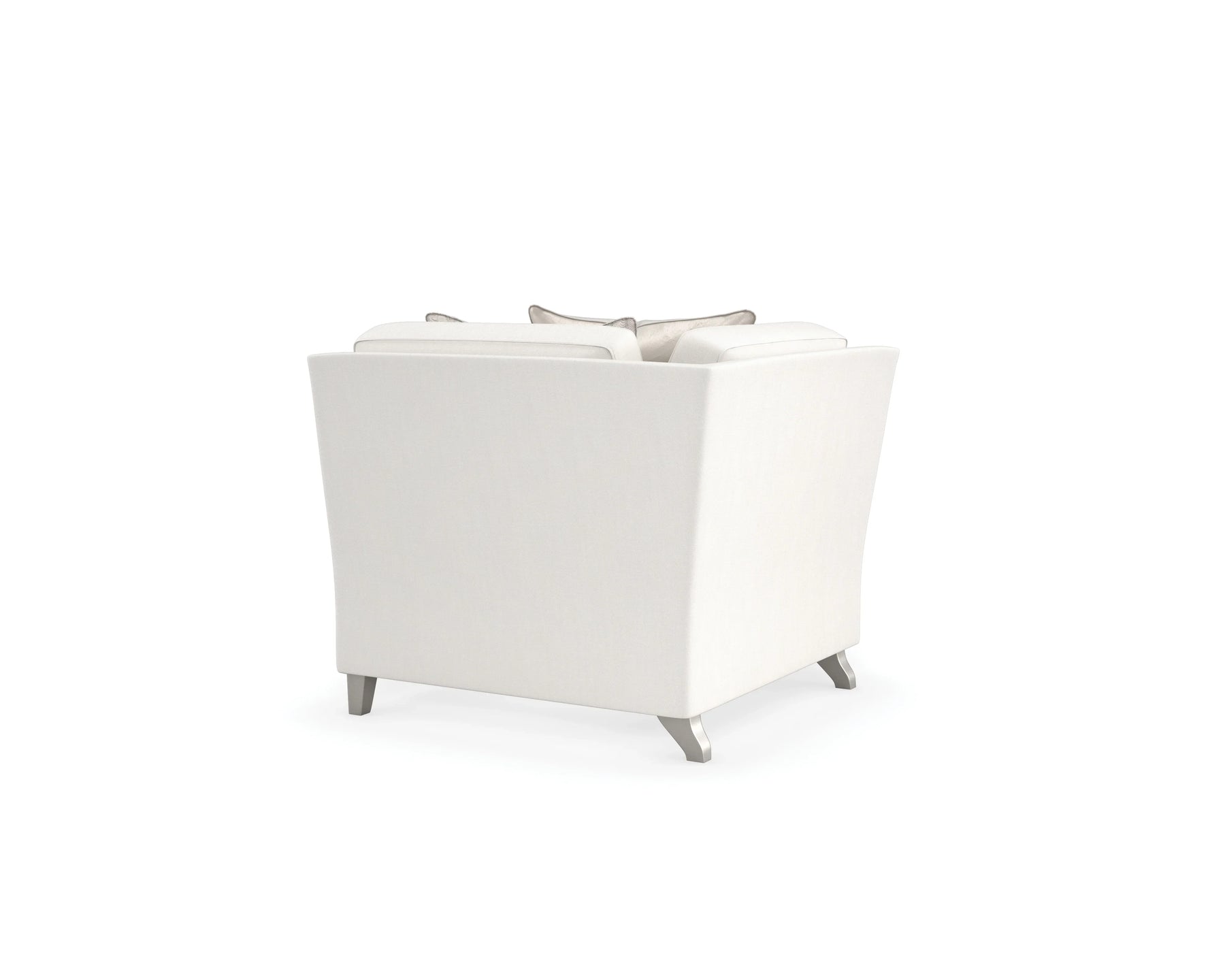 Inspire sparkling conversation and moments of reflection with this shapely sectional, upholstered in a cream performance basketweave with a subtle luster. A fresh, yet familiar addition to living room interiors, its gently sloping arms lend a contemporary take on the classic English arm, complemented by tapered legs in a Sparkling Argent finish. Accent pillows add shimmer and tactile appeal in a botanical leaf print and gold-toned satin. Sofa and chair also available.