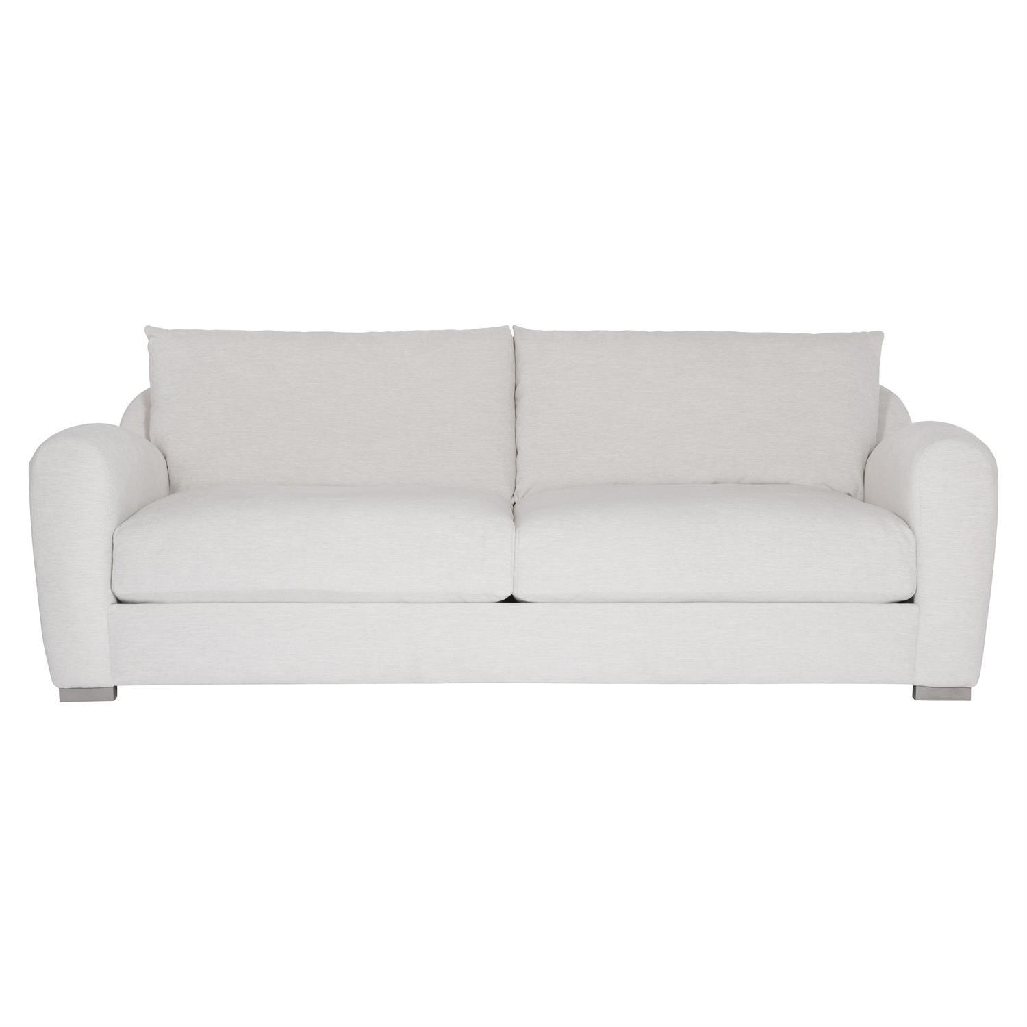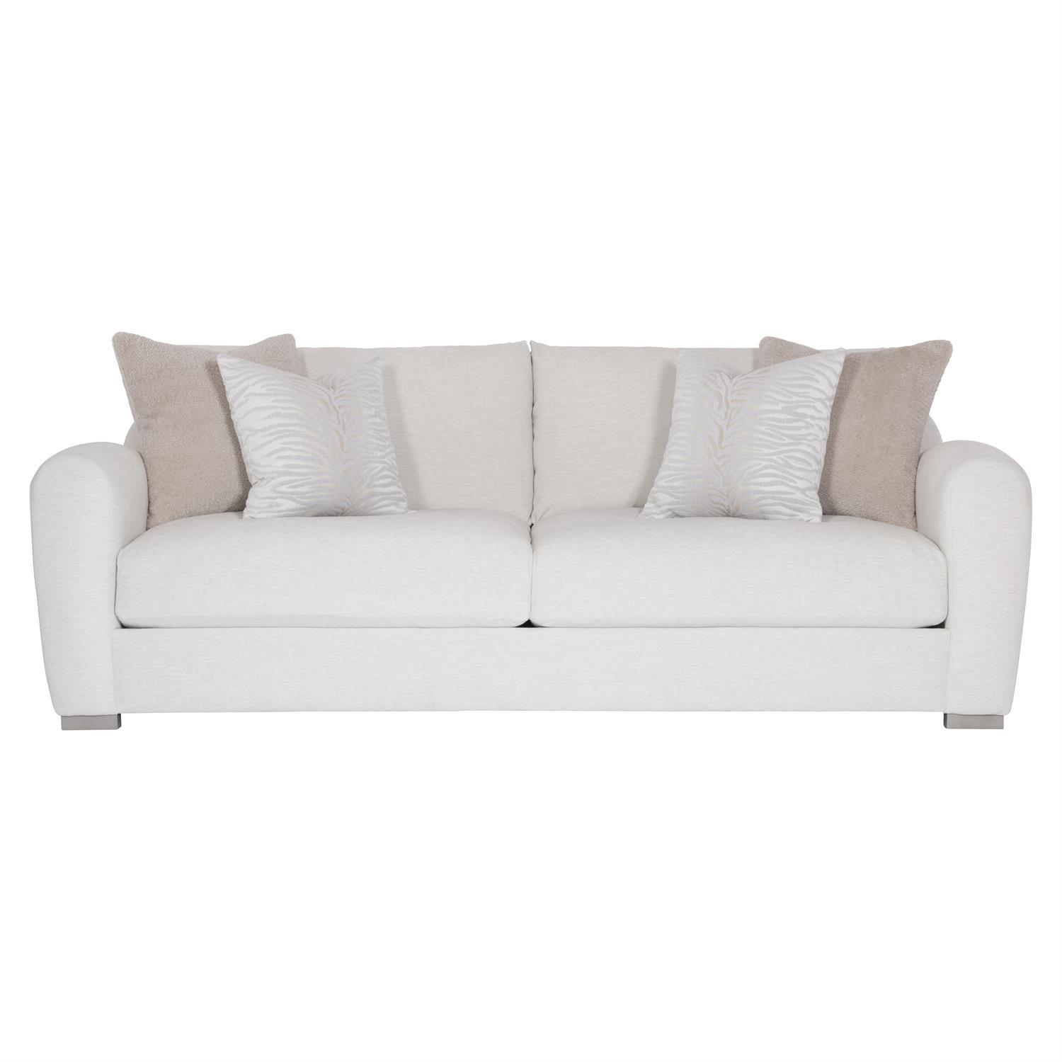 The construction of this piece reflects Bernhardt's uncompromising standards at every stage of manufacture. The asher sofa has a unique frame with high-loft curved arms and a shaped back, comfort comes from fiber back pillows, as well as four blendown throw pillows, and the enticing shape and deep seat creates a luxuriously restful statement. The cumulative effect of these construction choices is furniture that will maintain its beauty, structural integrity, and functional precision through years of daily use.